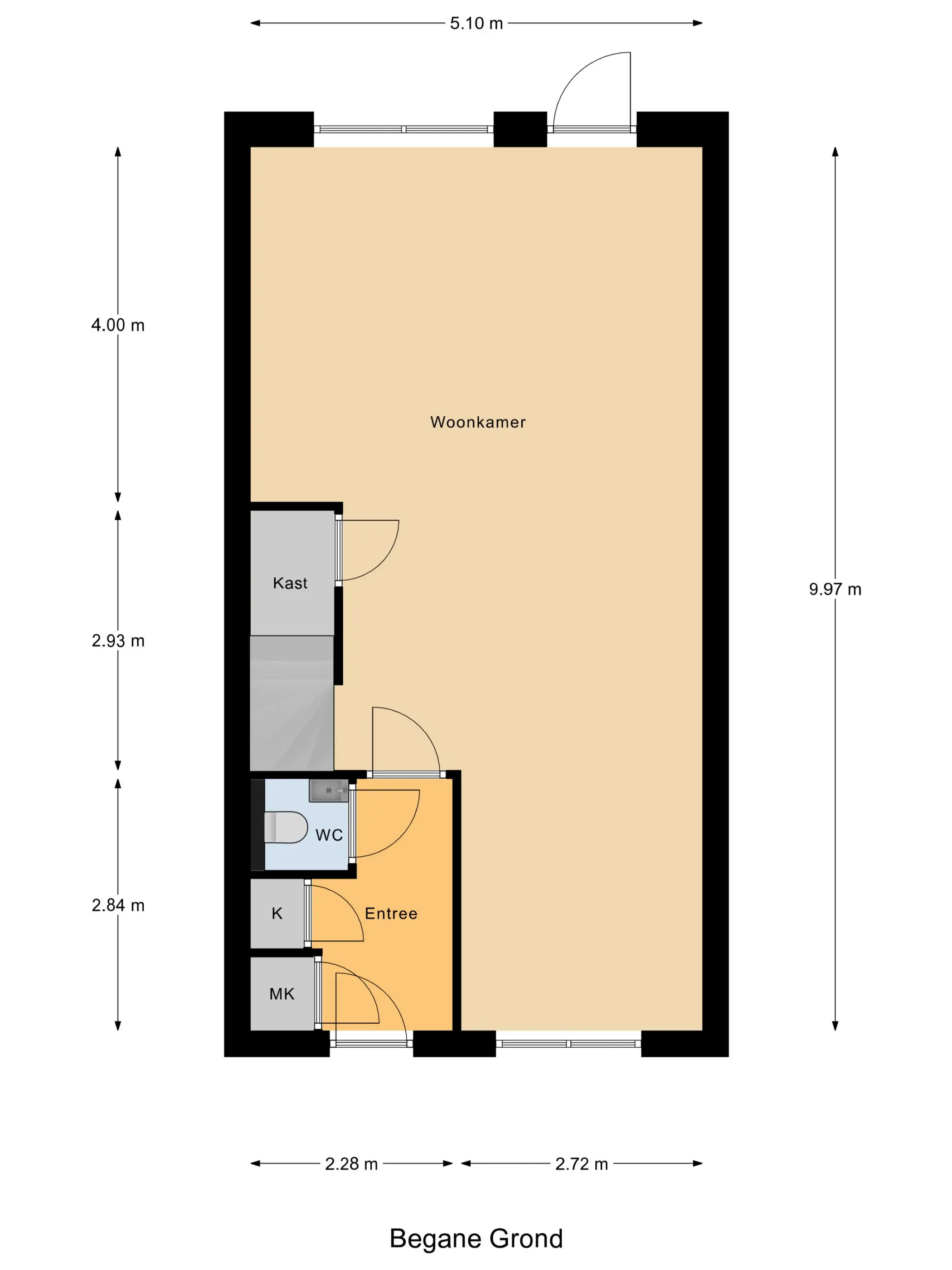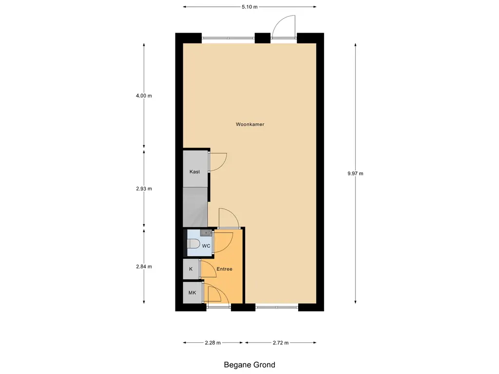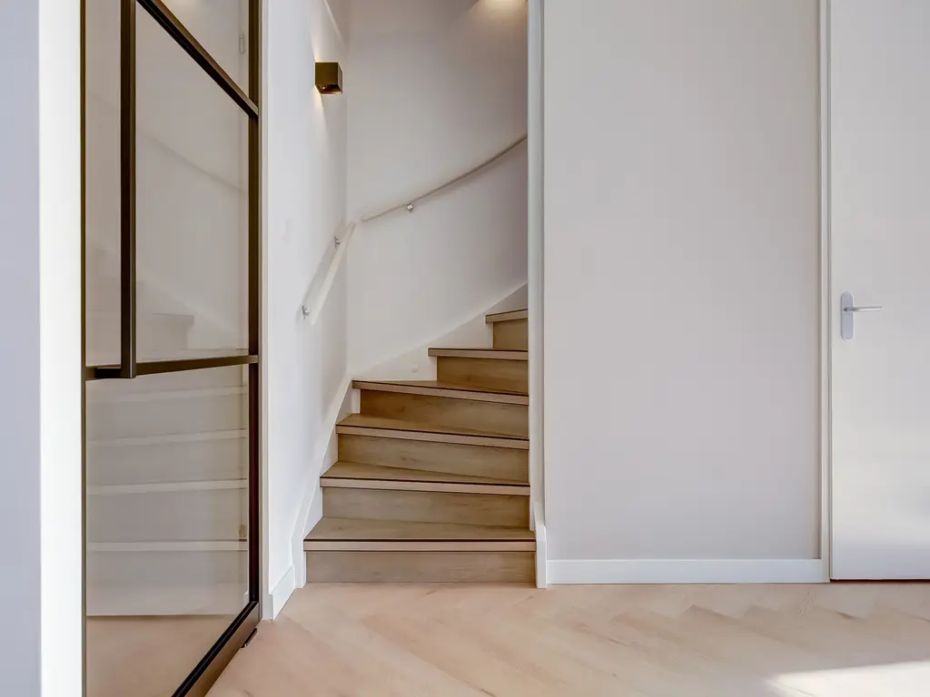 Begane grond: Via de voortuin betreedt u de woning. In de hal vindt u de meterkast, een modern zwevend toilet en een stijlvolle stalen taatsdeur die toegang geeft tot de woonkamer. De tuingerichte woonkamer is strak en luxe afgewerkt met een prachtige PVC visgraatvloer, vloerverwarming én -koeling en glad afgewerkte wanden en plafonds.