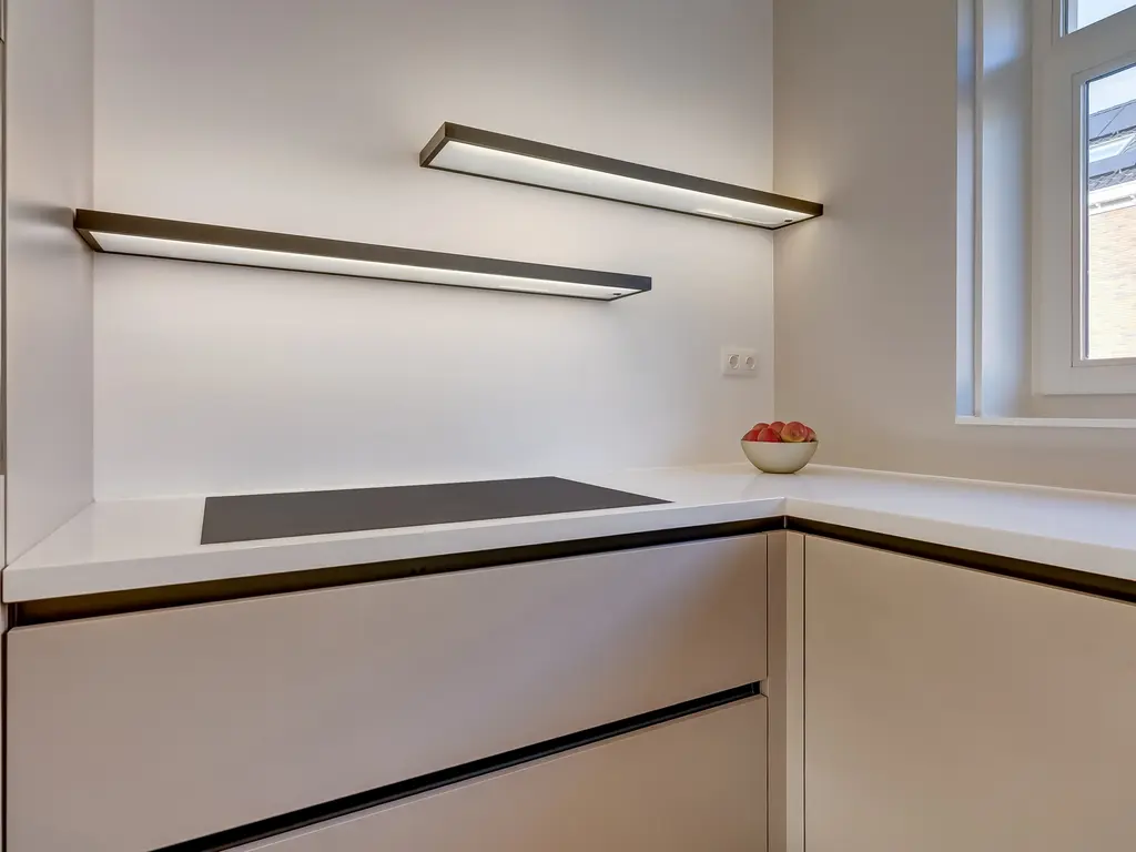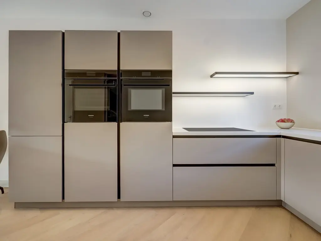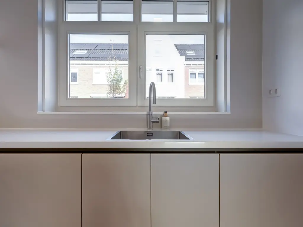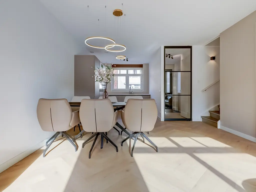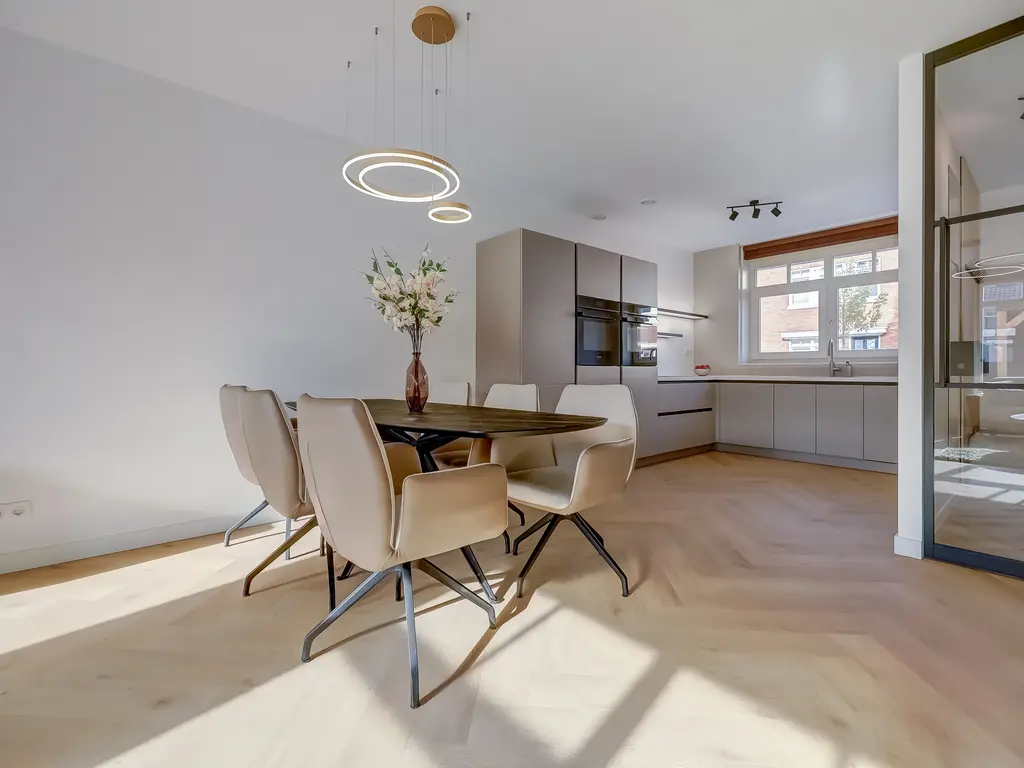Aan de voorzijde van de woning bevindt zich de moderne keuken in hoekopstelling. Deze is voorzien van hoogwaardige inbouwapparatuur, waaronder een inductiekookplaat met geïntegreerde afzuiging, vaatwasser, een combi-oven, een stoomoven, een stijlvolle Quooker, grote koelkast en separate vriezer. De gehele begane grond is voorzien van comfortabele vloerverwarming en -koeling.