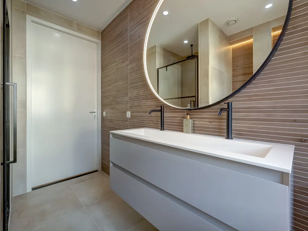 Eerste verdieping: De overloop geeft toegang tot drie ruime slaapkamers, allemaal strak afgewerkt en voorzien van een PVC vloer met vloerverwarming en -koeling. De moderne badkamer beschikt over een inloopdouche, luxe badkamermeubel en een tweede toilet.