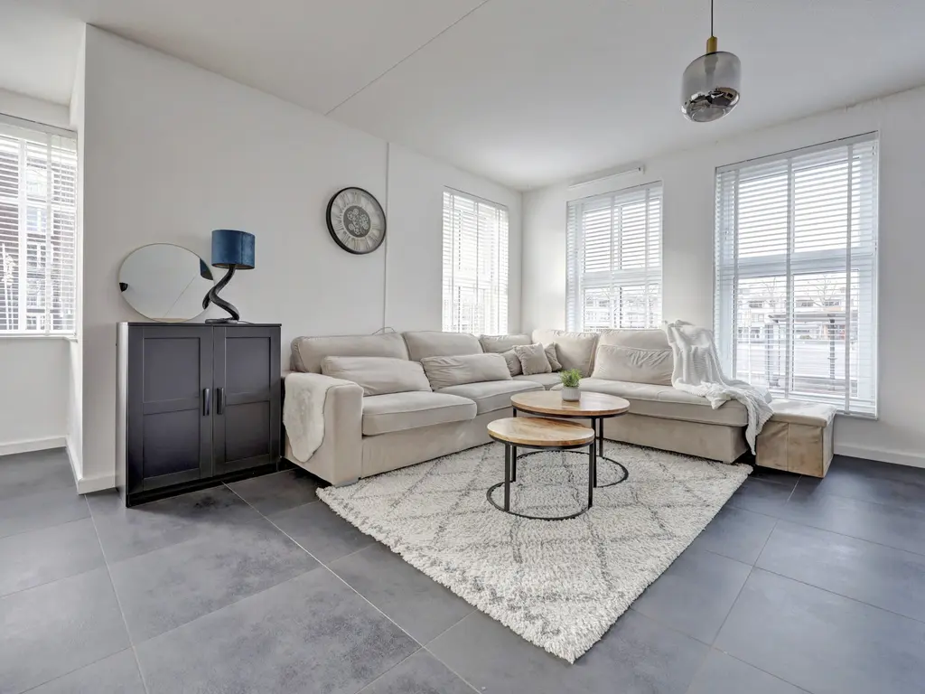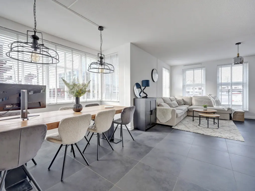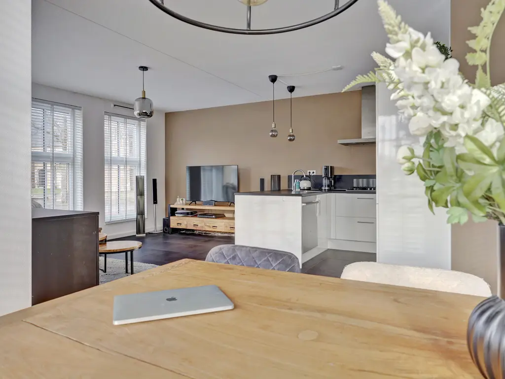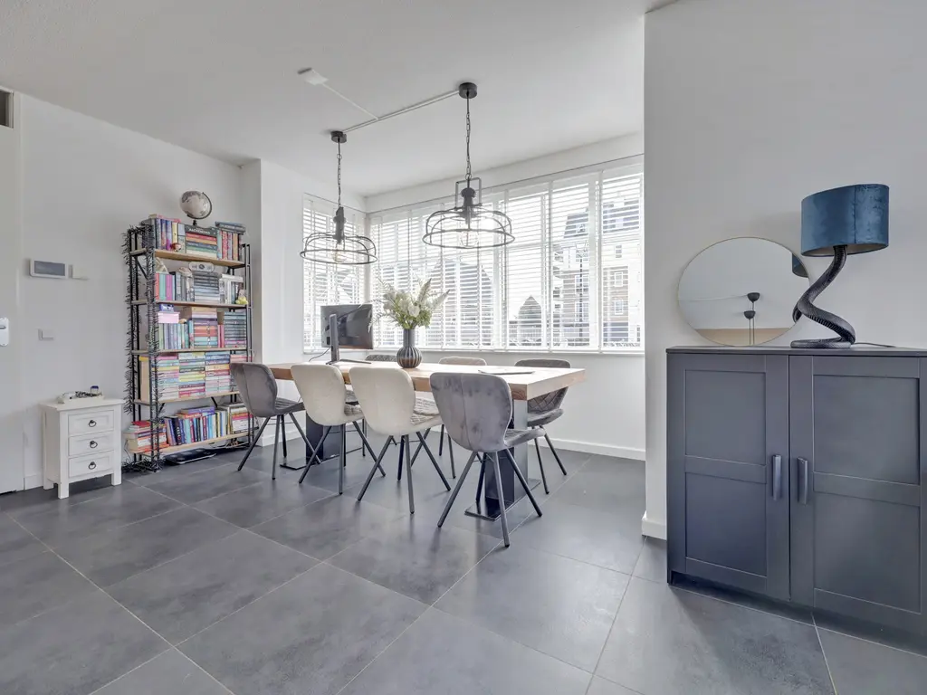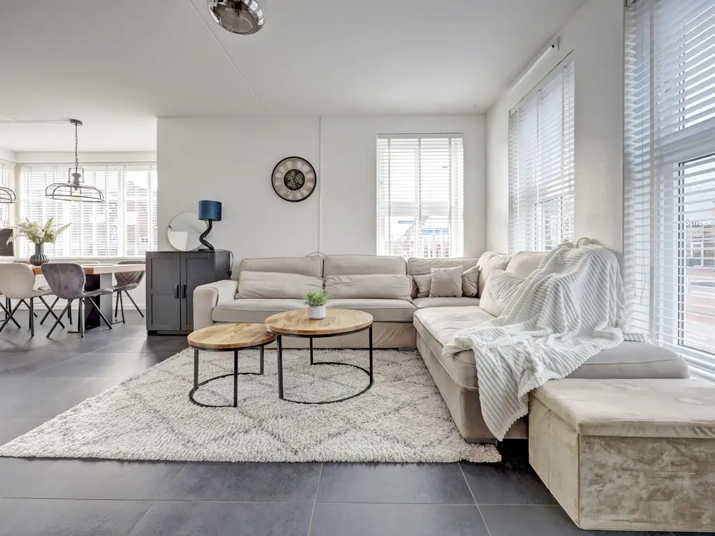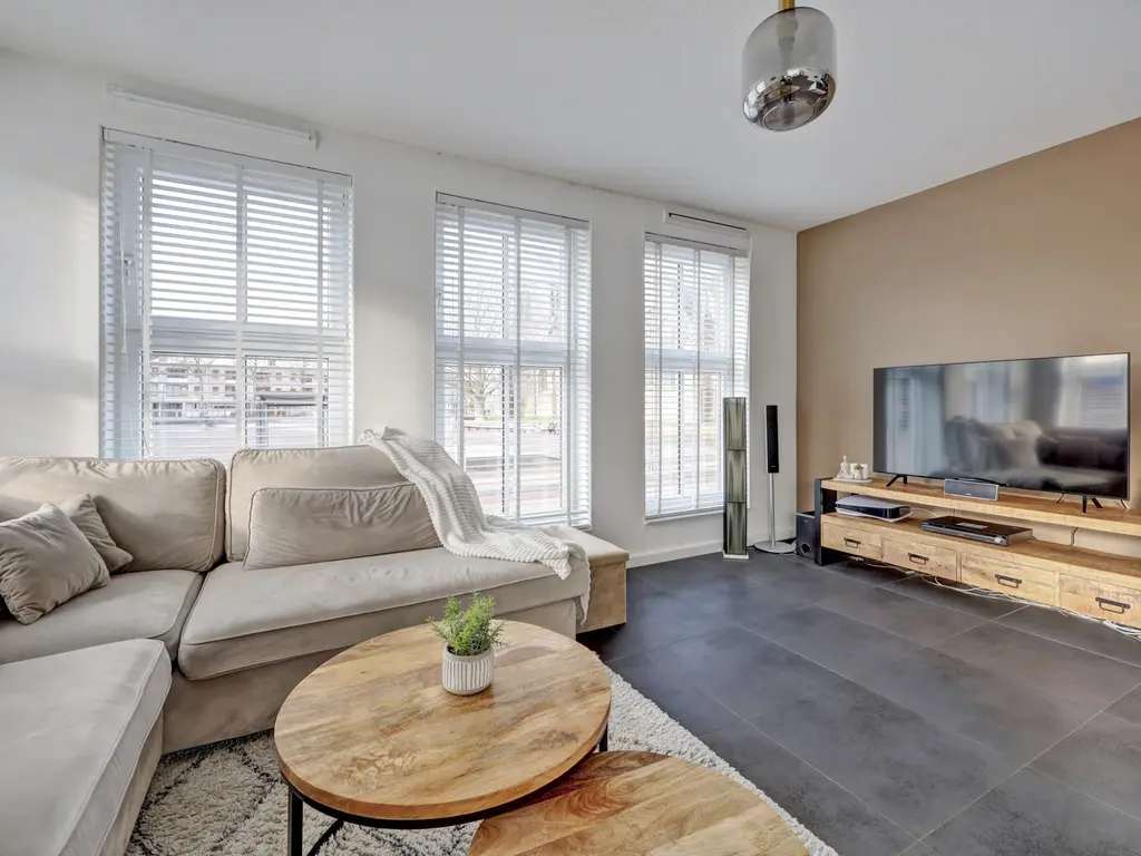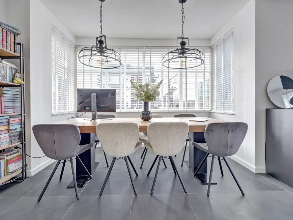 De royale woonkamer met erker is een echte eyecatcher: dankzij de grote raampartijen geniet je hier van uitzonderlijk veel licht en een leuk uitzicht over het bruisende centrum. De ruimte voelt open, sfeervol en uitnodigend aan.