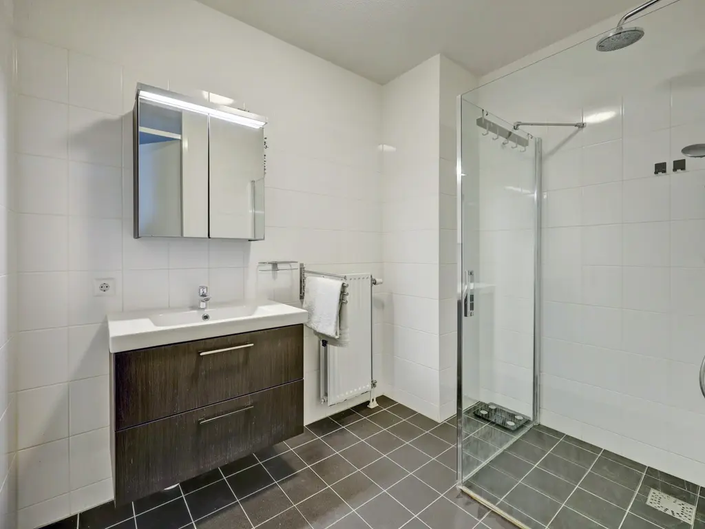 De badkamer is strak en tijdloos uitgevoerd, volledig tot boven betegeld en ingericht met een inloopdouche en een wastafelmeubel.