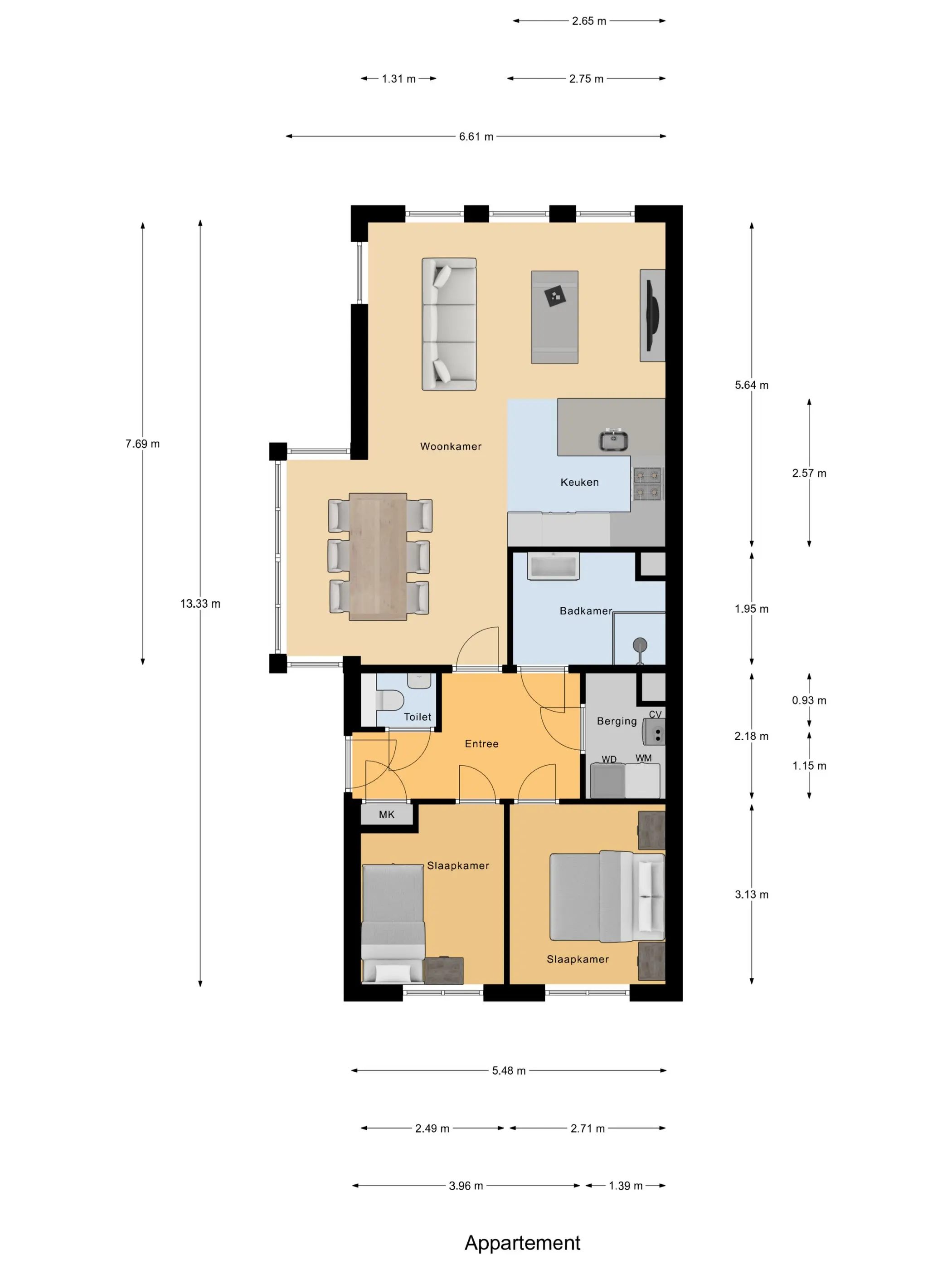 Het gehele appartement is afgewerkt met een tegelvloer en voorzien van vloerverwarming, wat zorgt voor een strak uiterlijk en optimaal wooncomfort.