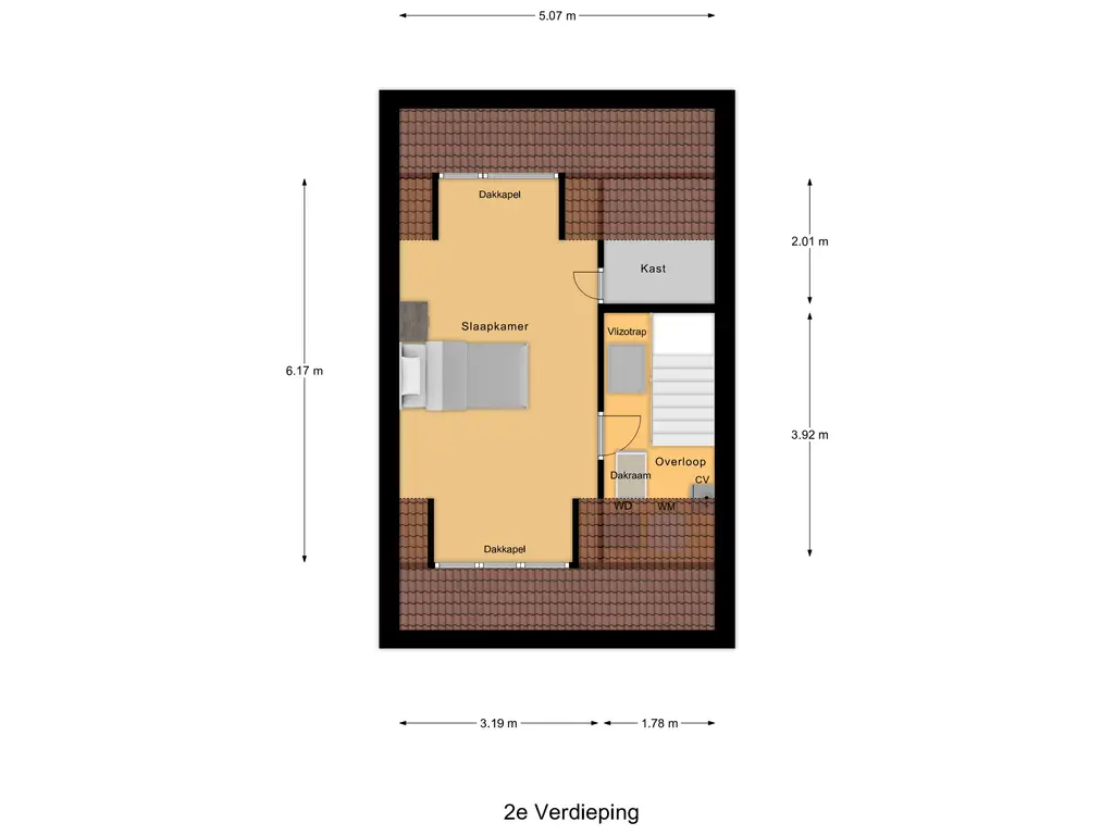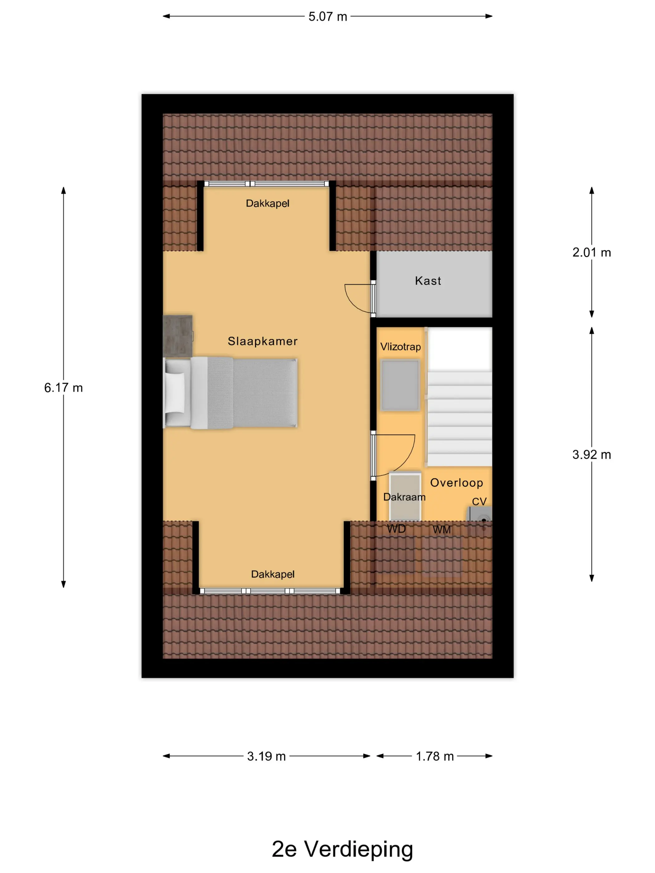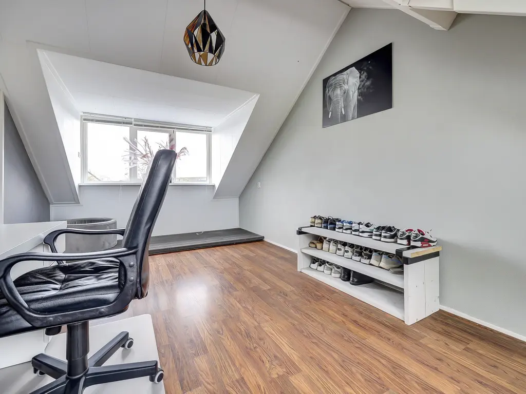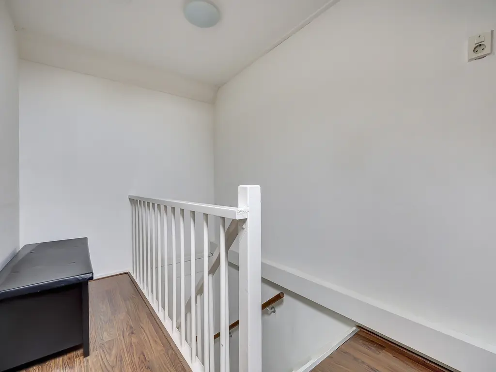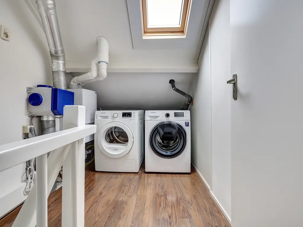 Tweede verdieping Overloop met opstelplaats voor de HR CV-combiketel (2020), mechanische ventilatie-unit en aansluitingen voor wasmachine en droger. Hier bevindt zich de vierde slaapkamer, voorzien van twee kunststof dakkapellen, wat zorgt voor extra ruimte en lichtinval, en afgewerkt met een laminaatvloer.