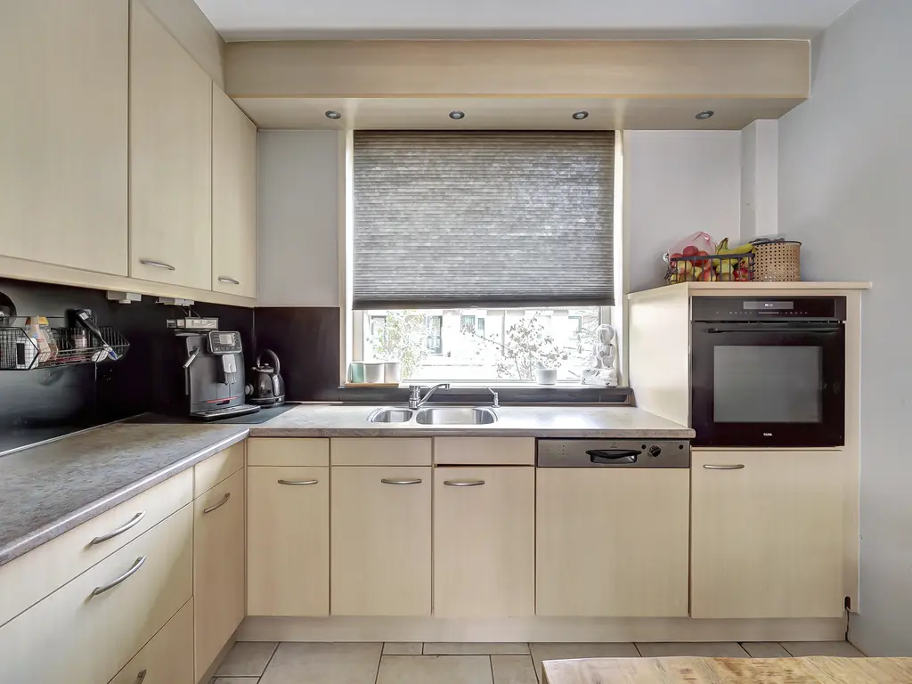De L-vormige keuken bevindt zich aan de voorzijde van de woning en is uitgerust met diverse inbouwapparatuur.