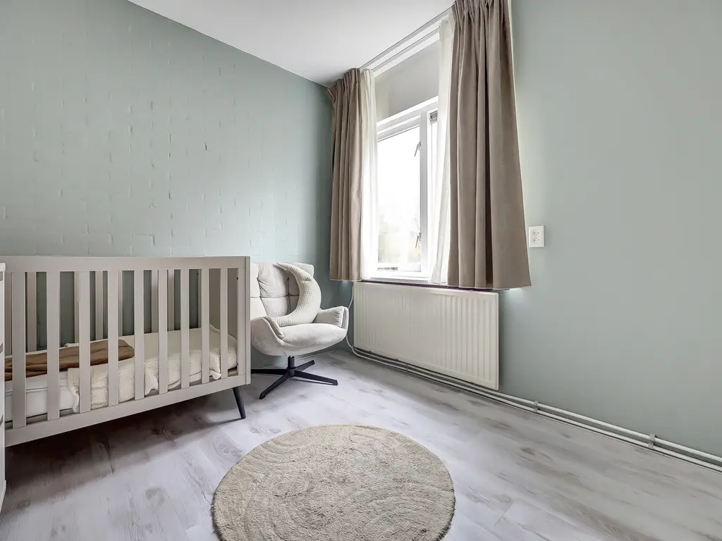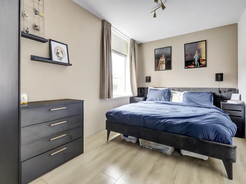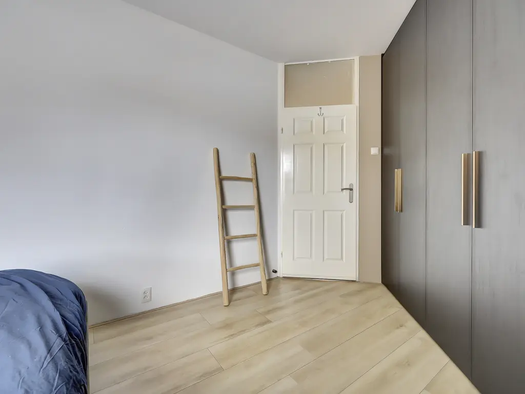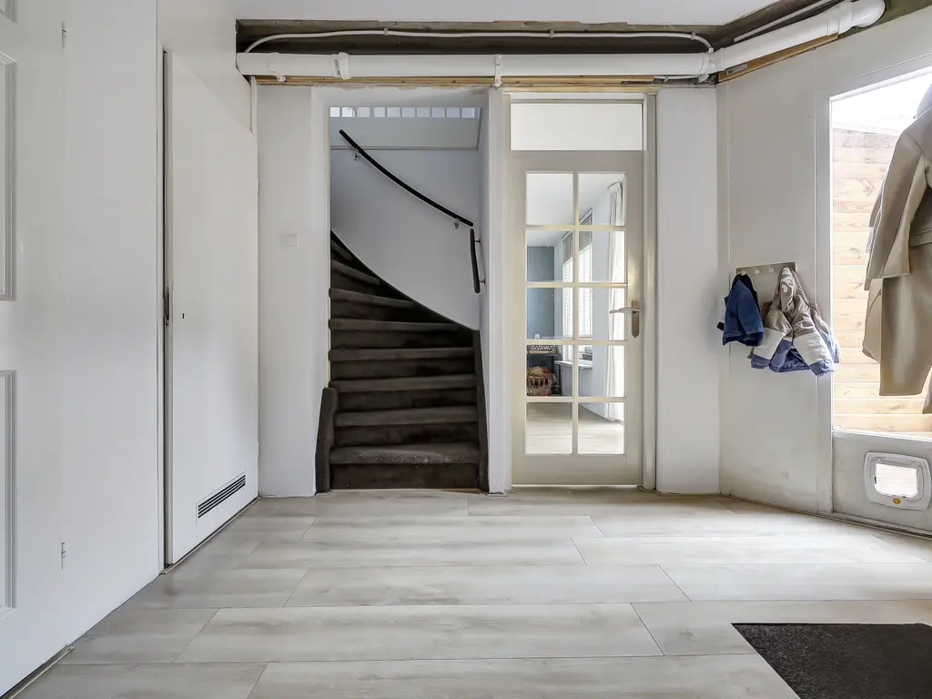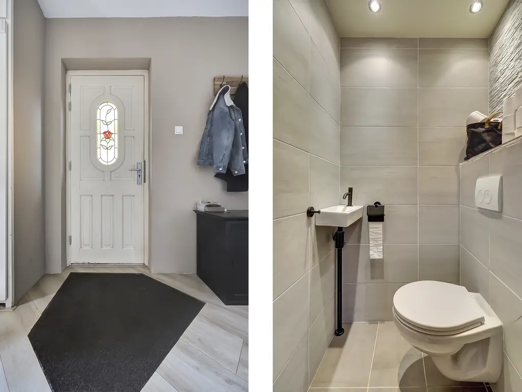Begane grond: Entree van het appartement. Ruime hal met meterkast, modern toilet met fonteintje, trapopgang naar de eerste verdieping en een praktische kast met opstelling van de CV-ketel (Remeha Tzerra HR, 2023) en mechanische ventilatie. Op de begane grond bevindt zich tevens een ruime slaapkamer van ca. 12,8 m², voorzien van een nette laminaatvloer.
