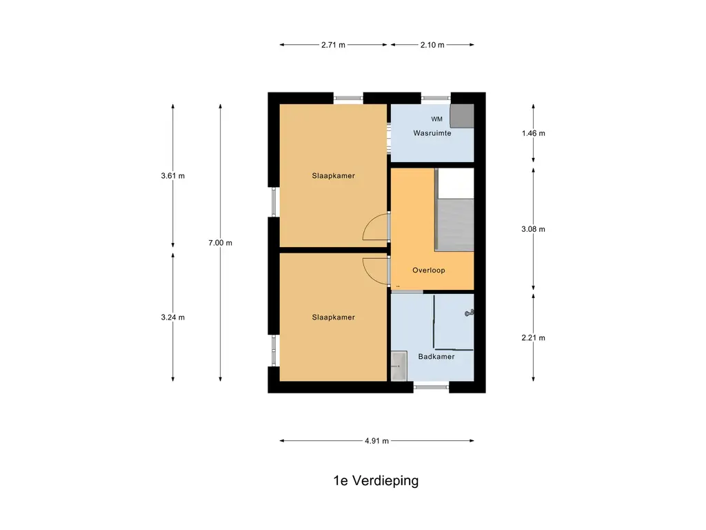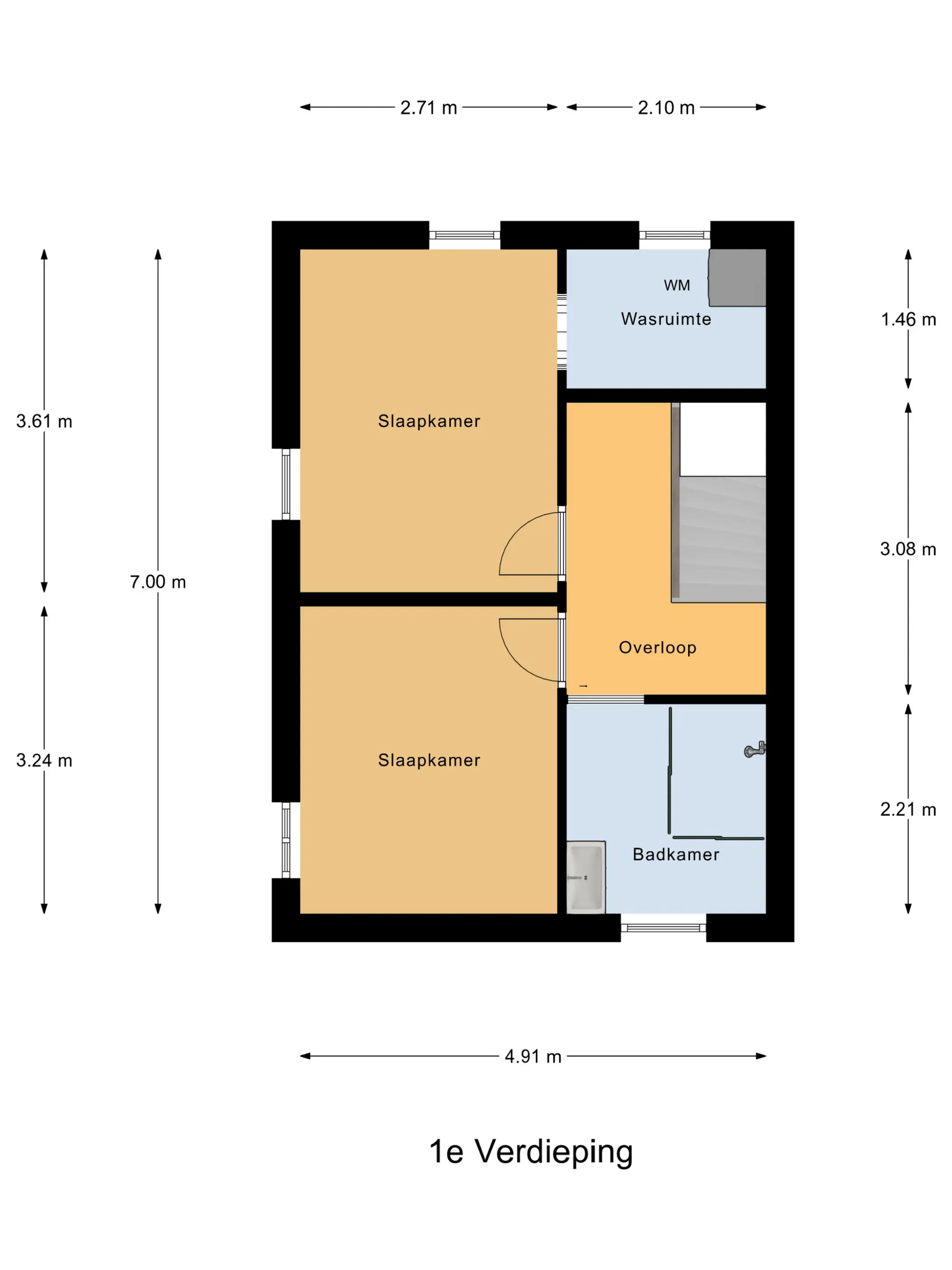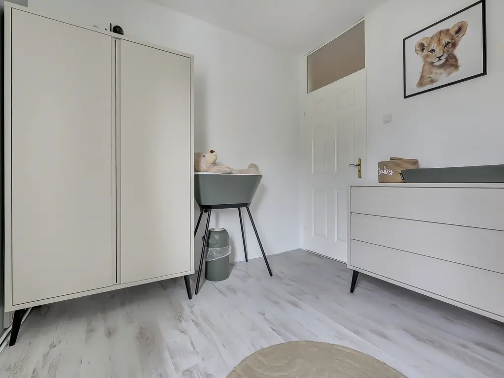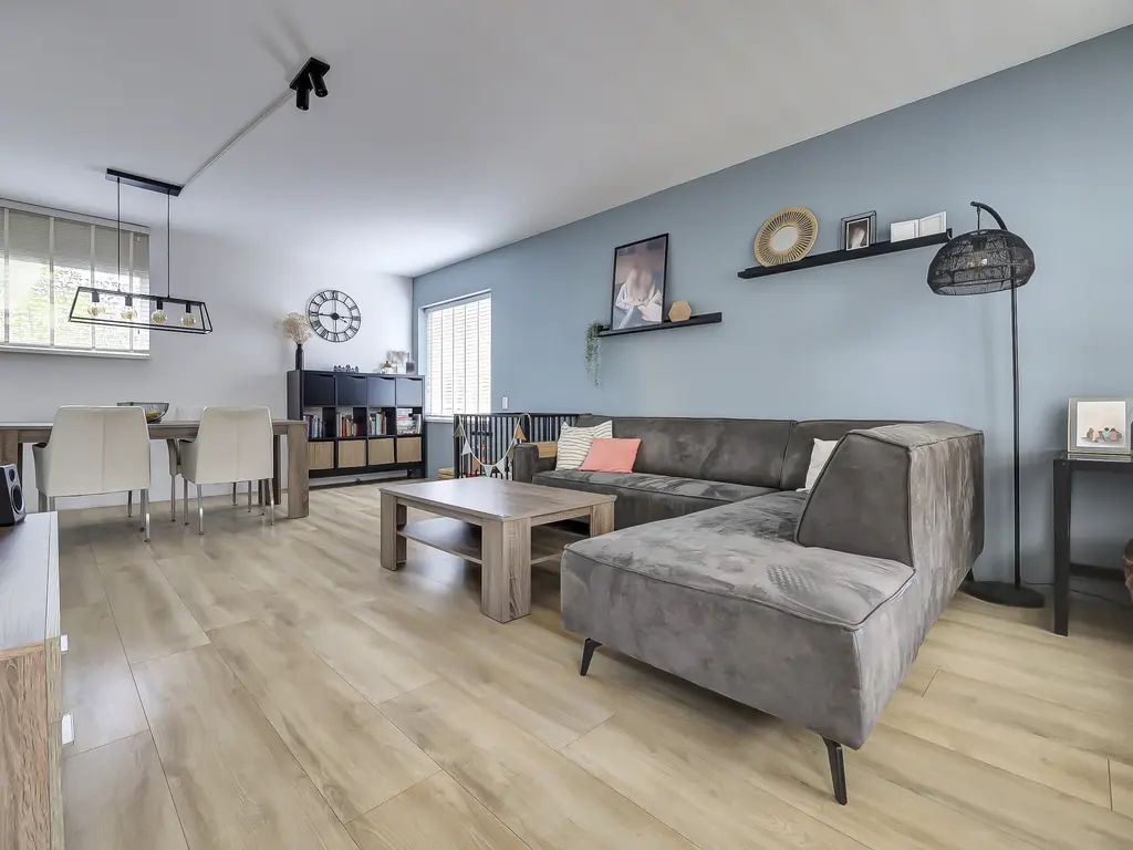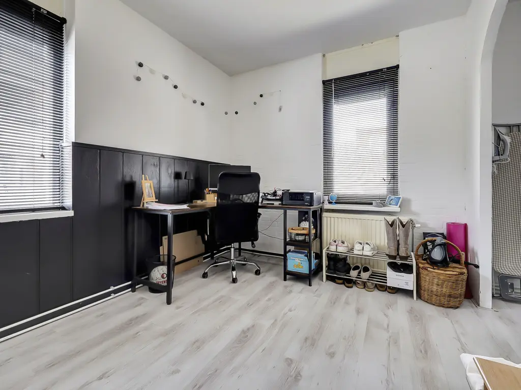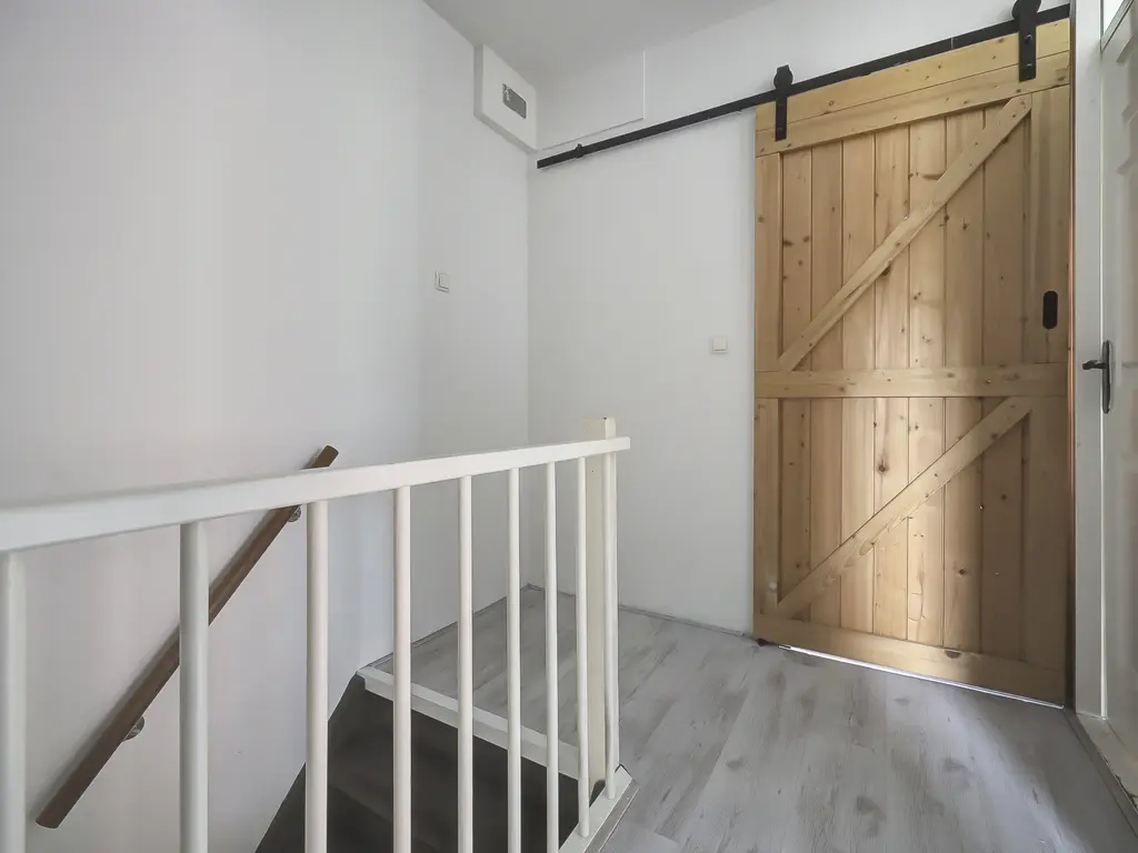 1e verdieping: Overloop met toegang tot twee slaapkamers, beide voorzien van laminaat. Daarnaast is er een aparte ruimte voor wasmachine en droger. De moderne badkamer (2019) is volledig betegeld en beschikt over een inloopdouche en wastafelmeubel.
