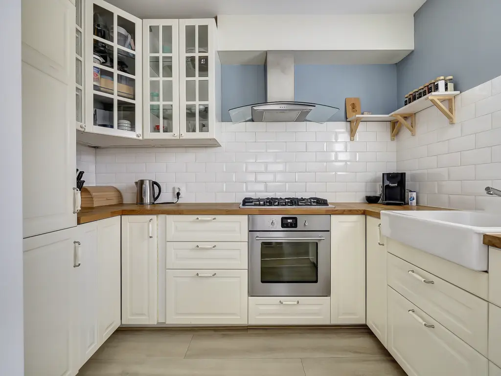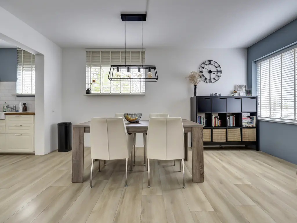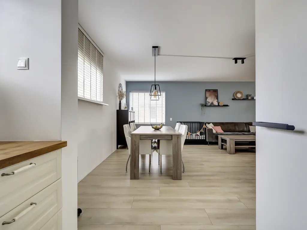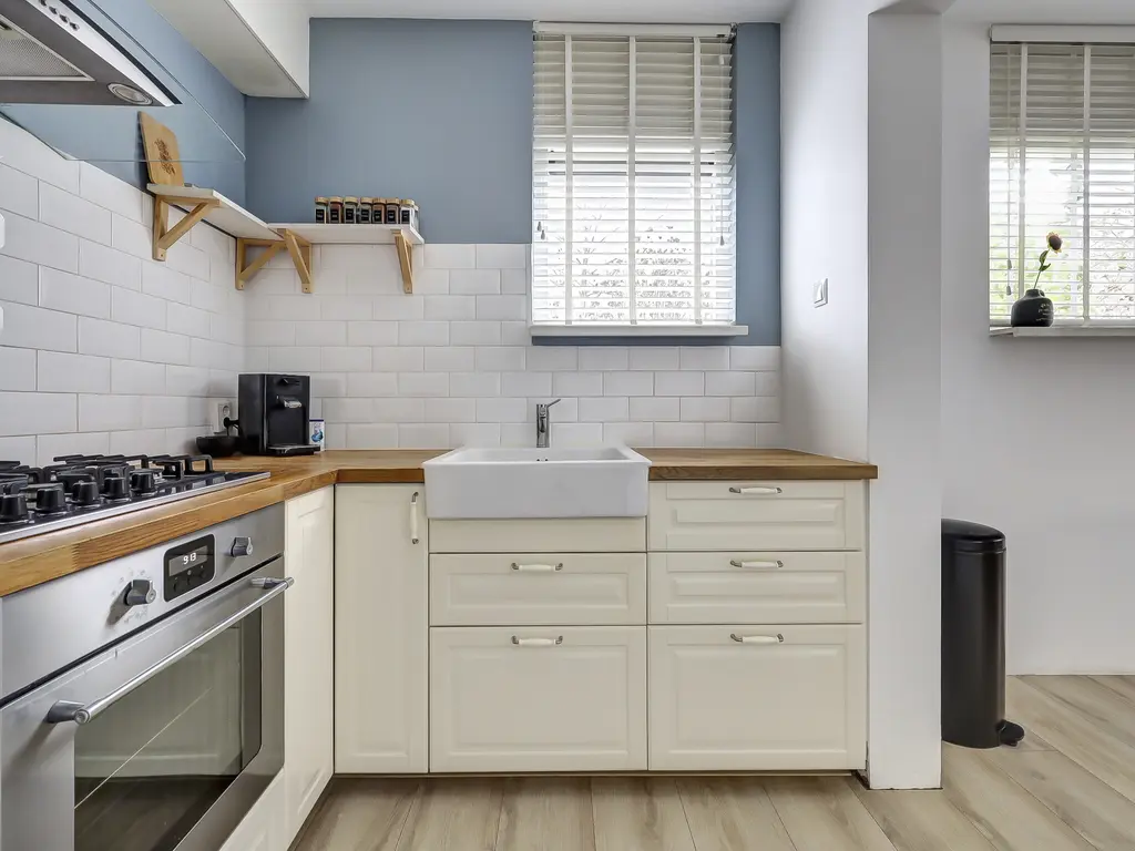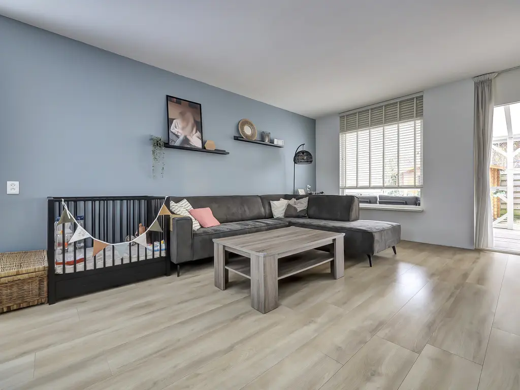 De lichte, speels ingedeelde woonkamer beschikt over een laminaatvloer en heeft een open verbinding met de keuken. De landelijke keuken in U-opstelling is uitgerust met o.a. een koel/vriescombinatie, heteluchtoven, 5-pits gasfornuis en rvs-afzuigkap. Via de achterdeur stap je zó de verrassend ruime tuin in gelegen op het zonnige zuidwesten, direct aan het water. De tuin is voorzien van een overkapping en geeft toegang tot de eigen berging.