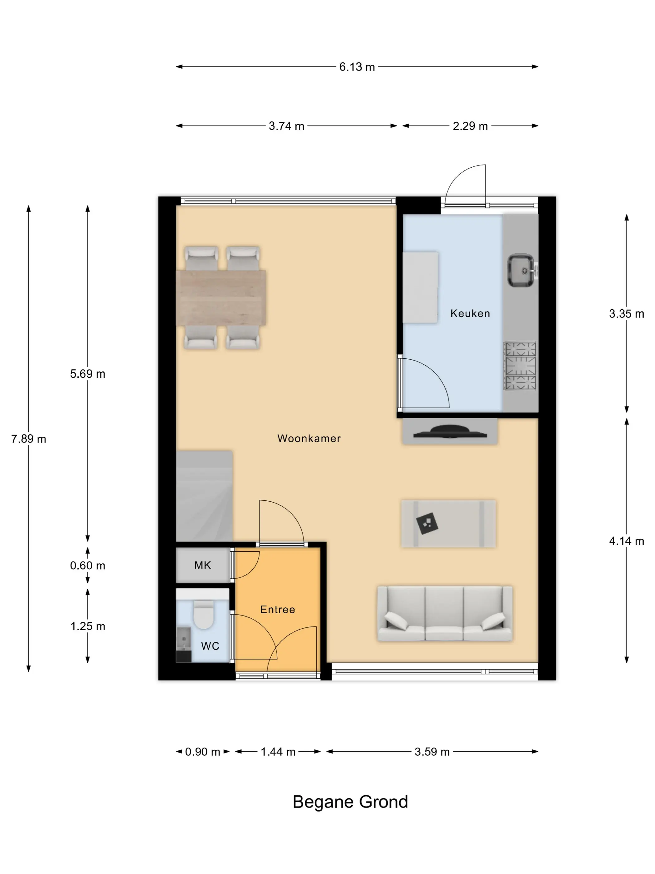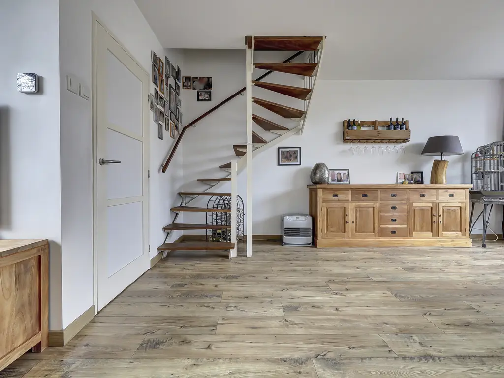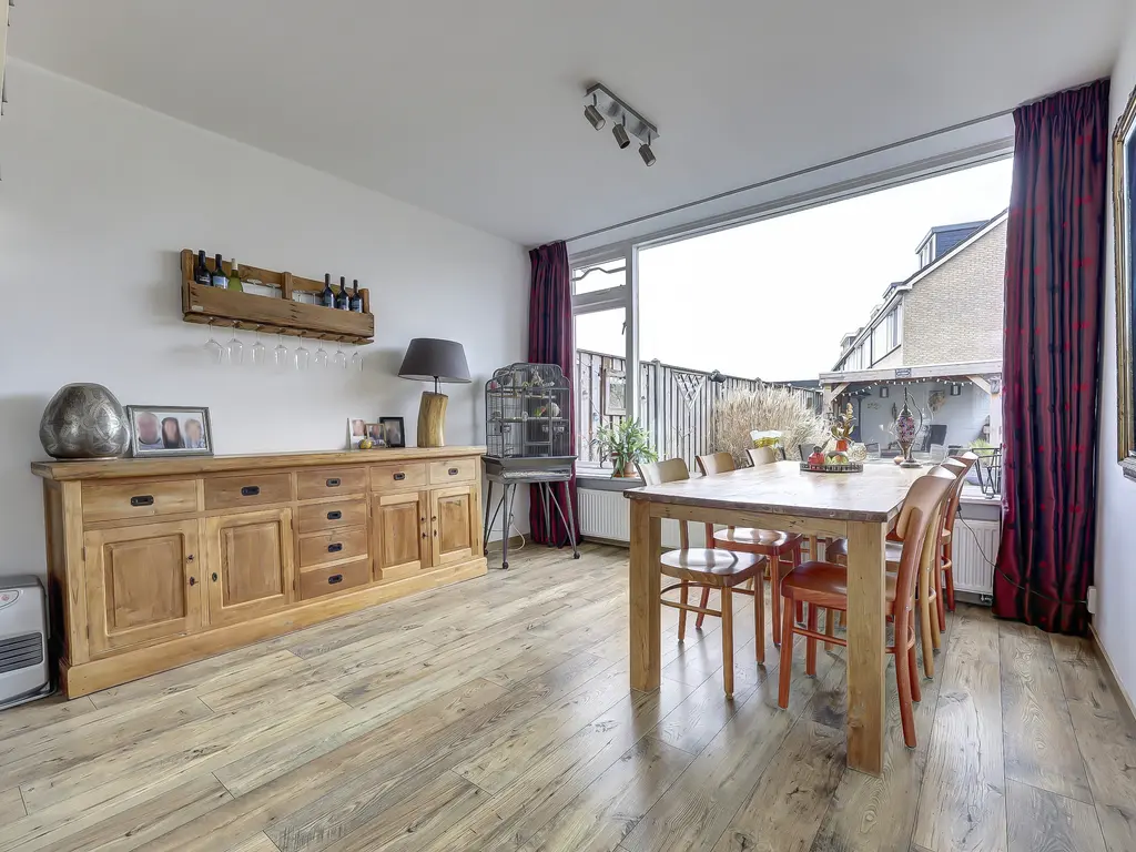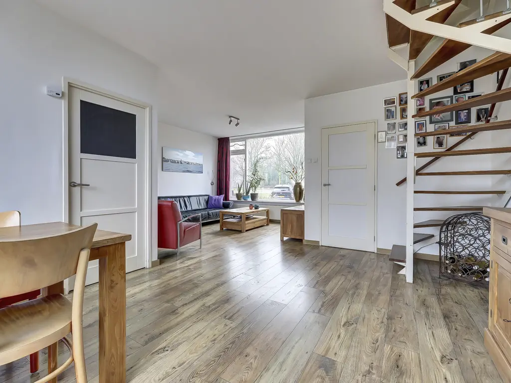 Begane grond: Via de entree/hal met meterkast (2012) en toiletruimte kom je binnen in de sfeervolle Z-vormige woonkamer. Dankzij de grote raampartijen geniet je hier van een prettige lichtinval. De woonkamer is afgewerkt met een nette laminaatvloer en verzorgde wandafwerking, wat zorgt voor een warme en uitnodigende uitstraling.