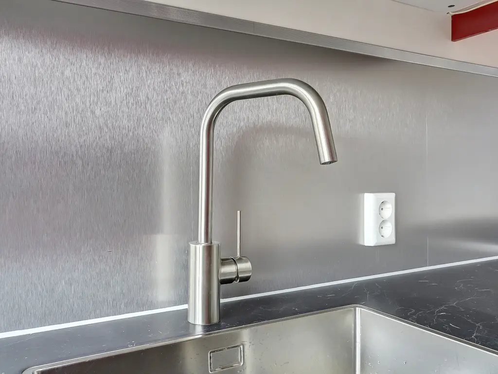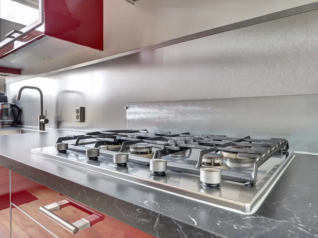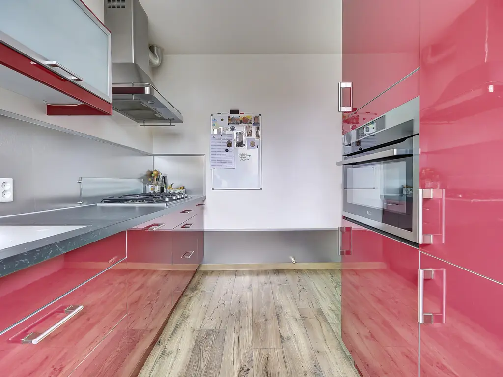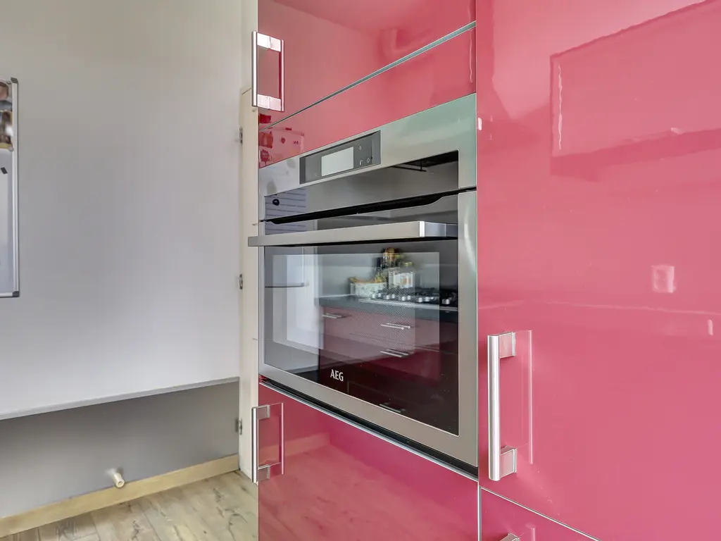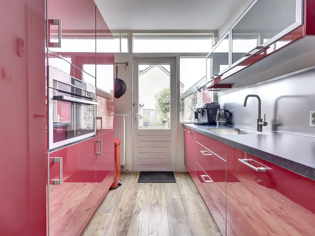 De dichte keuken heeft een praktische parallelopstelling en is van alle gemakken voorzien, waaronder een combi-oven, koelkast, vriezer, gaskookplaat, afzuigkap en vaatwasser. Vanuit de keuken heb je via de achterdeur toegang tot de fraai aangelegde achtertuin.