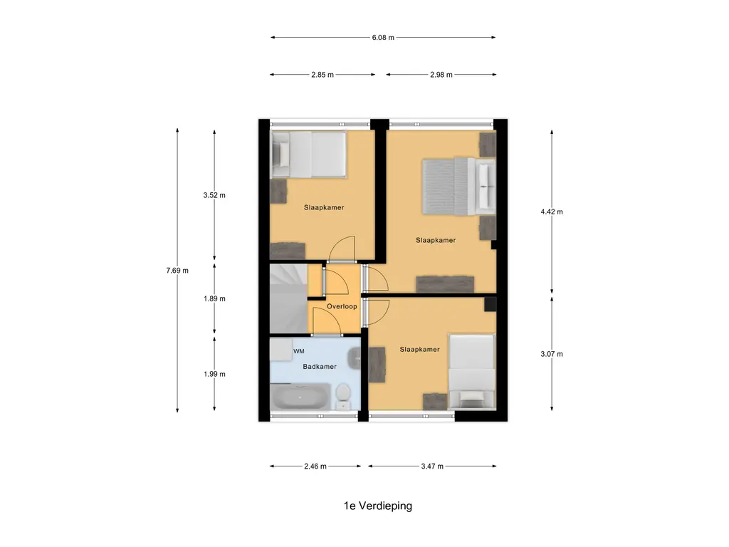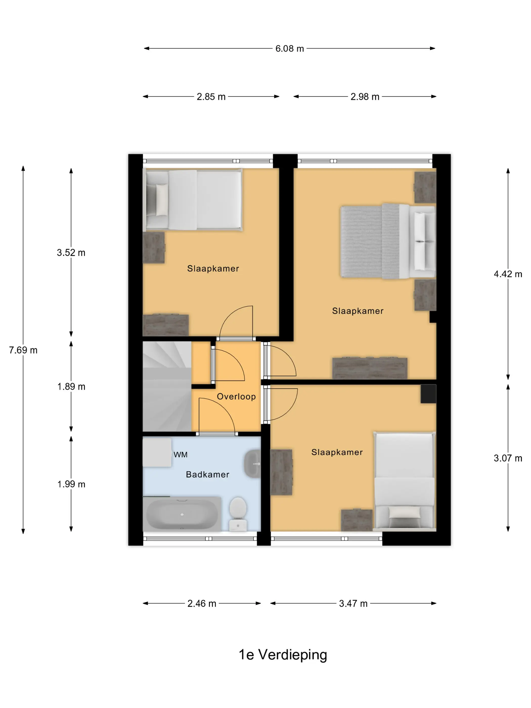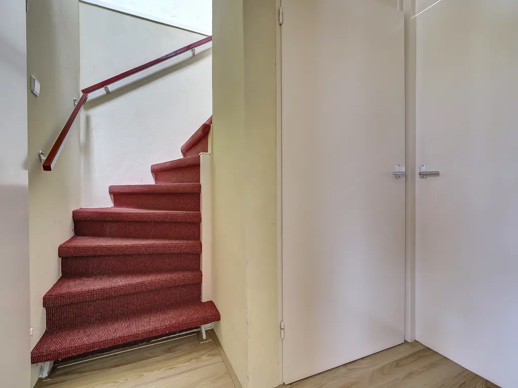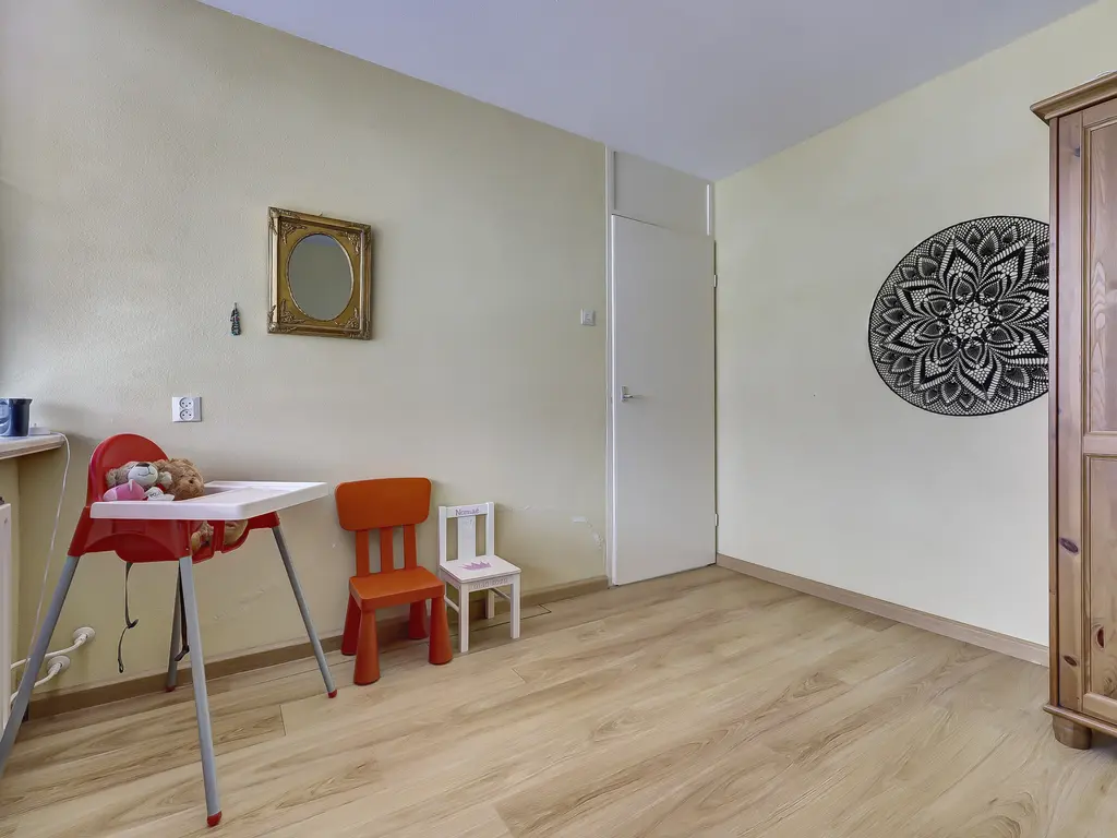 Eerste verdieping: De overloop biedt toegang tot drie ruime slaapkamers. Alle kamers beschikken over een rechte gevel optrek, wat zorgt voor optimaal gebruik van de ruimte, en zijn voorzien van een laminaatvloer.