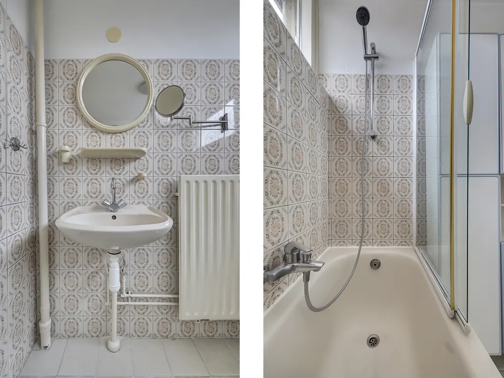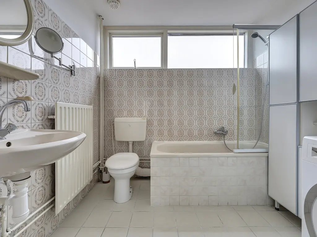 De badkamer is eenvoudig maar netjes uitgevoerd en compleet ingericht met een ligbad, tweede toilet, wastafel en aansluiting voor de wasmachine.