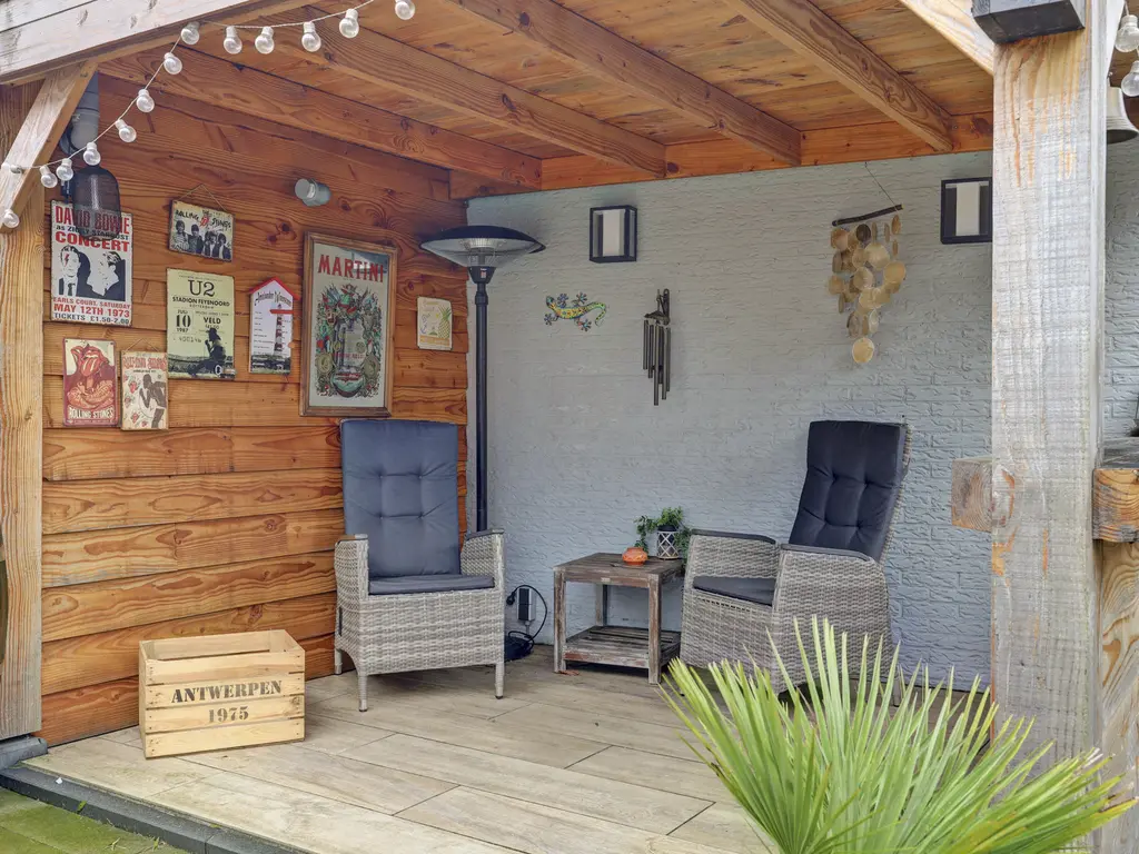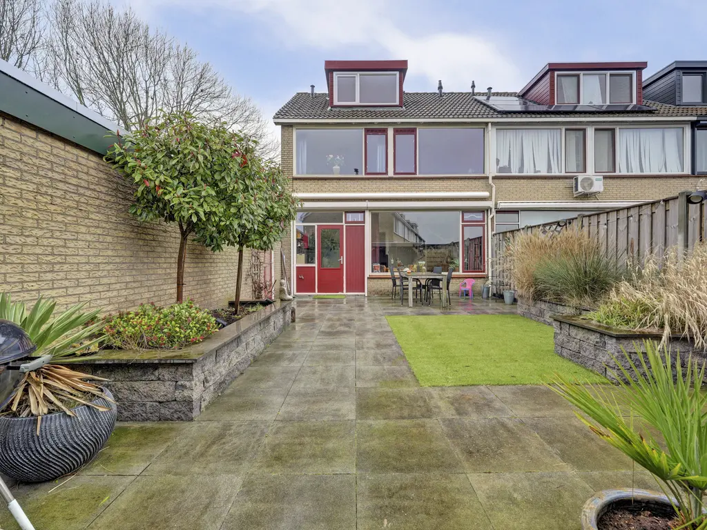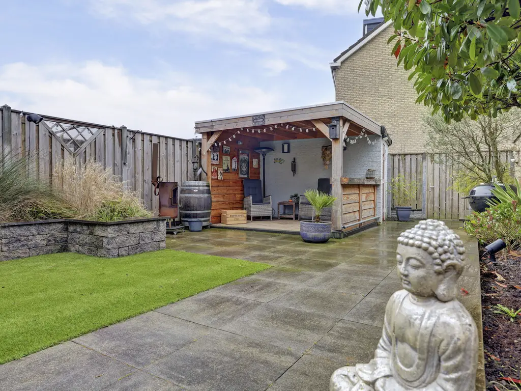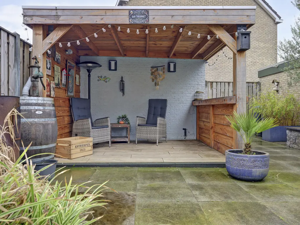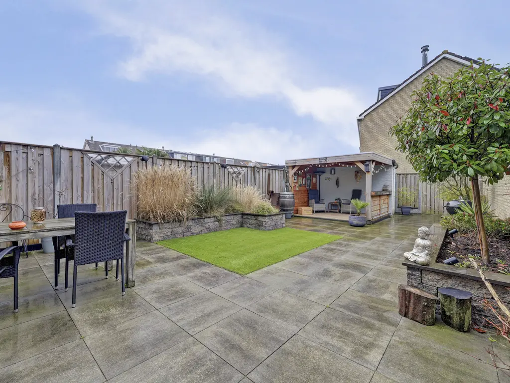 De achtertuin is een heerlijke plek om te ontspannen. Gelegen op het zuiden geniet je hier volop van de zon. Daarnaast beschikt de tuin over een gezellige overkapping, een stenen berging en een achterom. Ook is er een directe toegang tot de garage – ideaal voor hobby, opslag of het stallen van je auto.