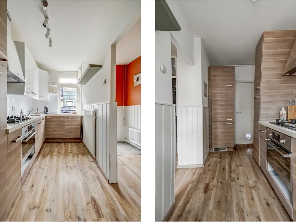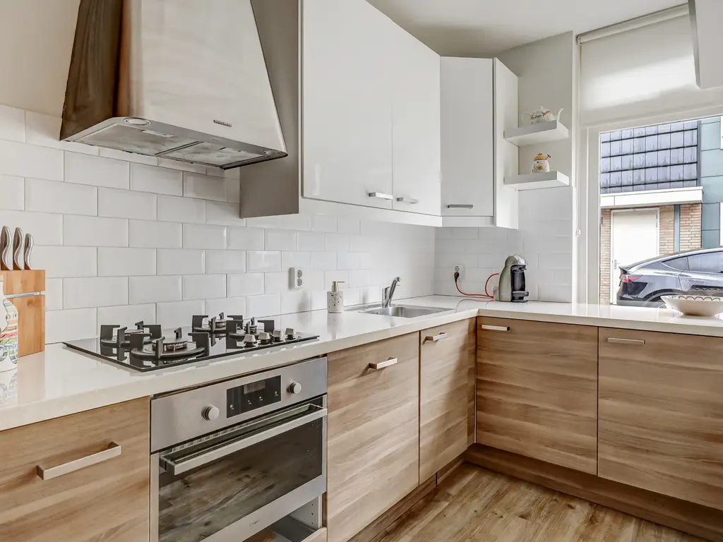 De keuken bevindt zich aan de voorzijde/zijkant van de woning en is uitgevoerd in L- en wandopstelling. Deze moderne keuken is uitgerust met diverse inbouwapparatuur, zoals een koelkast, 3-laags vriezer, 4-pits gaskookplaat met afzuigkap, combi-oven en vaatwasser.