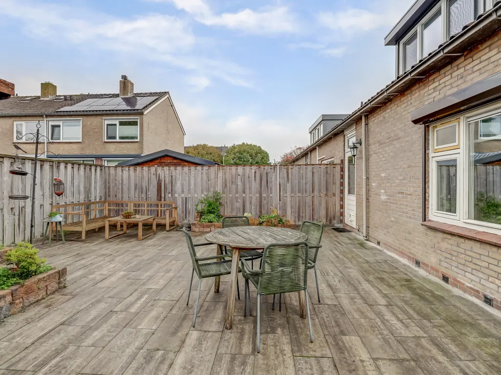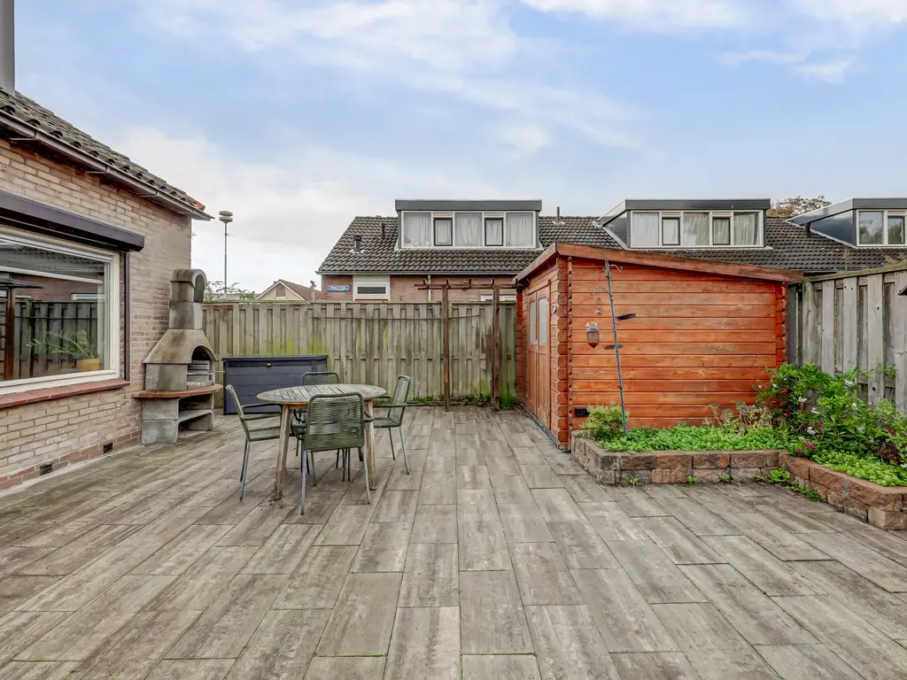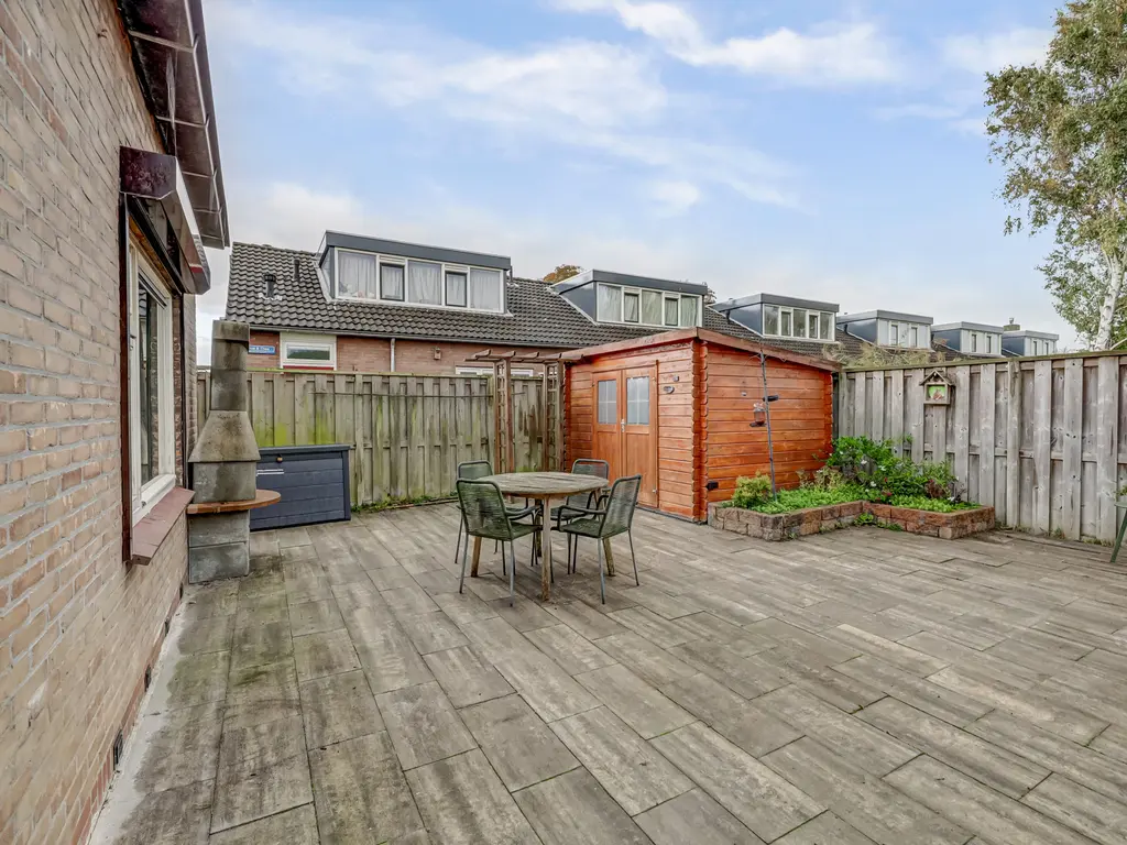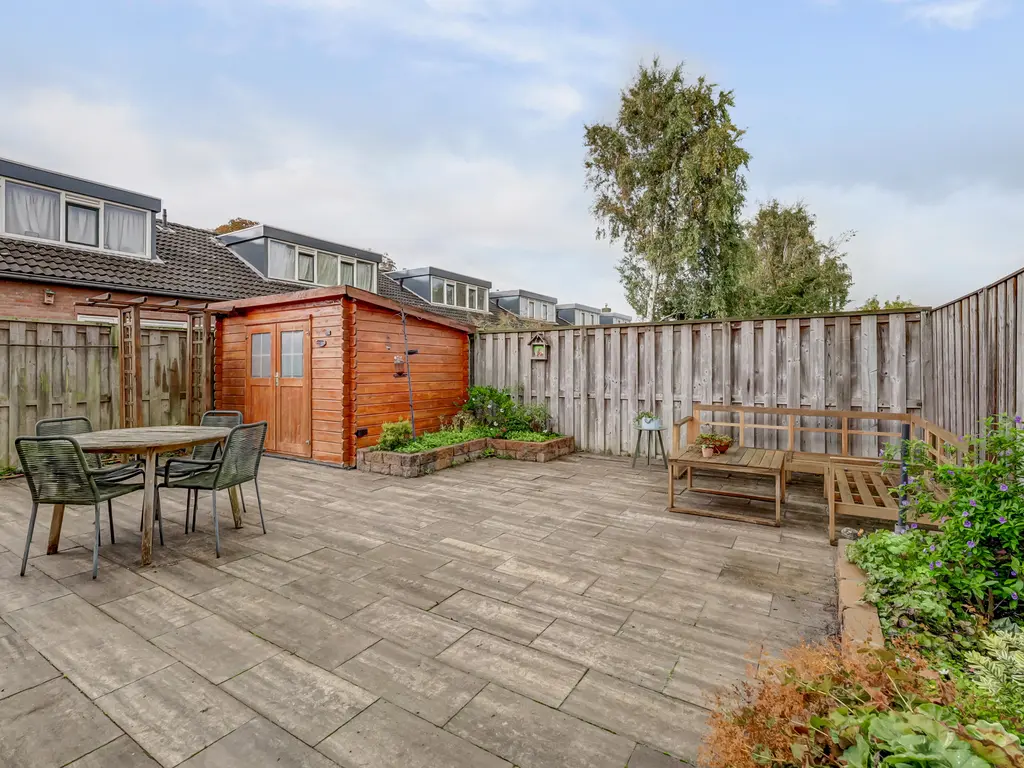 De achtertuin is volledig betegeld, onderhoudsarm en door de gunstige hoekligging kun je hier de hele dag van de zon genieten. De houten berging (2018) en de zijtuin met doorgang naar de voorzijde maken het geheel compleet.