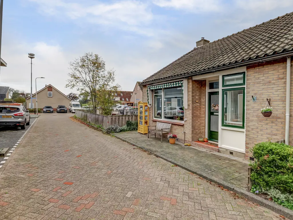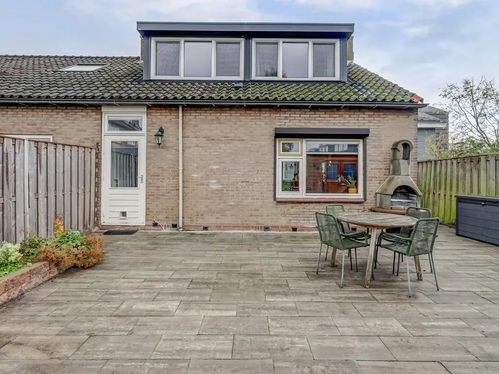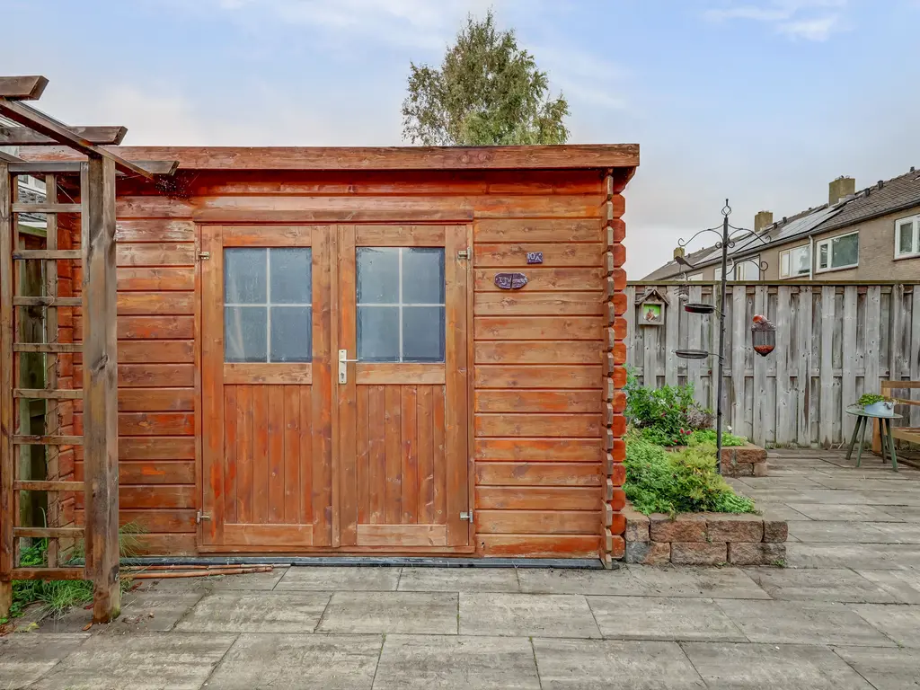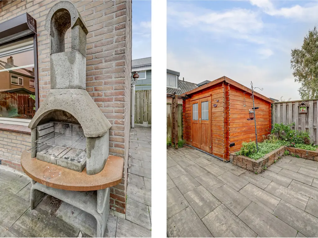De achtertuin is volledig betegeld, onderhoudsarm en door de gunstige hoekligging kun je hier de hele dag van de zon genieten. De houten berging (2018) en de zijtuin met doorgang naar de voorzijde maken het geheel compleet.