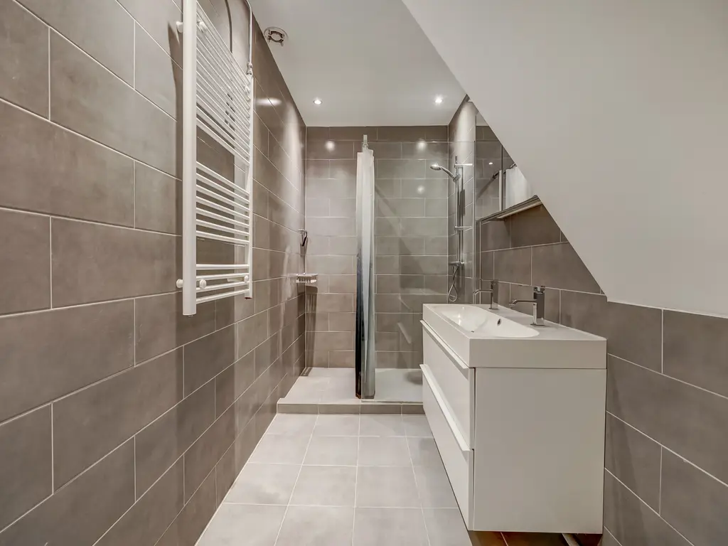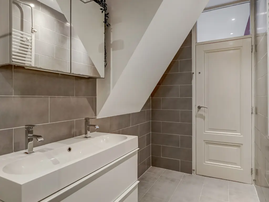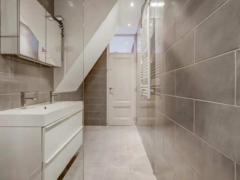 Centraal in de woning bevindt zich de moderne badkamer, volledig betegeld en voorzien van een inloopdouche met glazen scherm, dubbele wastafel met spiegel, designradiator en verlaagd plafond met inbouwspots, een stijlvolle en praktische ruimte.