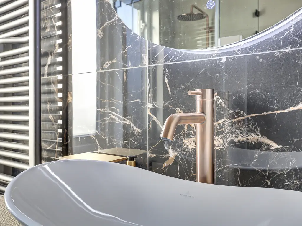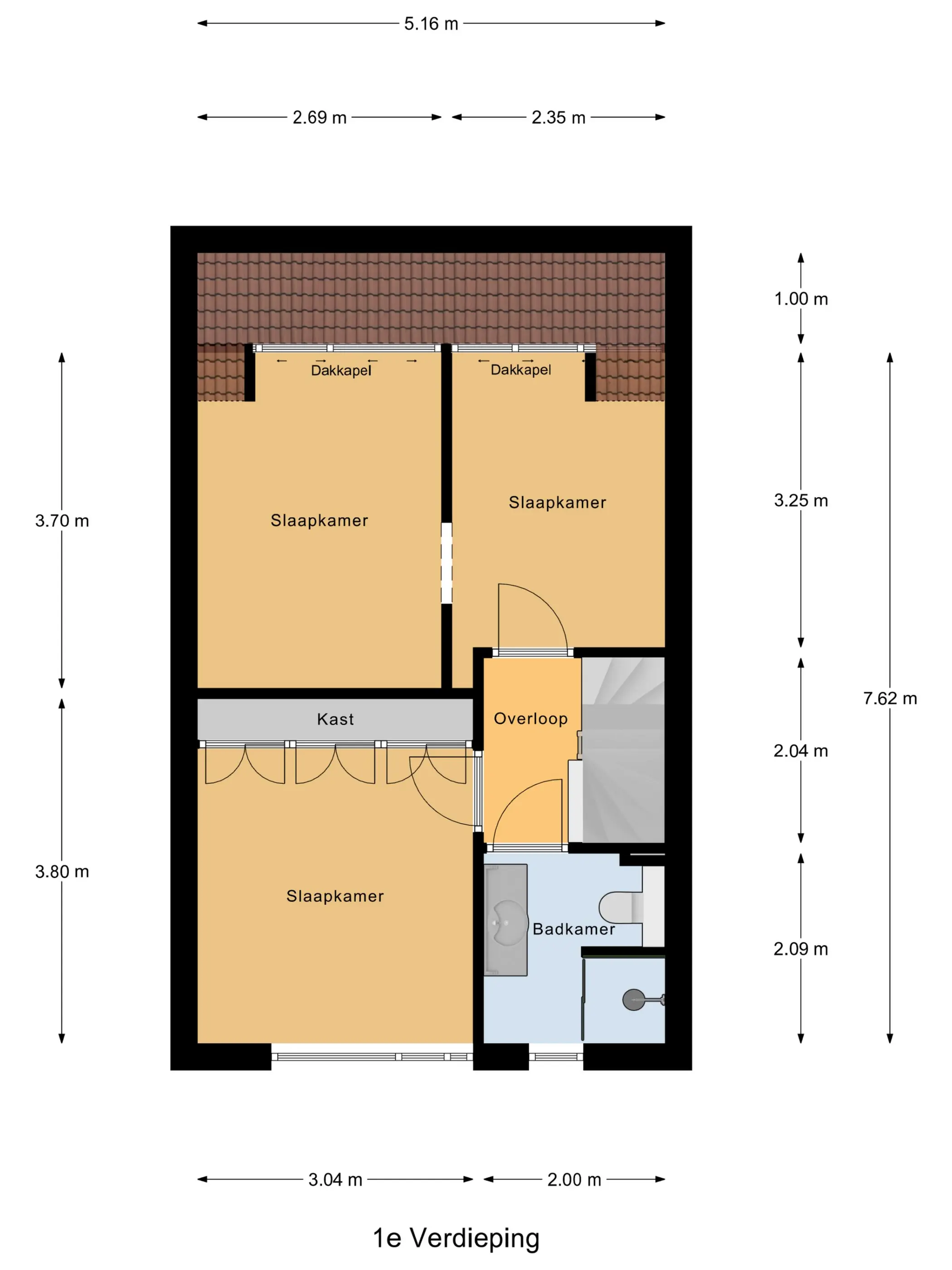 Eerste verdieping: Overloop met toegang tot drie slaapkamers, allen voorzien van een laminaatvloer. De twee slaapkamers aan de achterzijde beschikken over een dakkapel. De moderne, volledig betegelde badkamer (2023) is uitgerust met een inloopdouche, een fraai wastafelmeubel met houten afwerking en een tweede toilet.