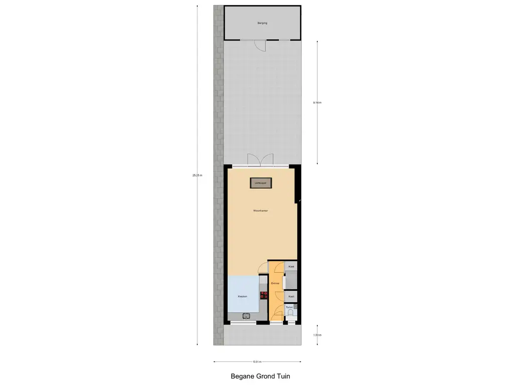 Begane grond: Entree/hal met meterkast, modern zwevend toilet en trapopgang naar de eerste verdieping. De ruime, tuingerichte woonkamer is uitgebouwd en voorzien van een lichtstraat, wat zorgt voor een prettige lichtinval. De woonkamer is afgewerkt met een laminaatvloer met voerverwarming en nette wandafwerking en biedt via een kunststof schuifpui toegang tot de diepe achtertuin. De tuin beschikt over een stenen berging en een achterom.
