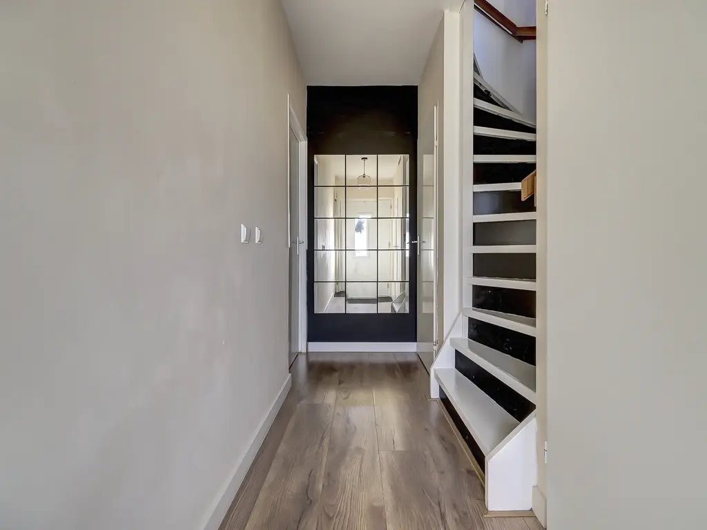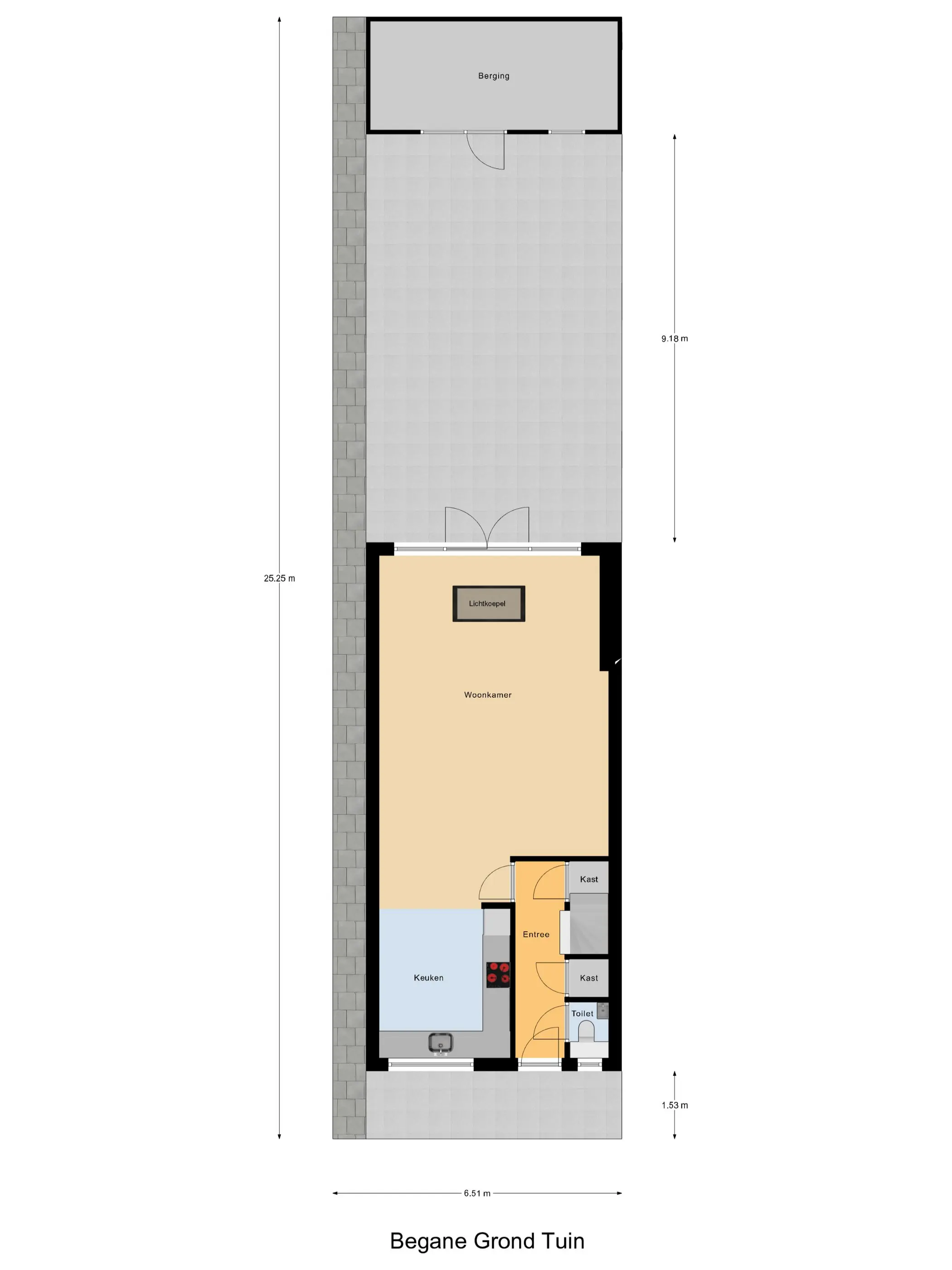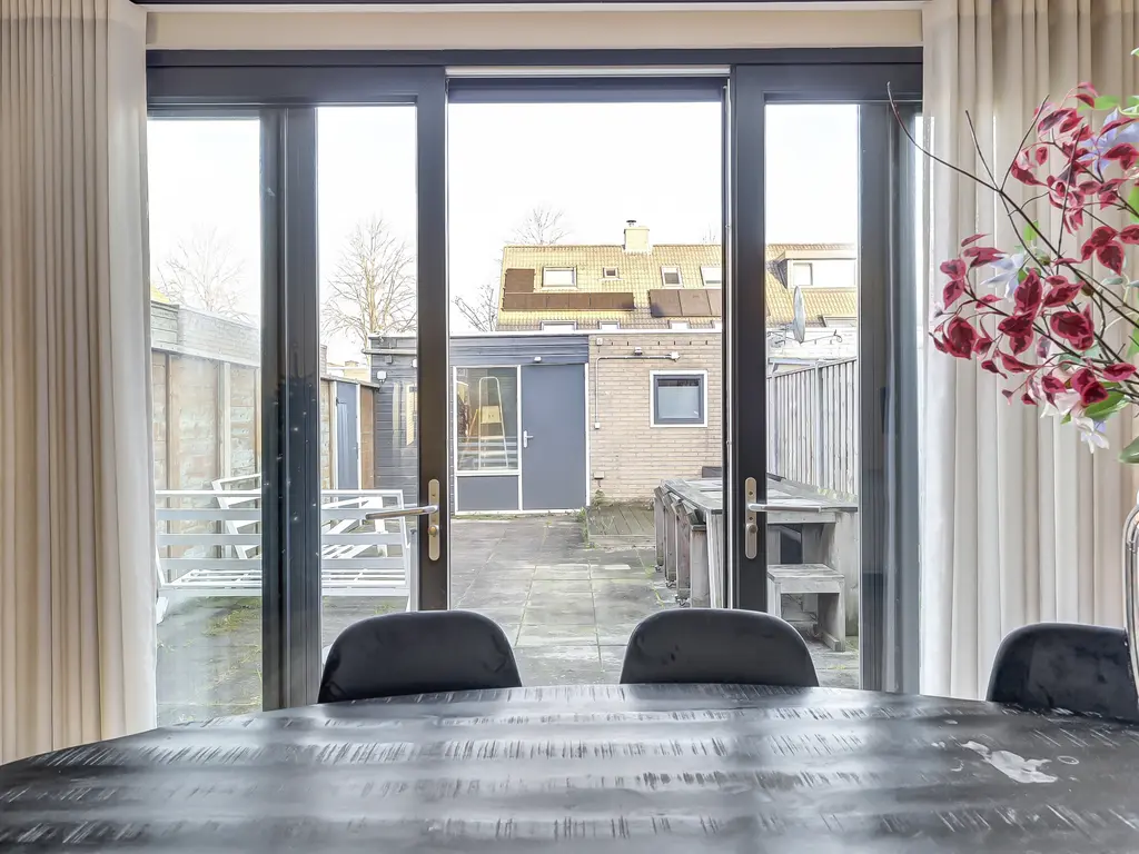 Begane grond: Entree/hal met meterkast, modern zwevend toilet en trapopgang naar de eerste verdieping. De ruime, tuingerichte woonkamer is uitgebouwd en voorzien van een lichtstraat, wat zorgt voor een prettige lichtinval. De woonkamer is afgewerkt met een laminaatvloer met voerverwarming en nette wandafwerking en biedt via een kunststof schuifpui toegang tot de diepe achtertuin. De tuin beschikt over een stenen berging en een achterom.