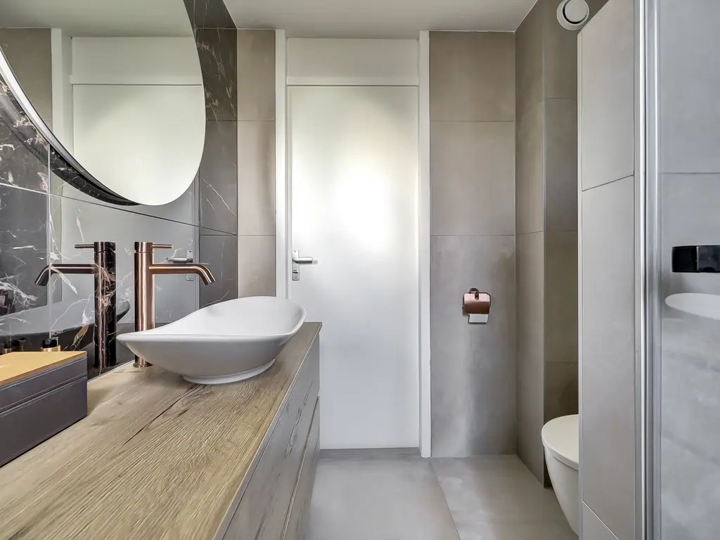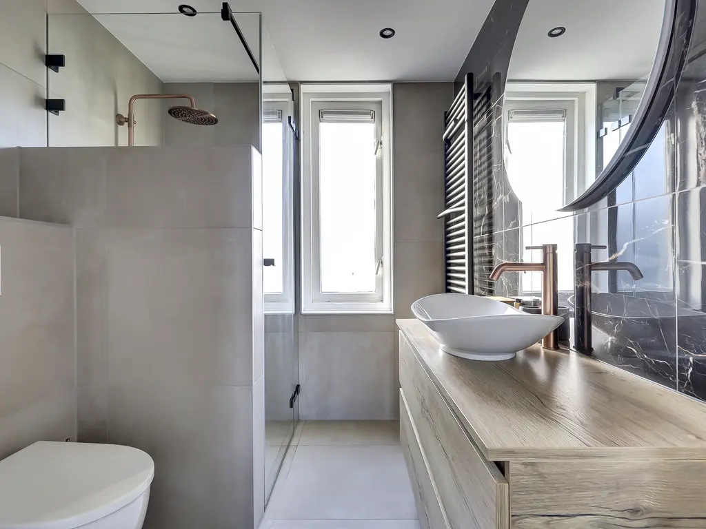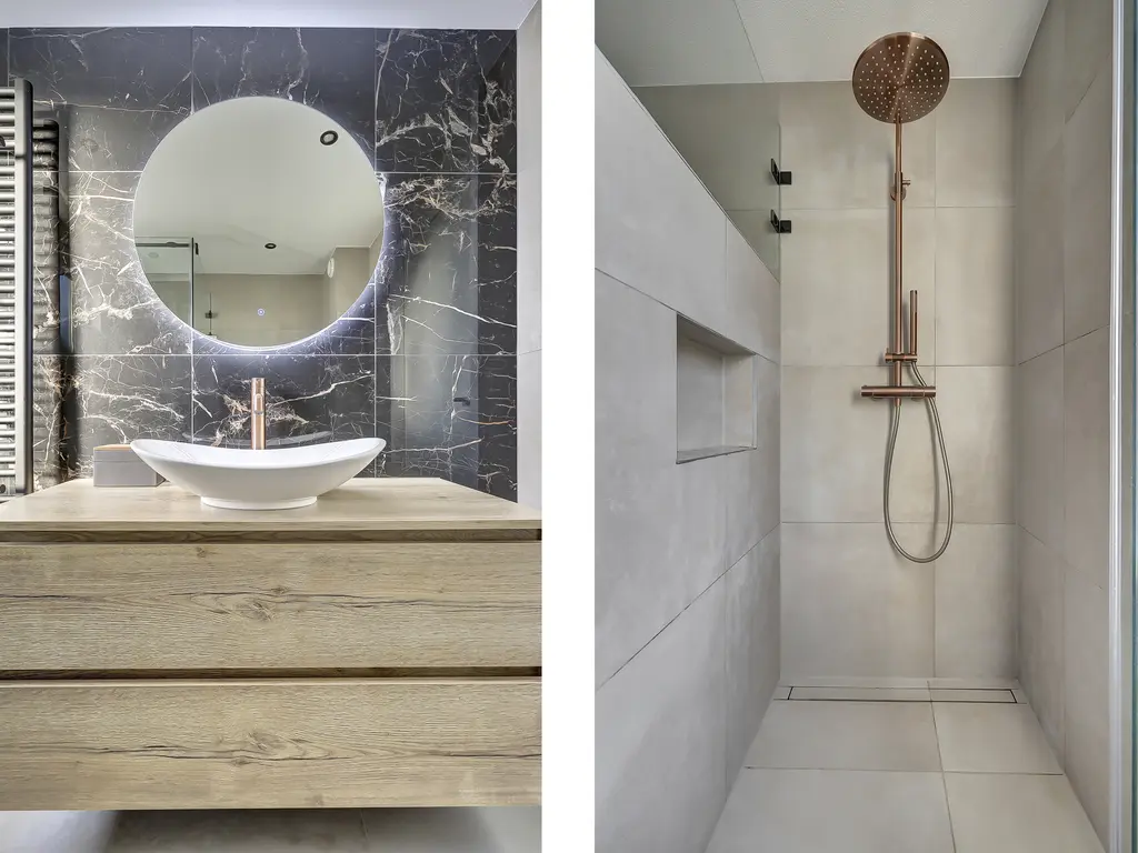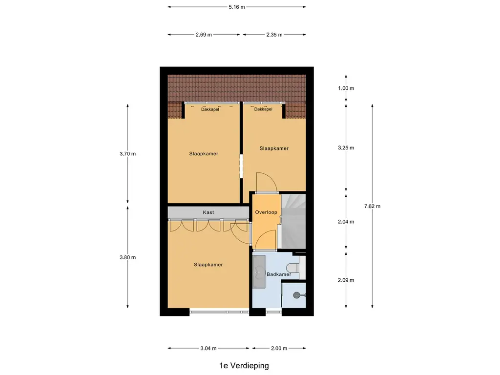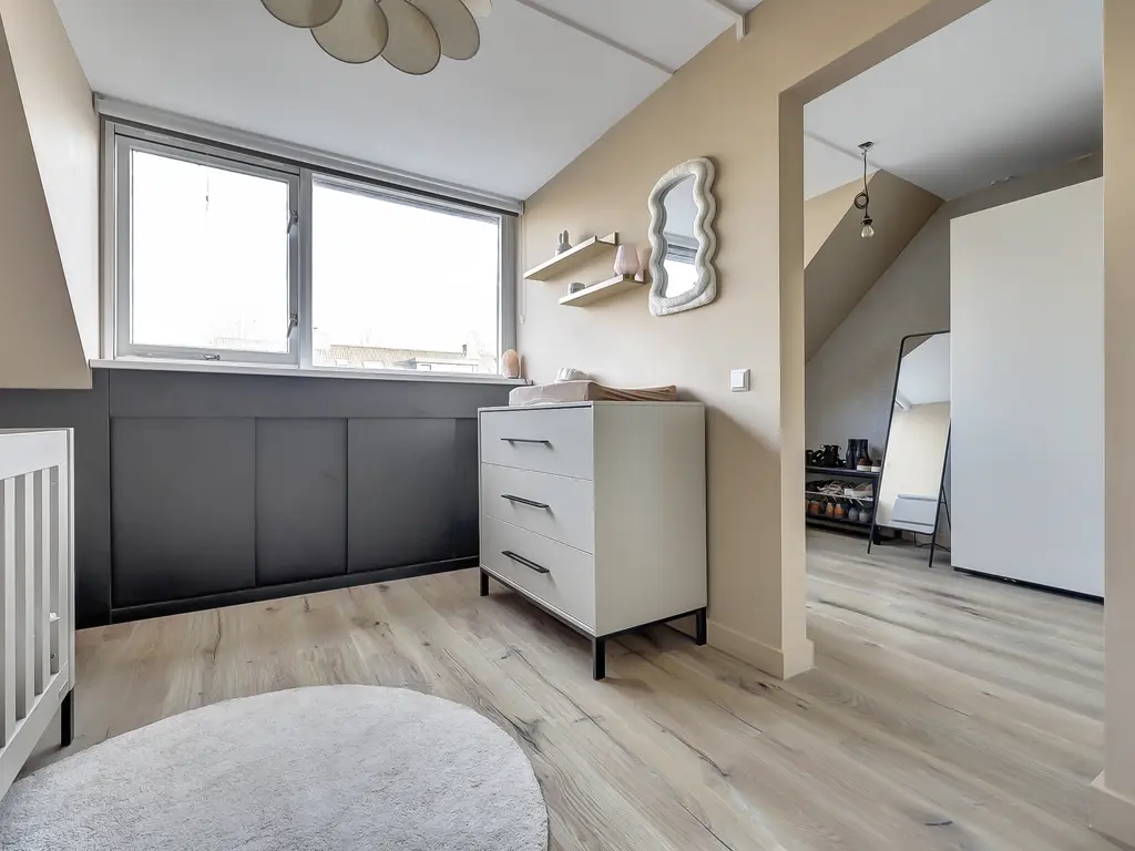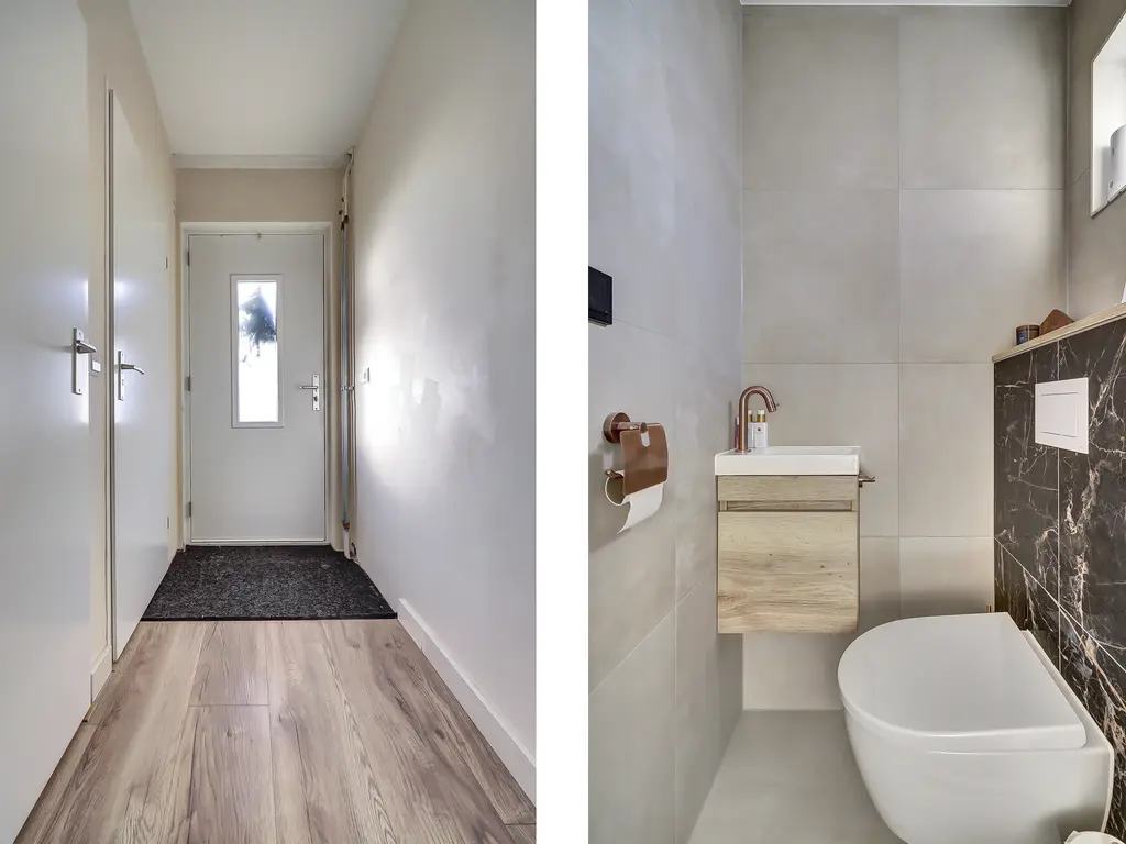 Eerste verdieping: Overloop met toegang tot drie slaapkamers, allen voorzien van een laminaatvloer. De twee slaapkamers aan de achterzijde beschikken over een dakkapel. De moderne, volledig betegelde badkamer (2023) is uitgerust met een inloopdouche, een fraai wastafelmeubel met houten afwerking en een tweede toilet.