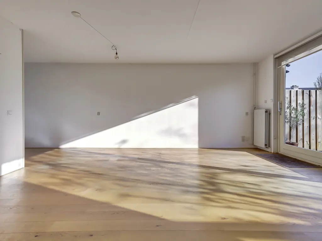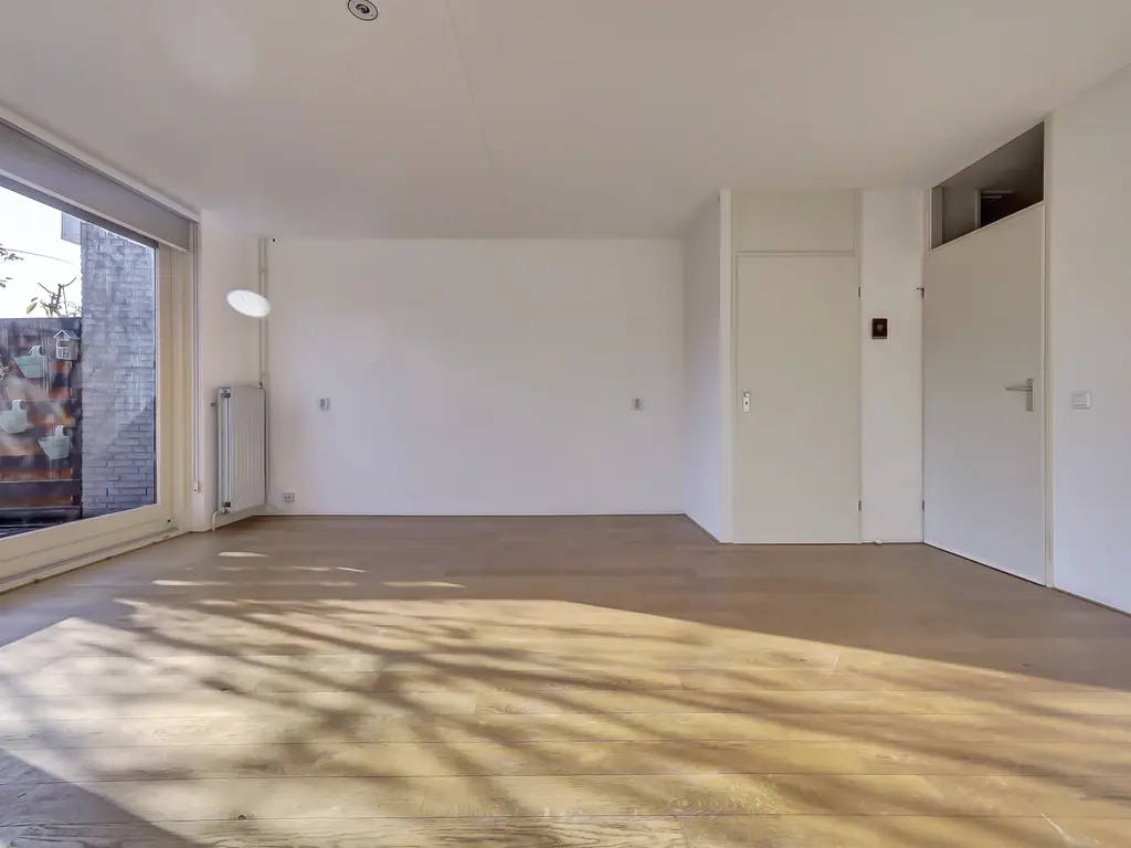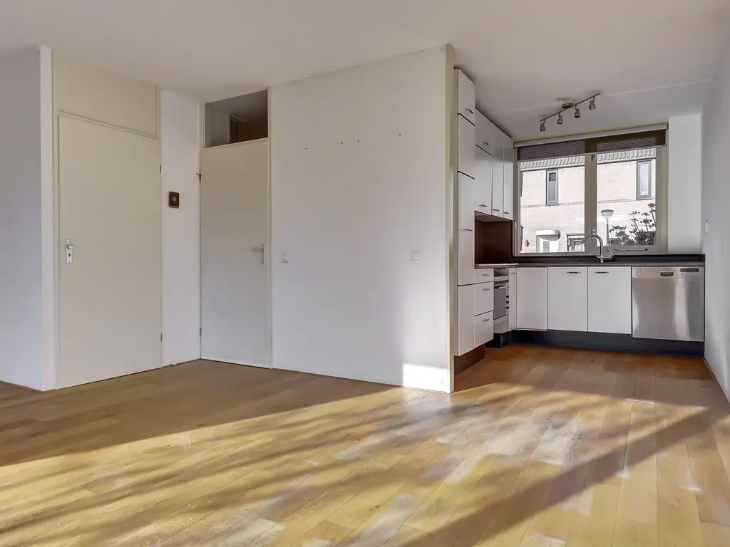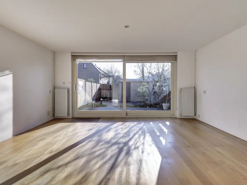 Begane grond: Entree/hal met toilet, meterkast en trap naar de 1e verdieping. Tuingerichte woonkamer met trapkast, brede hardhouten schuifpui en houten vloer met vloerverwarming. Open keuken in L-opstelling met combimagnetron, kookplaat, afzuigkap en vaatwasser.