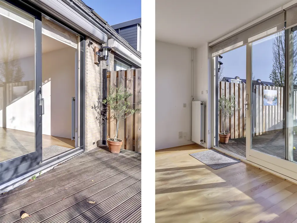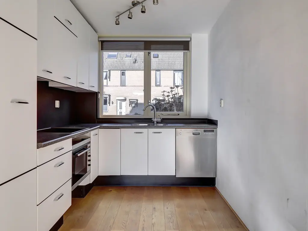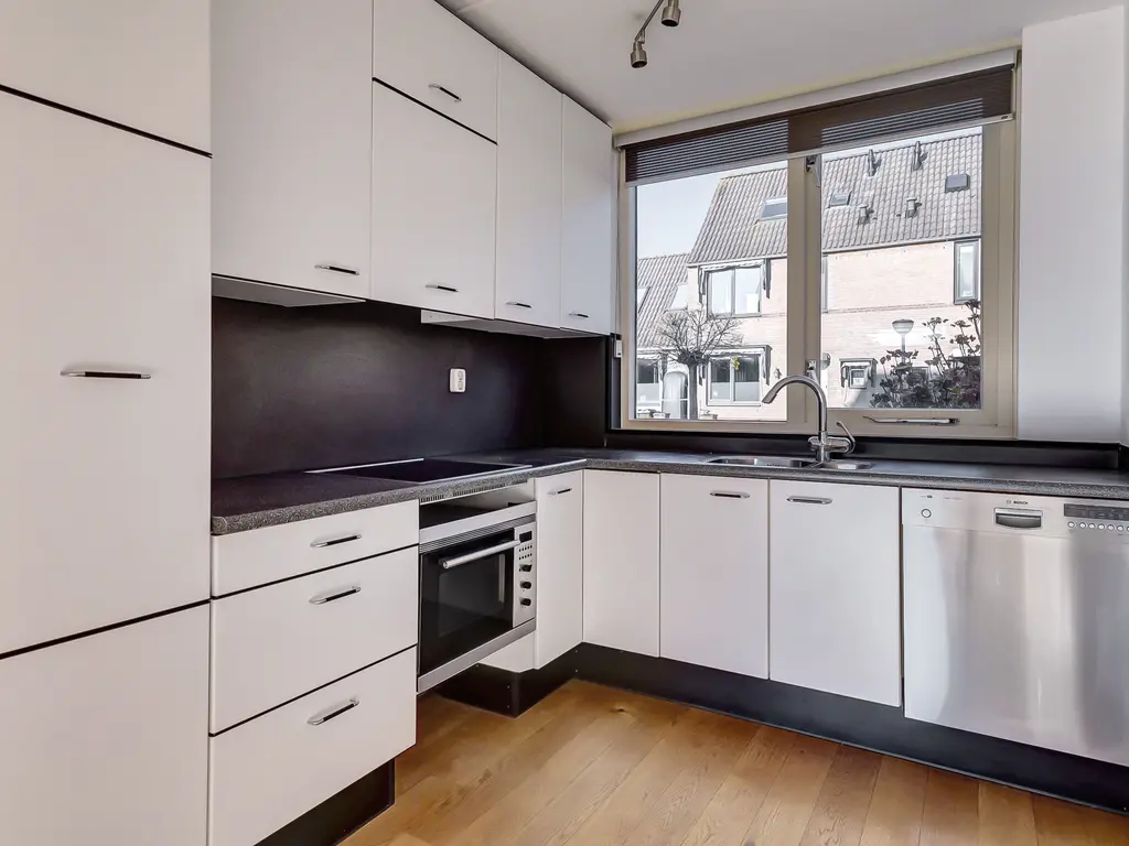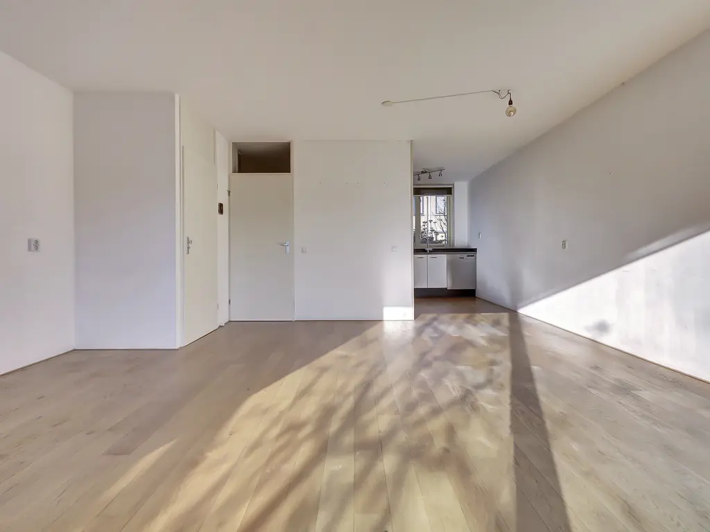 Begane grond: Entree/hal met toilet, meterkast en trap naar de 1e verdieping. Tuingerichte woonkamer met trapkast, brede hardhouten schuifpui en houten vloer met vloerverwarming. Open keuken in L-opstelling met combimagnetron, kookplaat, afzuigkap en vaatwasser.