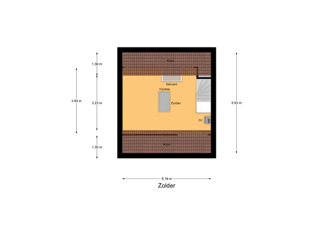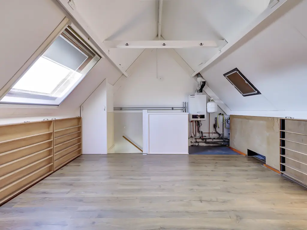 2e verdieping: Grote, open zolder met dakraam, CV-opstelling (Nefit 2015) en aansluitingen voor wasmachine/droger. Mogelijkheid voor een 4e slaapkamer.