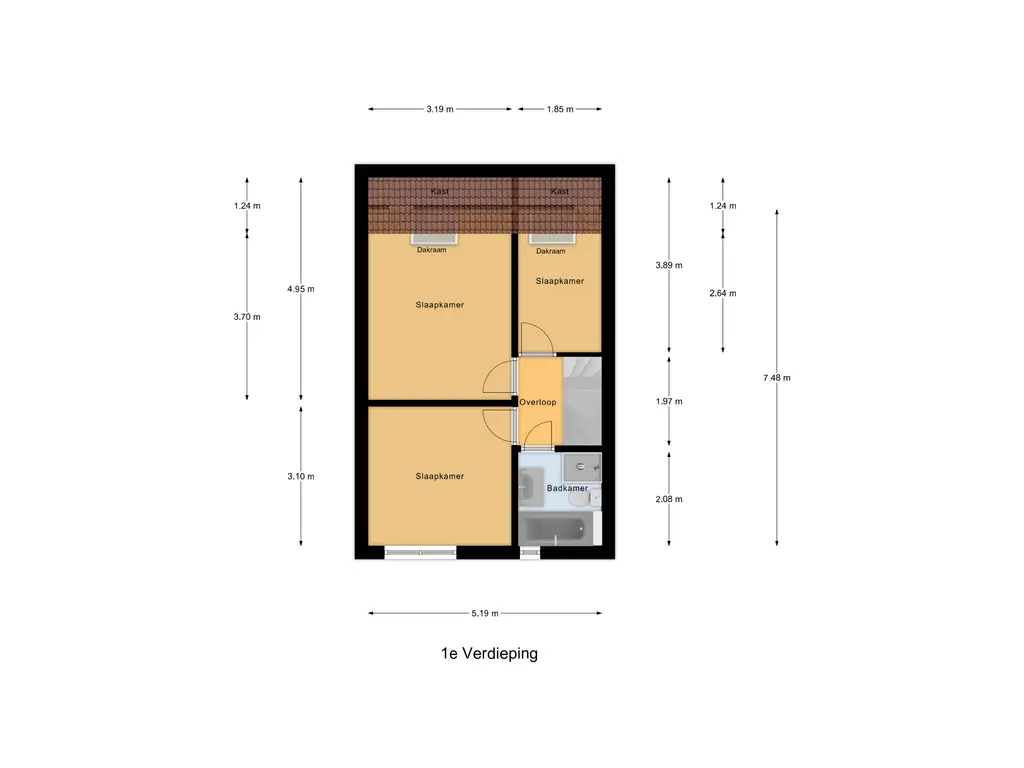 1e verdieping: Overloop welke toegang biedt tot de drie slaapkamers (2 achter, 1 voor) en badkamer met ligbad, douche, 2e toilet en wastafel.