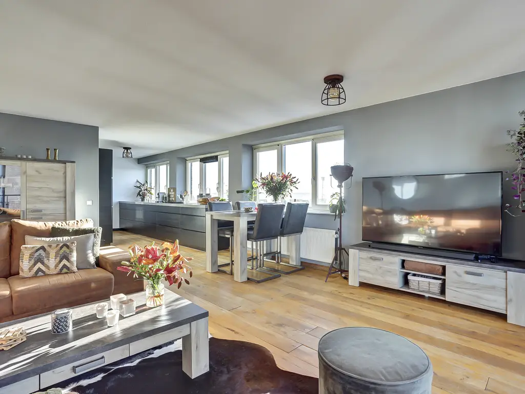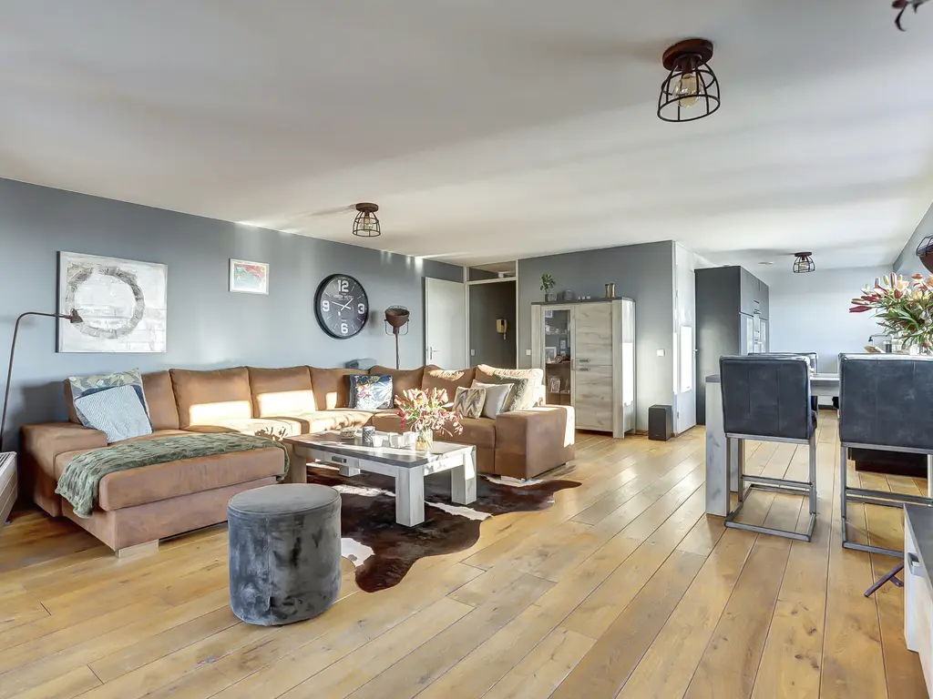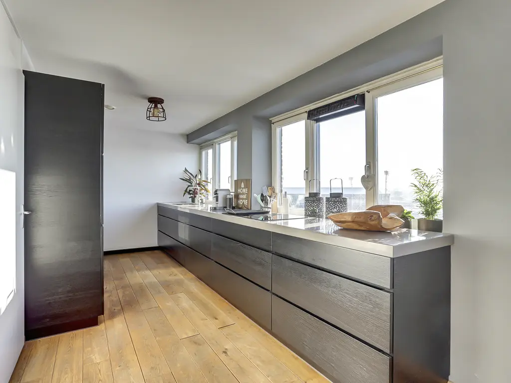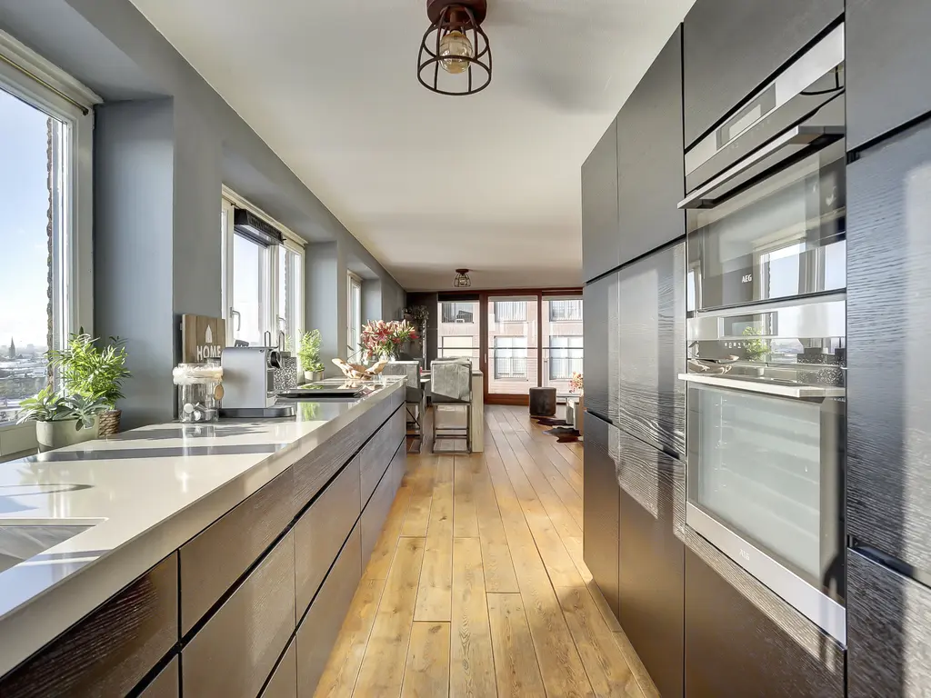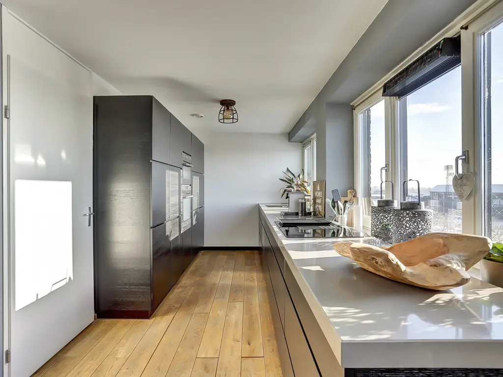 De royale woonkamer is een fijne plek om te ontspannen, met grote ramen, een prettige lichtinval en directe toegang tot het ruime balkon. De moderne open keuken (2020) is uitgevoerd in een strakke dubbele wandopstelling en voorzien van alle gewenste inbouwapparatuur: een inductiekookplaat met geïntegreerde afzuiging en grillplaat, vaatwasser, koelkast, vriezer, oven én combi-oven. Koken met uitzicht was nog nooit zo leuk! Het gehele appartement is afgewerkt met een fraaie houten vloer die zorgt voor een warme en luxe uitstraling.