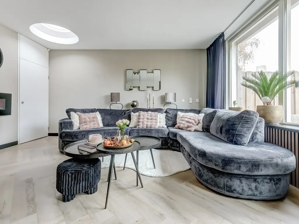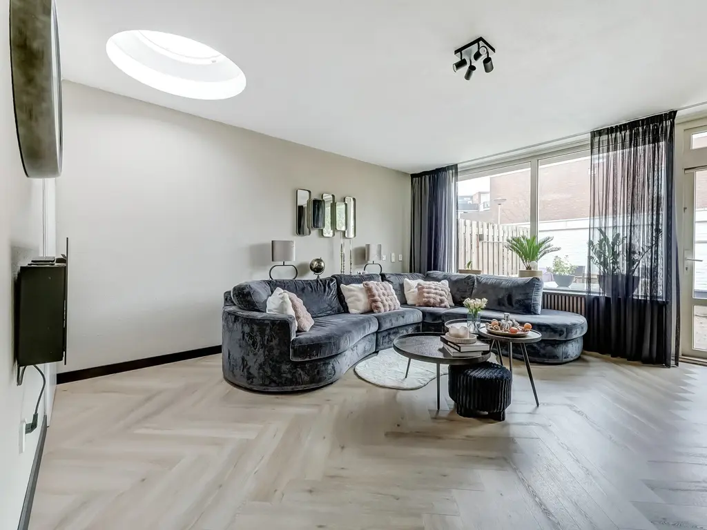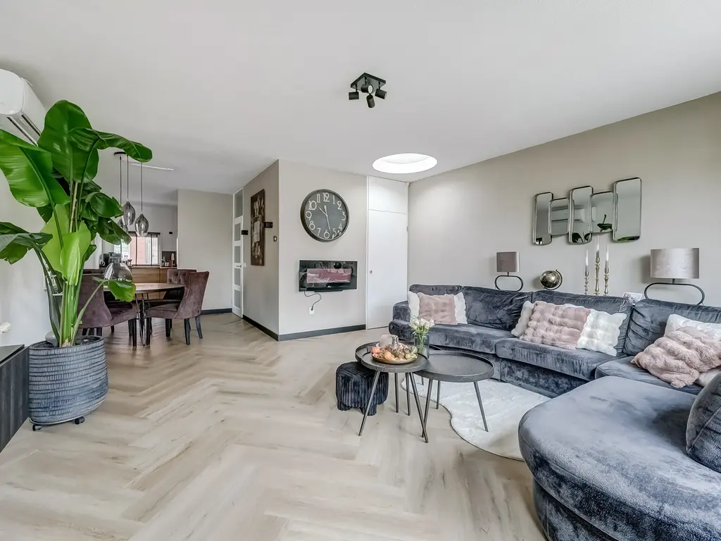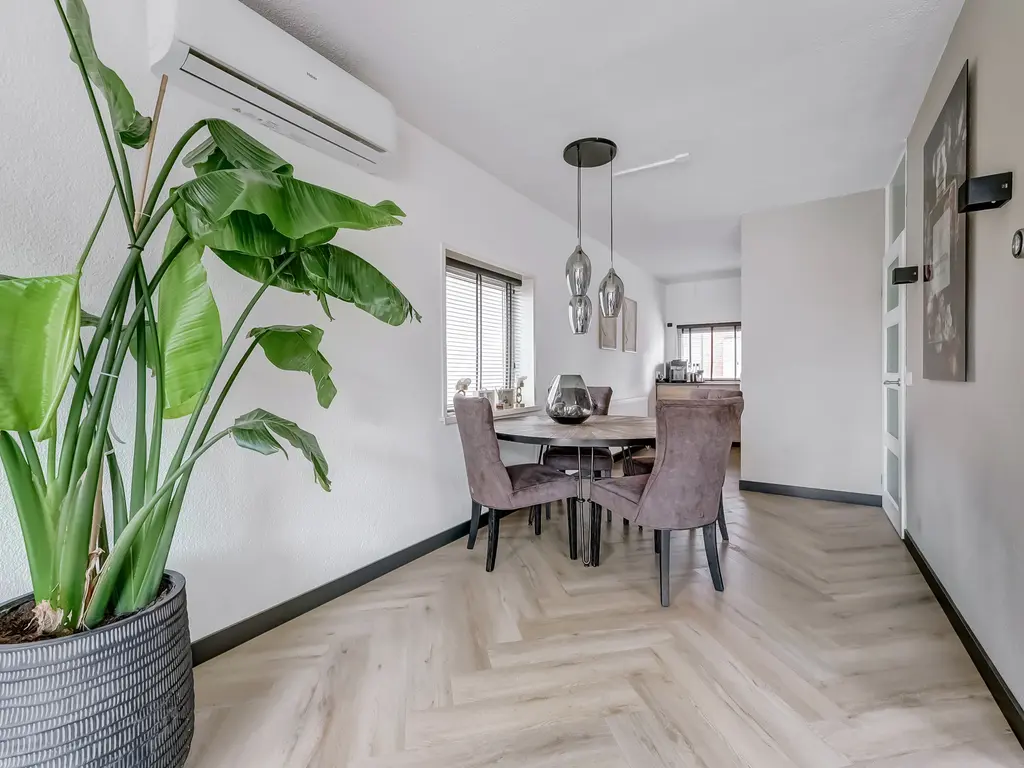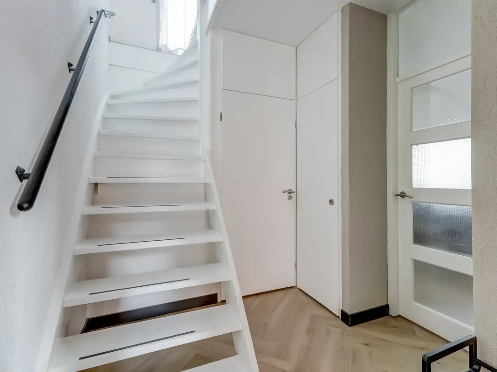 Begane grond: Via de nette entree/hal, met modern toilet, meterkast en trapopgang, kom je binnen in de lichte en ruime woonkamer. Dankzij de lichtkoepel en de stijlvolle PVC-visgraatvloer voelt deze ruimte warm en eigentijds aan. De airconditioning zorgt het hele jaar door voor een aangename temperatuur, of je nu wilt koelen of verwarmen. Via de achterdeur bereik je de zonnige achtertuin op het westen, compleet met stenen berging en achterom.
