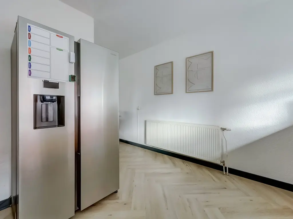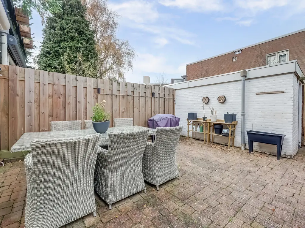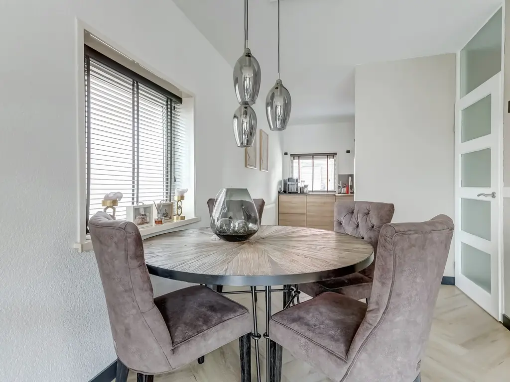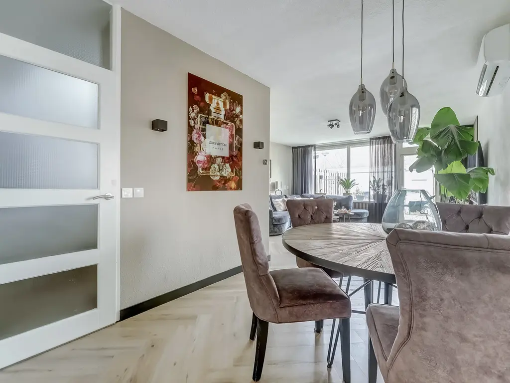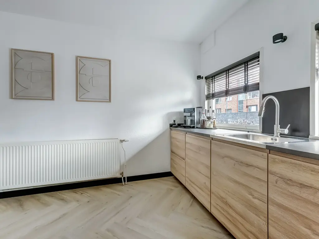 Begane grond: Via de nette entree/hal, met modern toilet, meterkast en trapopgang, kom je binnen in de lichte en ruime woonkamer. Dankzij de lichtkoepel en de stijlvolle PVC-visgraatvloer voelt deze ruimte warm en eigentijds aan. De airconditioning zorgt het hele jaar door voor een aangename temperatuur, of je nu wilt koelen of verwarmen. Via de achterdeur bereik je de zonnige achtertuin op het westen, compleet met stenen berging en achterom.