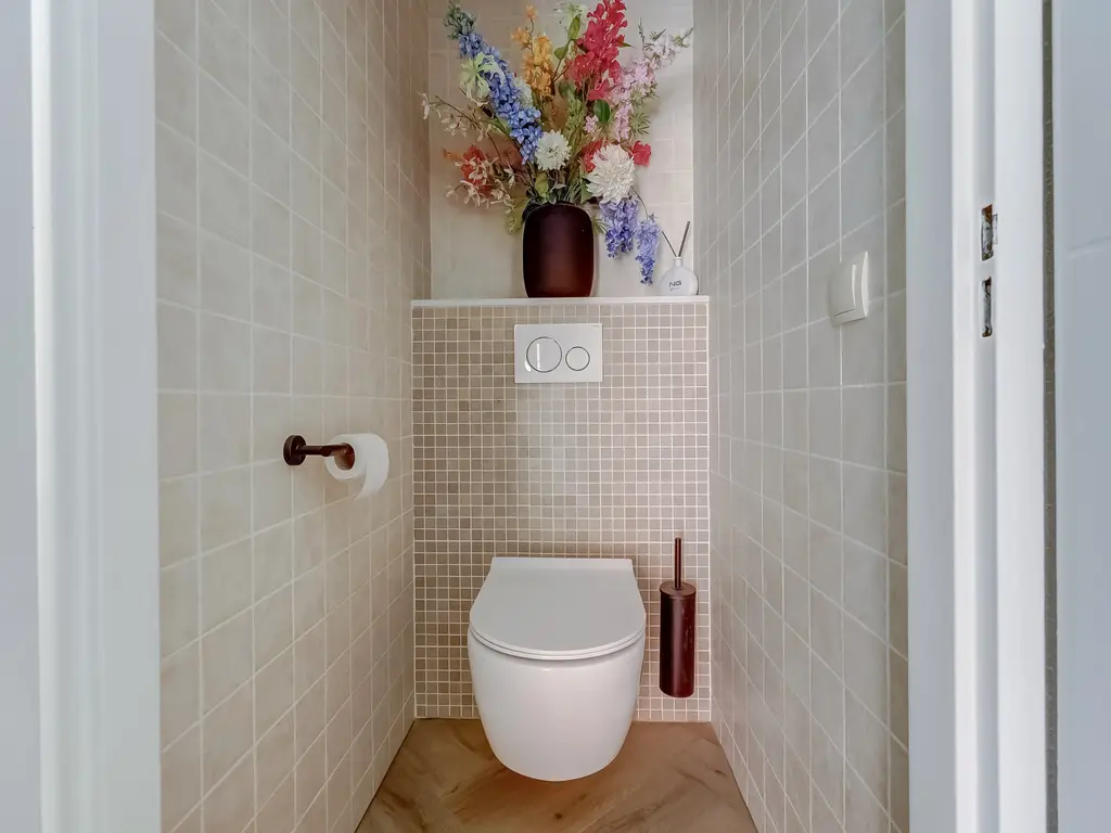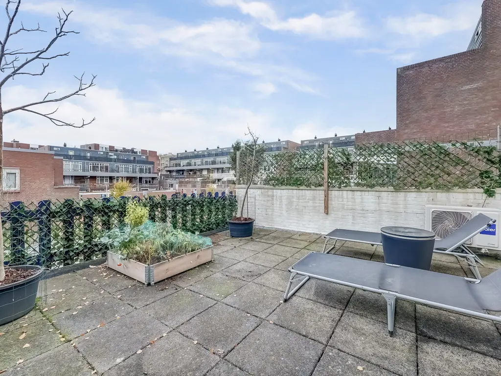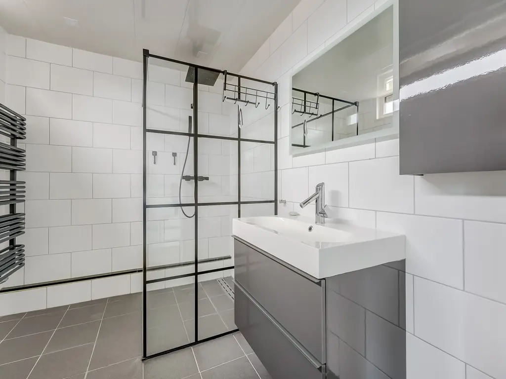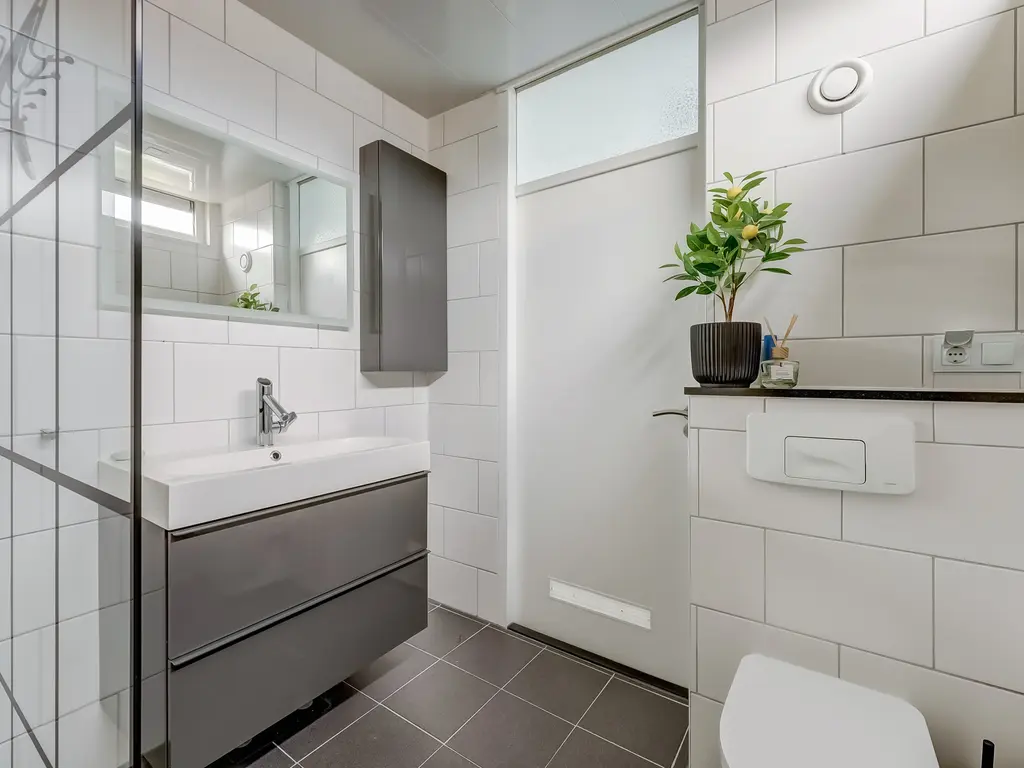 Eerste verdieping: De overloop geeft toegang tot een royale slaapkamer (voorheen twee kamers), de moderne badkamer en het heerlijke dakterras. De badkamer is strak afgewerkt en voorzien van een inloopdouche, tweede toilet, wastafelmeubel en designradiator.