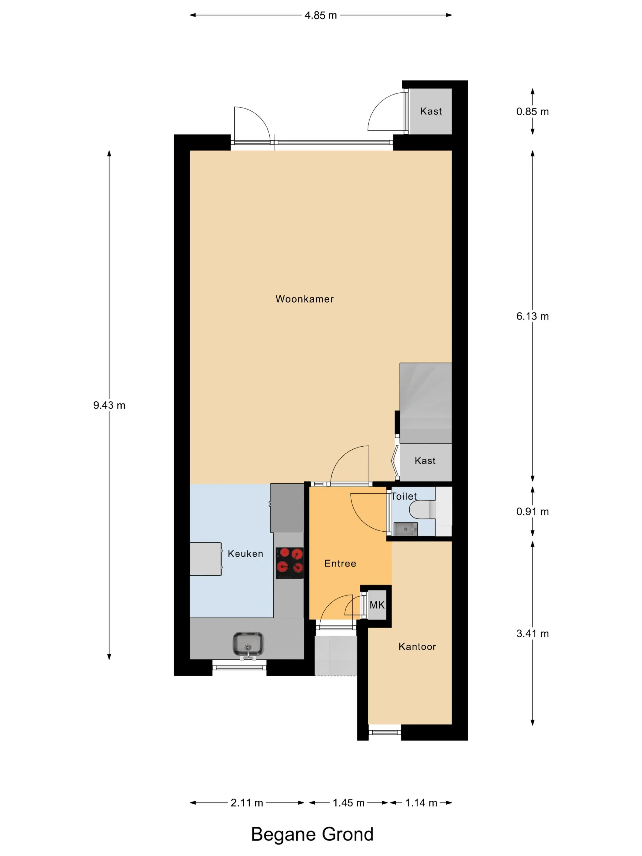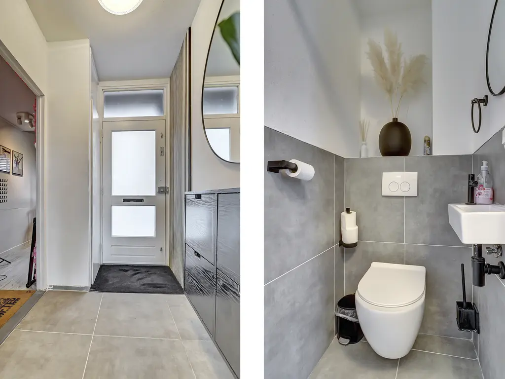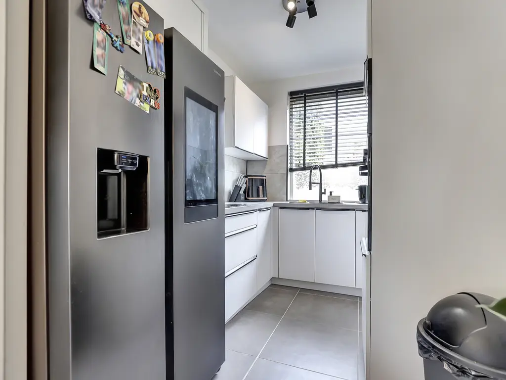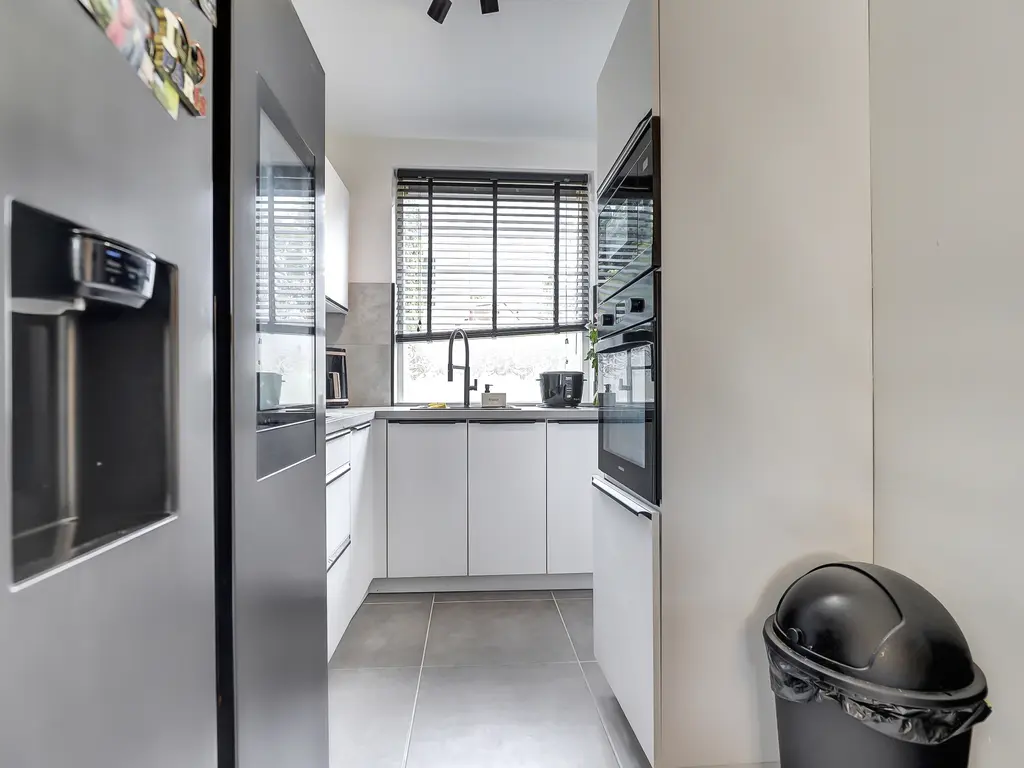 Begane grond: Entree met hal, meterkast en een modern zwevend toilet met fonteintje. Vanuit hier stap je de lichte, tuingerichte woonkamer binnen met trapkast, trapopgang en toegang tot de zonnige achtertuin met elektrisch zonnescherm en handige achterom. Aan de voorzijde bevindt zich de moderne halfopen keuken (2021) in hoekopstelling, voorzien van diverse inbouwapparatuur zoals een inductie kookplaat, oven, magnetron, vaatwasser, afzuigkap en Amerikaanse koelkast. Geheel verdieping is v.v. een tegelvloer met vloerverwarming.
