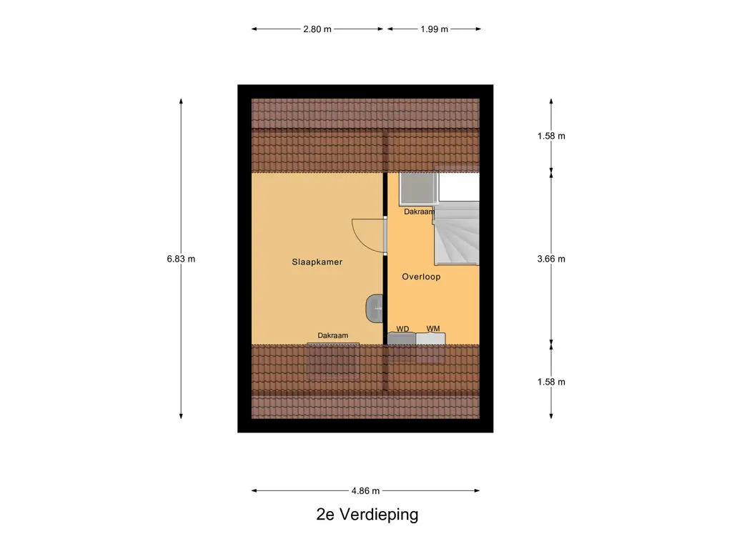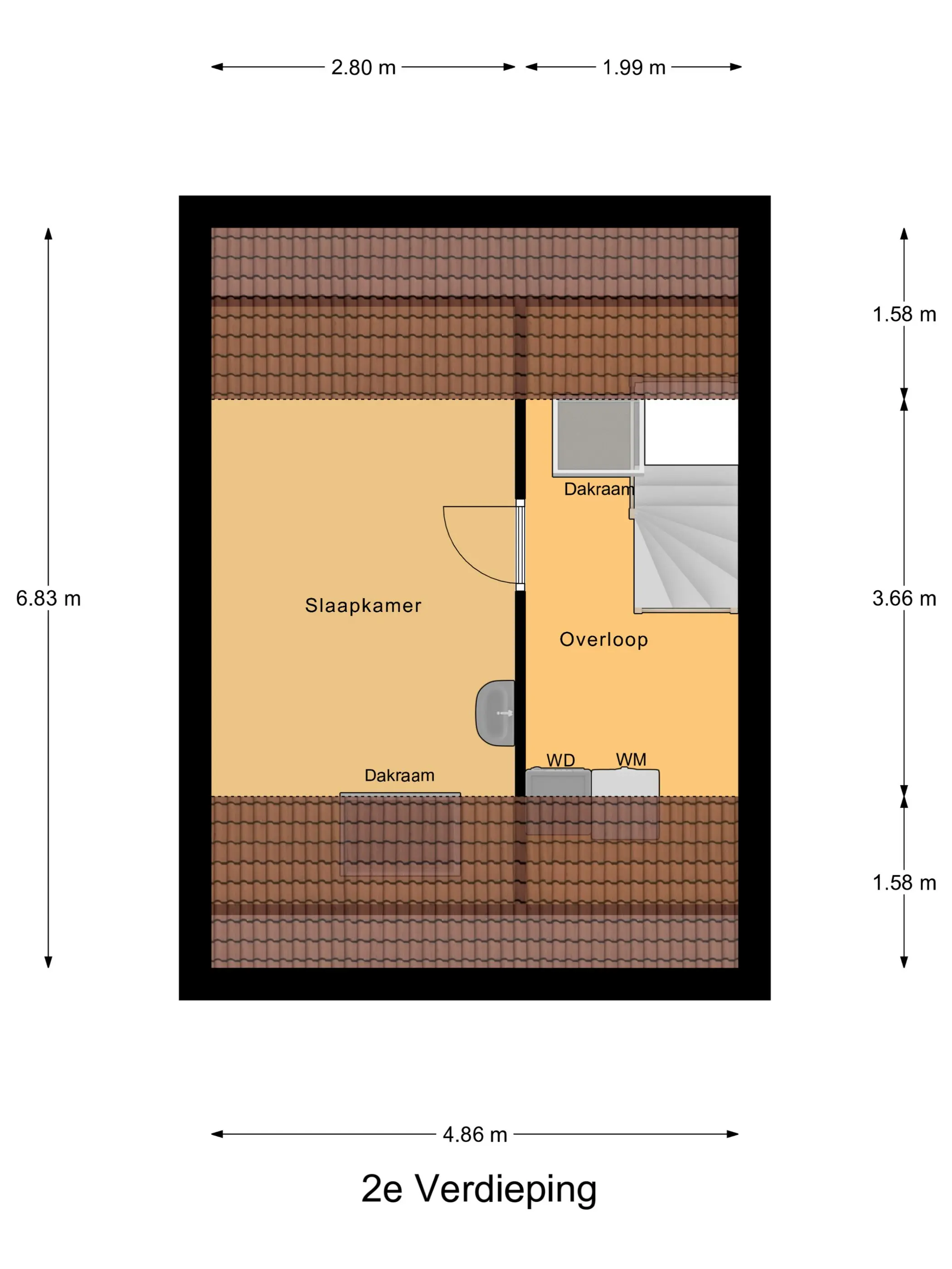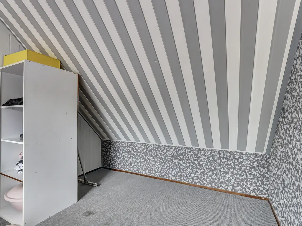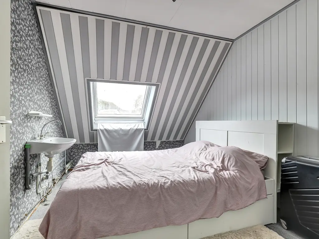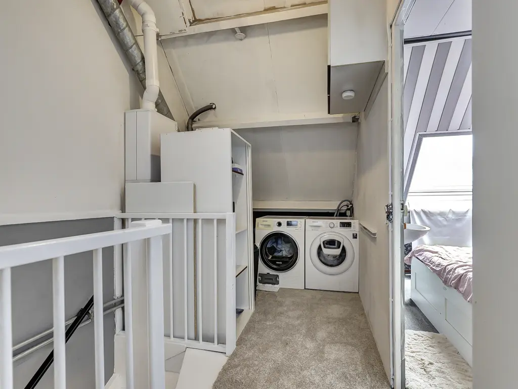 Tweede verdieping: Overloop met bergruimte, dakraam, opstelplaats CV-ketel (lease, €39,40 per maand), wasmachine- en drogeraansluiting en toegang tot de royale vierde slaapkamer met Velux dakraam.
