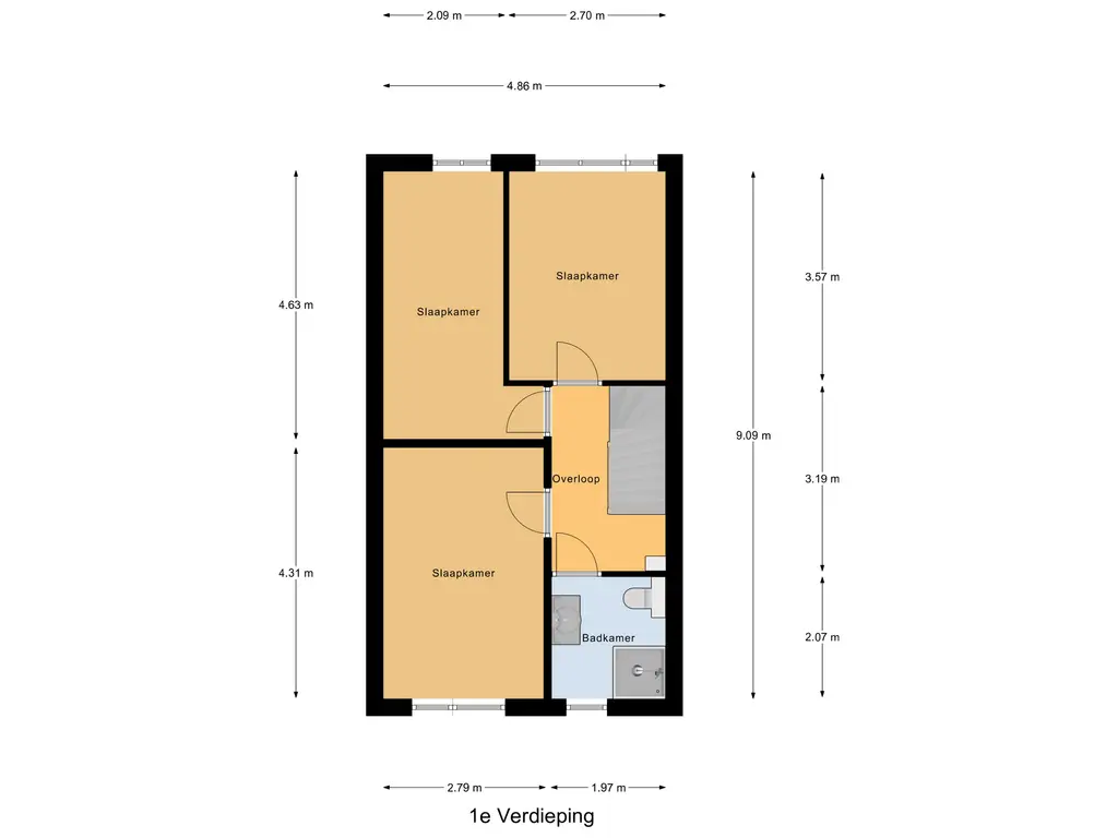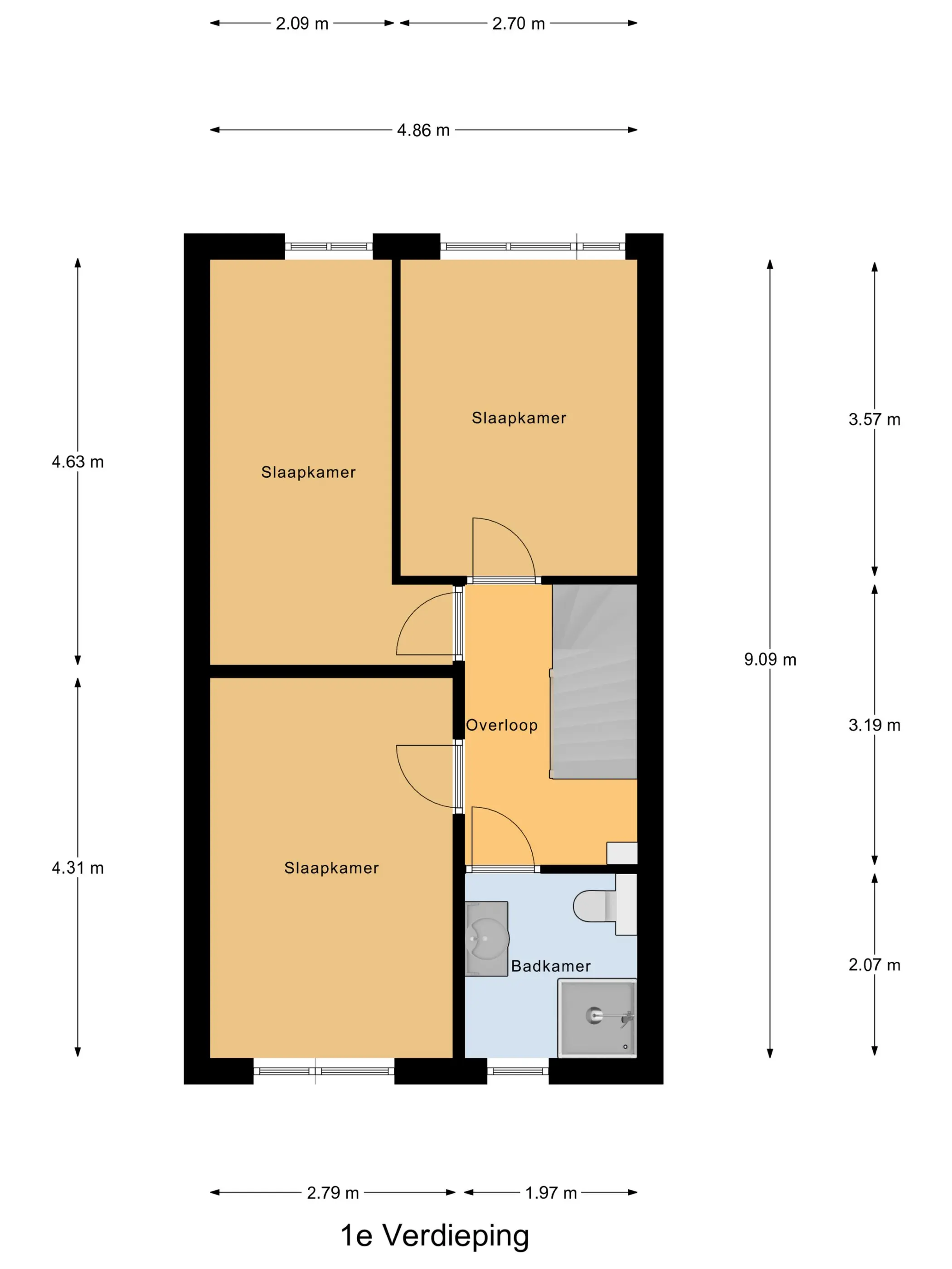 Eerste verdieping: Ruime overloop met toegang tot drie goed bemeten slaapkamers, allemaal met rechte gevels en kunststof kozijnen met HR++ glas. De moderne badkamer (2021) is volledig betegeld en uitgerust met een inloopdouche, tweede toilet en wastafel met meubel.
