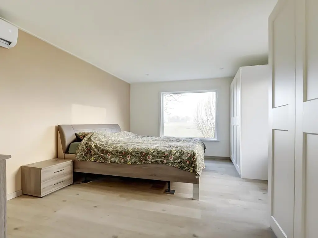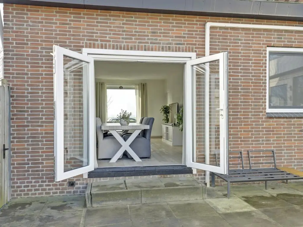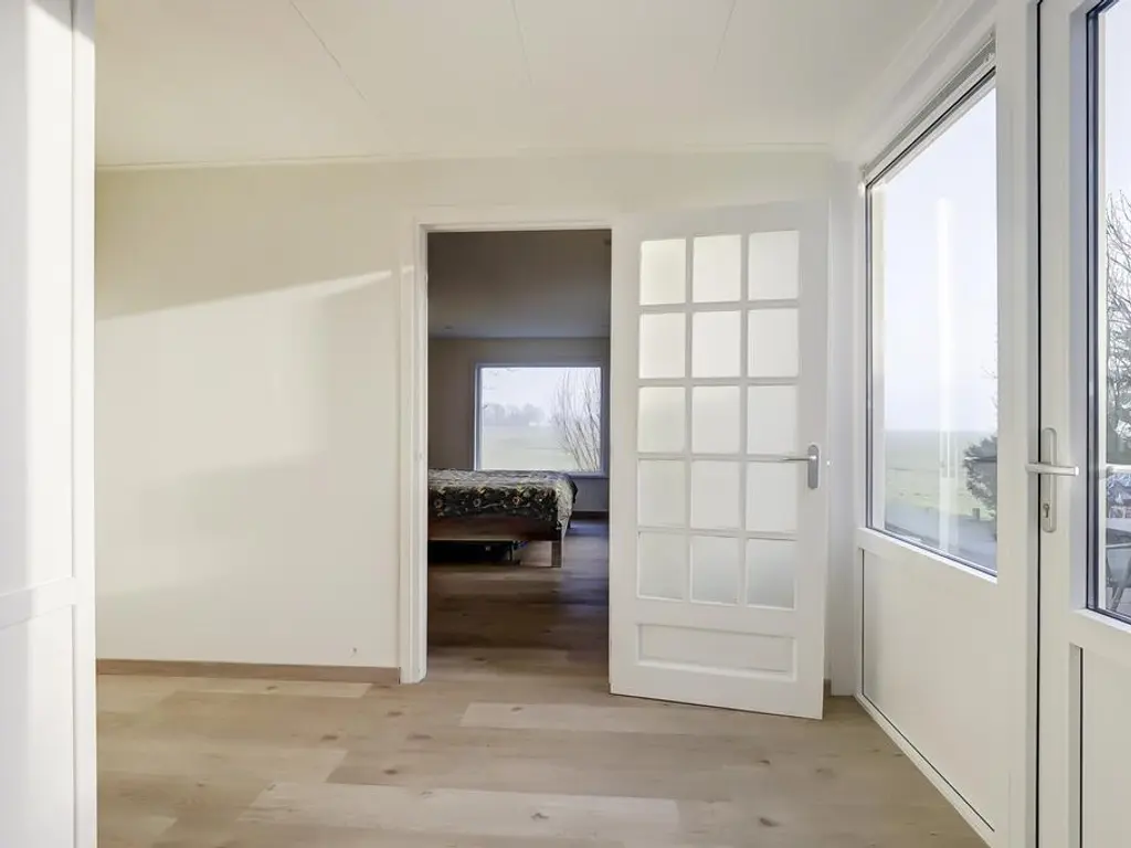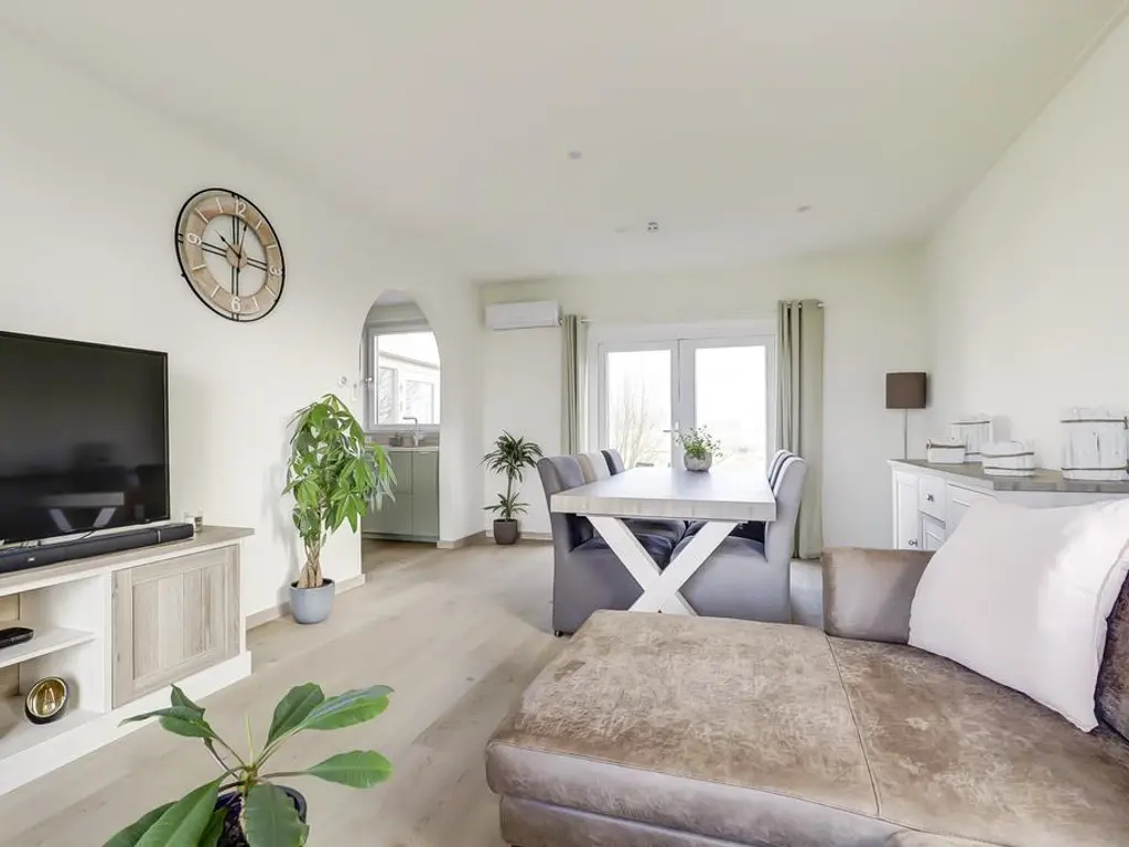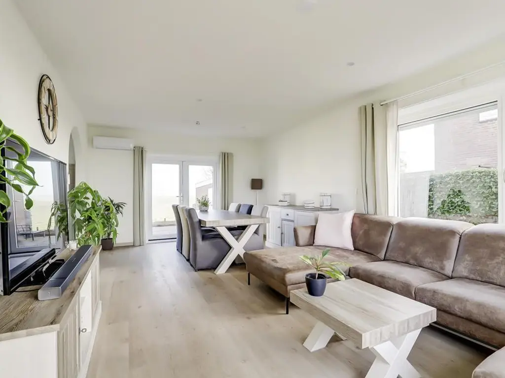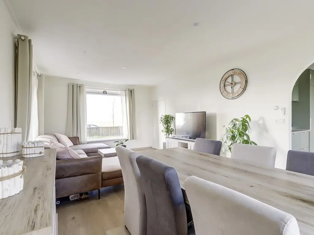 De royale woonkamer beschikt over grote raampartijen aan weerszijden, waardoor u optimaal kunt genieten van het prachtige polderlandschap. De ruimte is voorzien van een PVC vloer met vloerverwarming, strak afgewerkte wanden en openslaande deuren naar de riante tuin. De moderne open keuken (2024) biedt veel kastruimte dankzij de opstelling aan weerszijden en is uitgerust met luxe inbouwapparatuur waaronder een inductie kookplaat met geintegreegde afzuiging, vaatwasser, vriezer en koelkast.