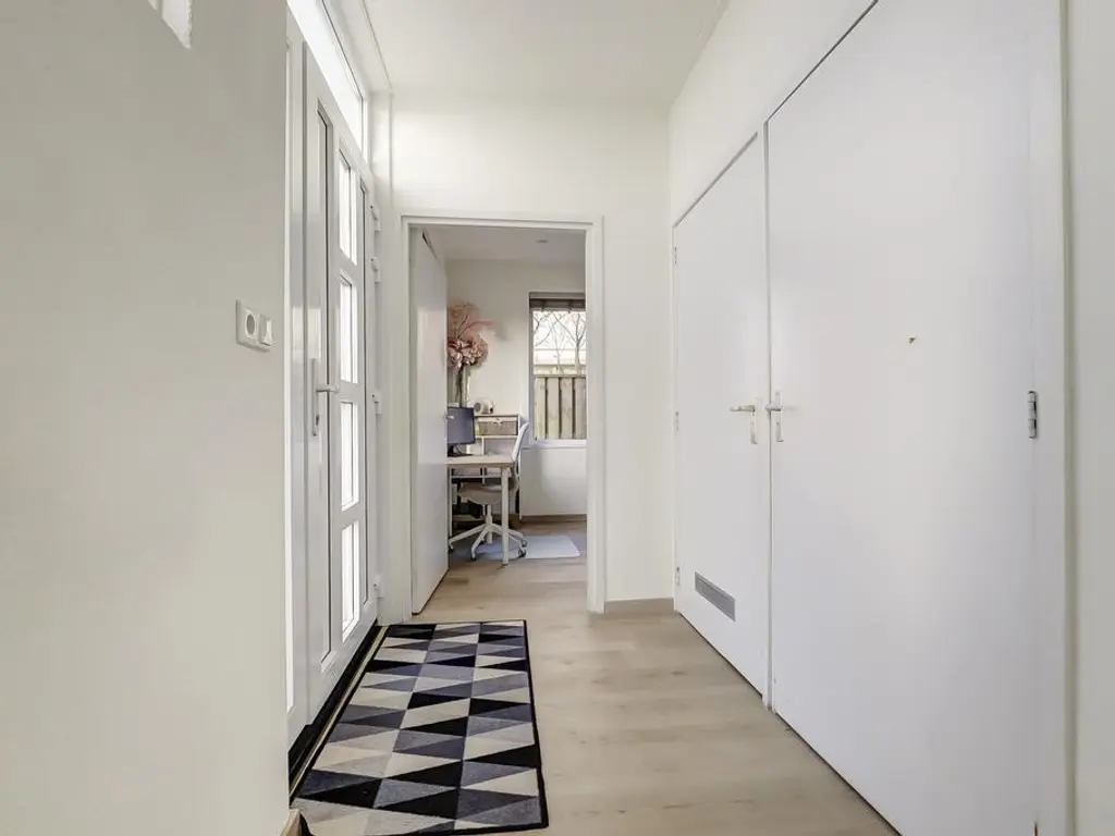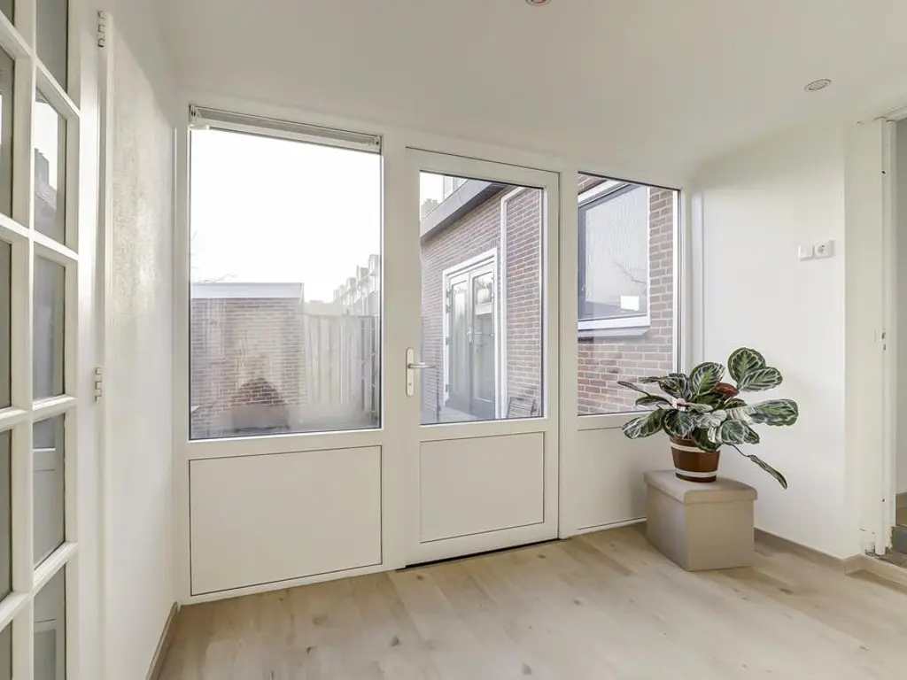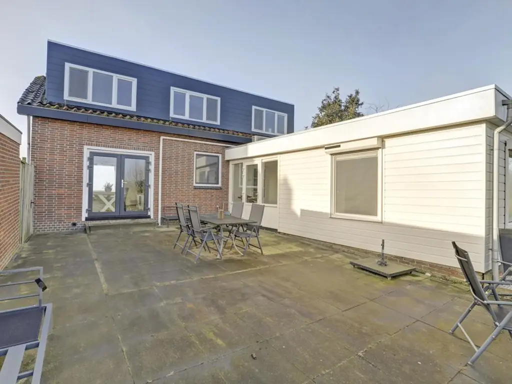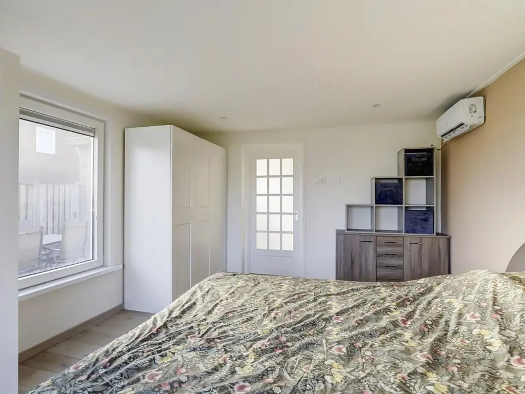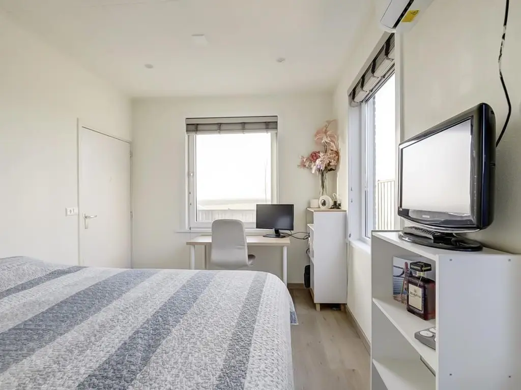 Aan de achterzijde van de woning bevindt zich een grote aanbouw met een extra hal en een ruime bijkeuken. Vanuit deze hal bereikt u de tweede royale slaapkamer op de begane grond, welke eveneens voorzien is van airconditioning.