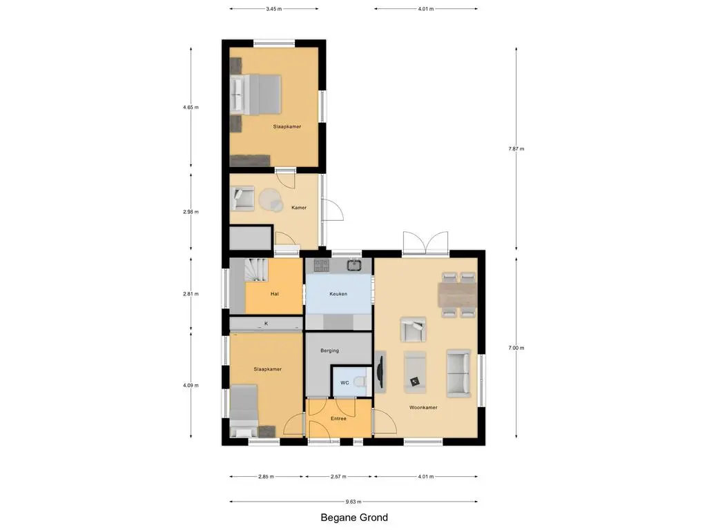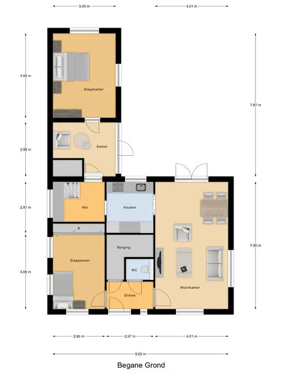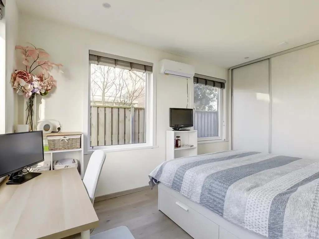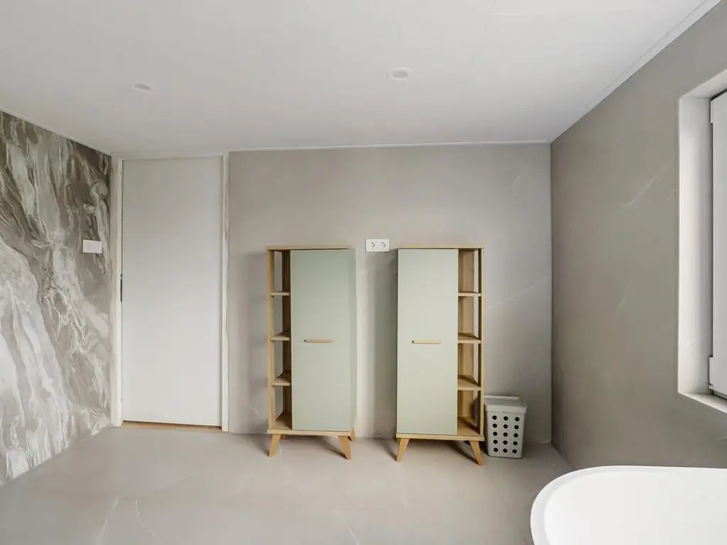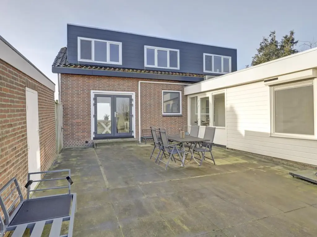 Aan de achterzijde van de woning bevindt zich een grote aanbouw met een extra hal en een ruime bijkeuken. Vanuit deze hal bereikt u de tweede royale slaapkamer op de begane grond, welke eveneens voorzien is van airconditioning.
