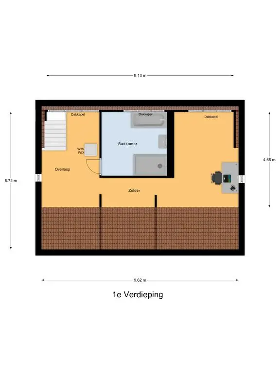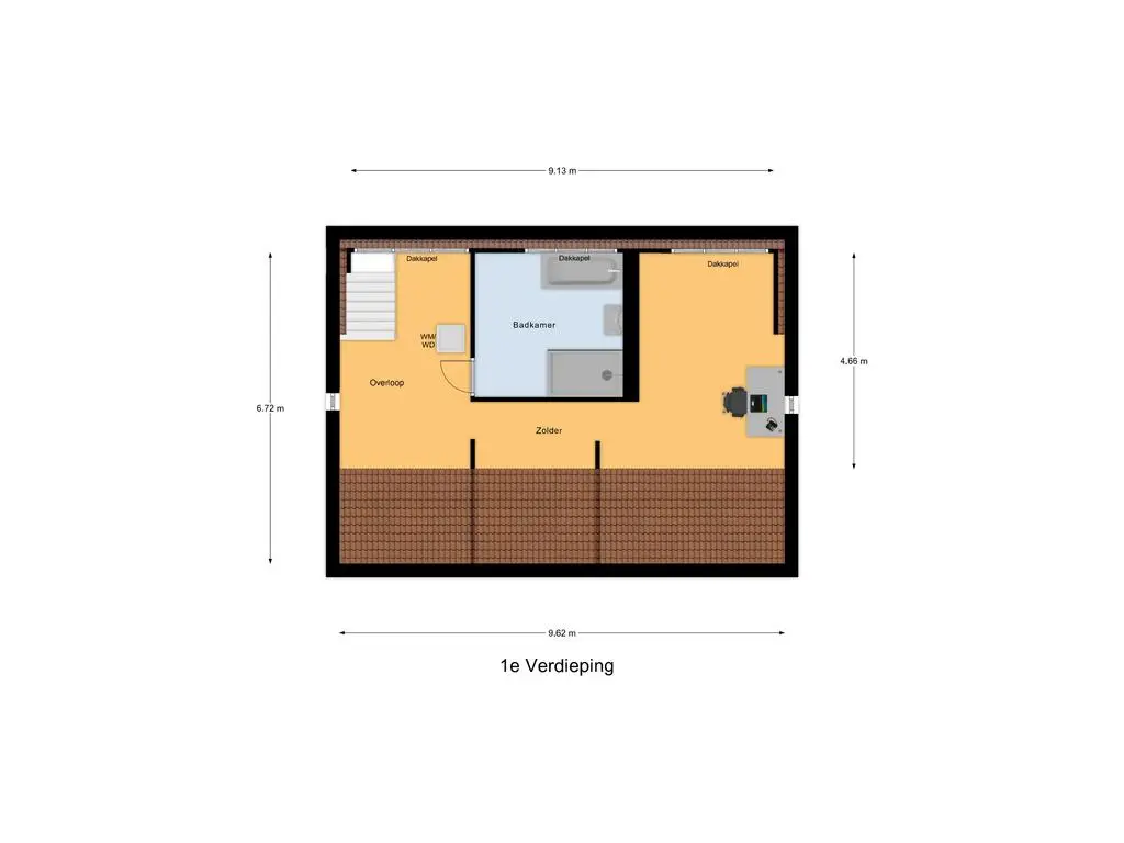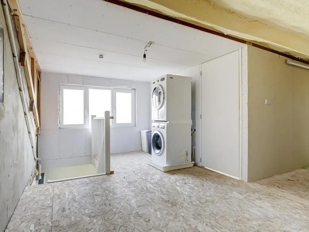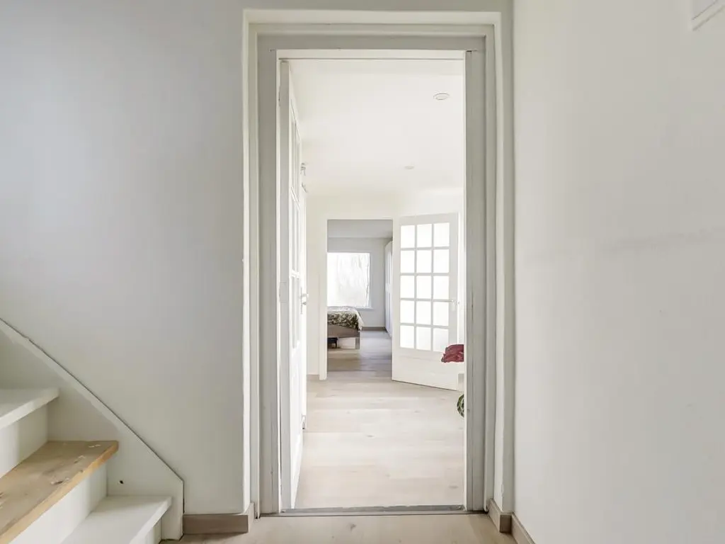 Via de trap bereikt u de eerste verdieping, waar zich de moderne badkamer (2024) bevindt. Deze is uitgerust met een inloopdouche, ligbad en wastafel met meubel. Daarnaast biedt deze verdieping de mogelijkheid om een derde slaapkamer te realiseren. Op de voorzolder bevindt zich nu de wasmachine en droger aansluiting.