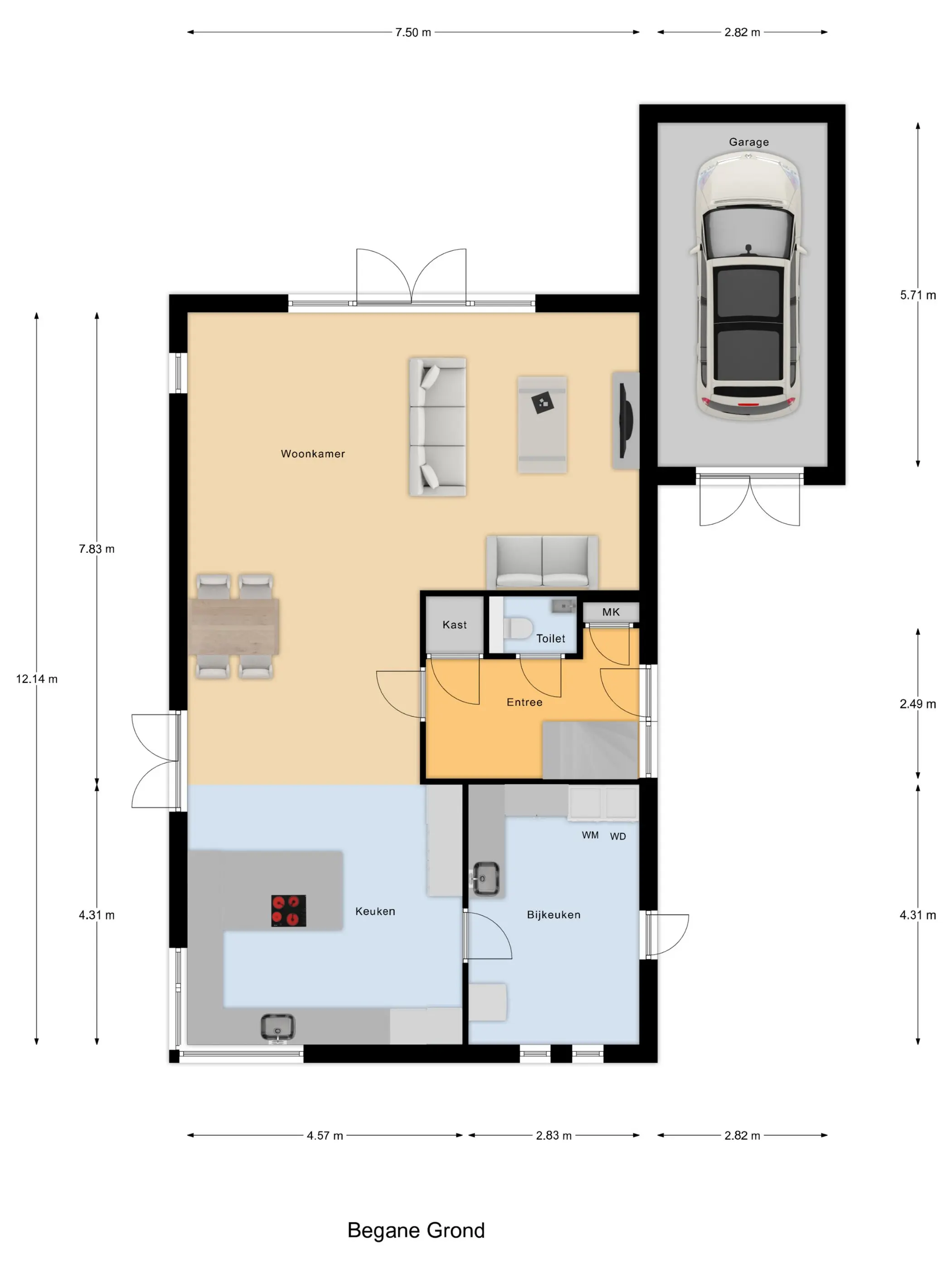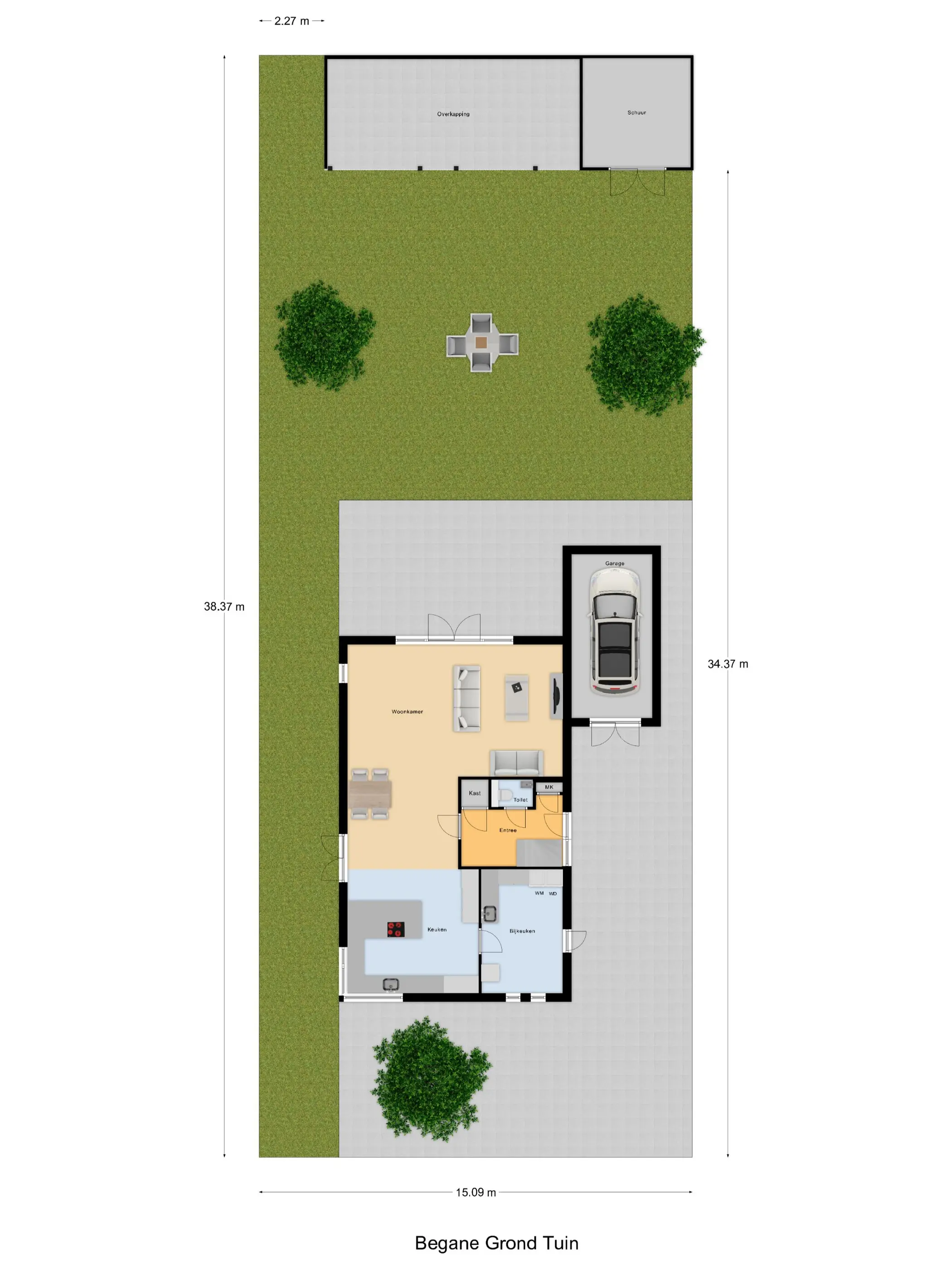 Aangebouwde garage met technische ruimte voor de lucht warmte pomp en boiler.