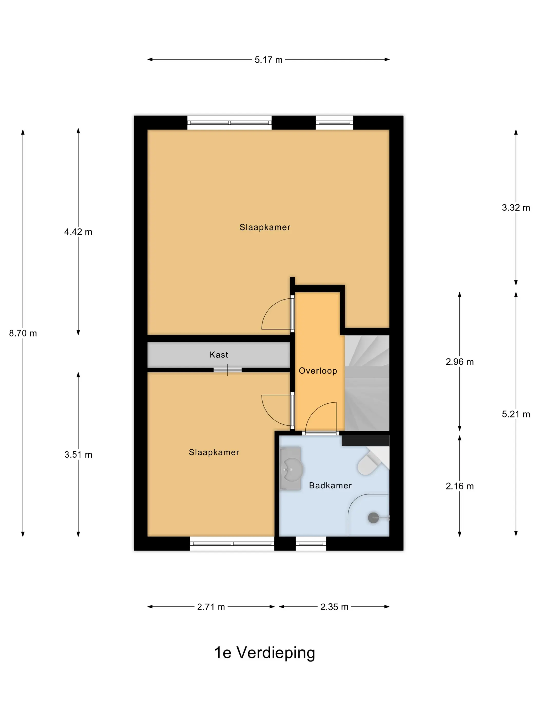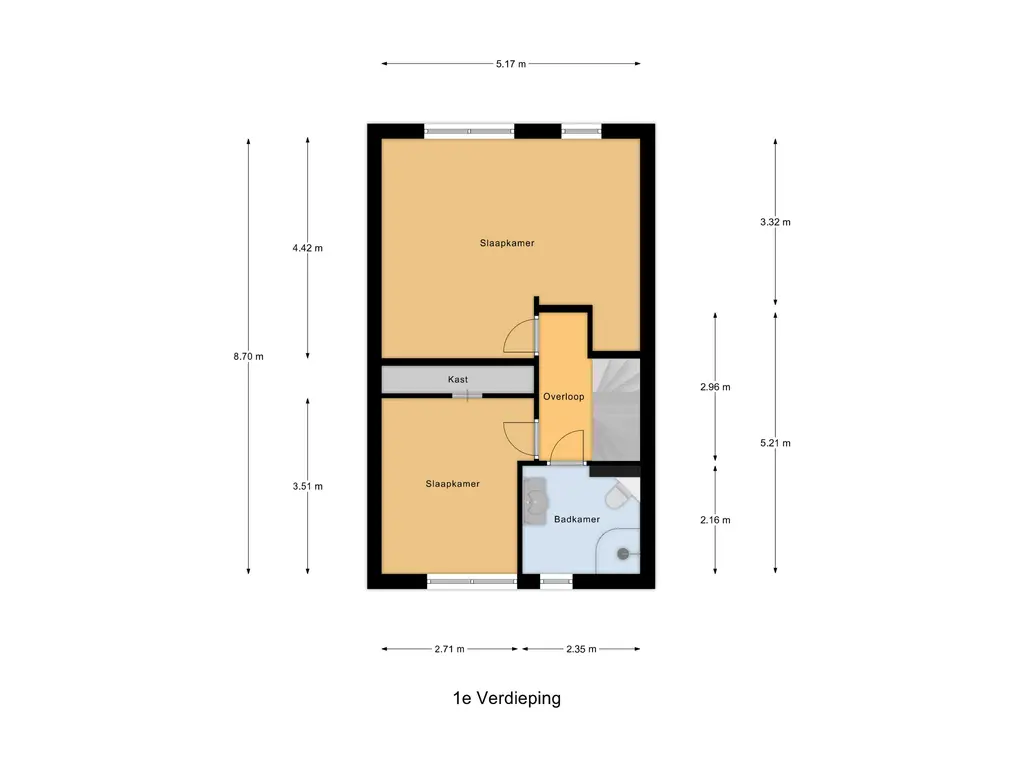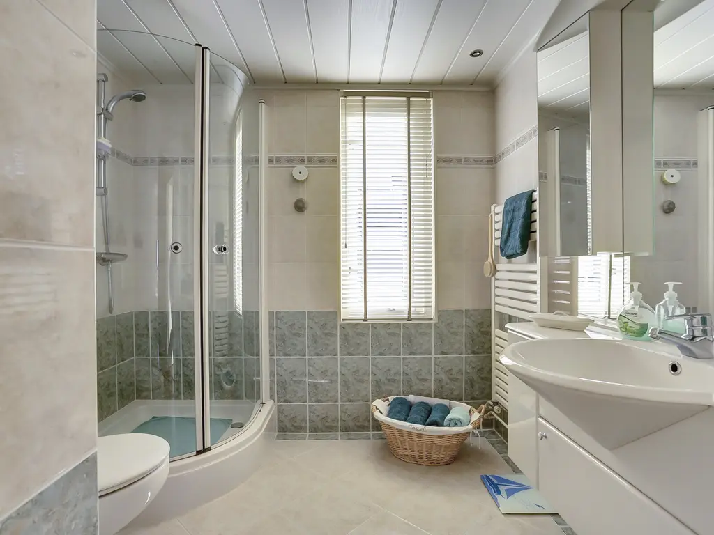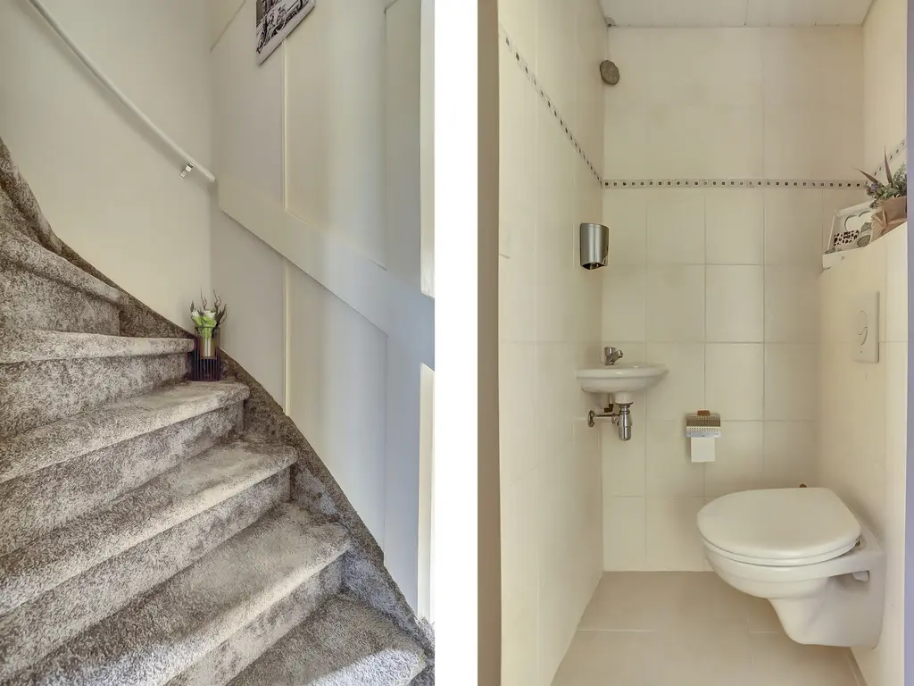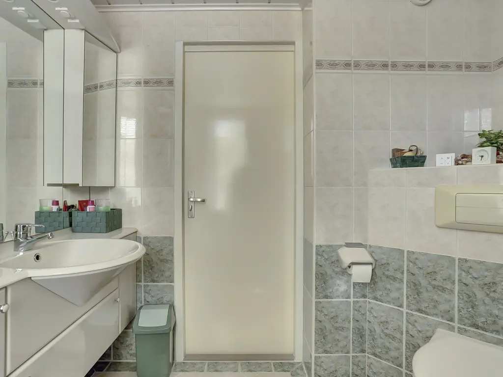 1e Verdieping: Overloop welke toegang biedt tot de 2 (voorheen 3) ruime slaapkamers met een rechte geveloptrek. De badkamer is tot bovenaan betegeld en v.v. een douche, wastafel met meubel en een 2e toilet.