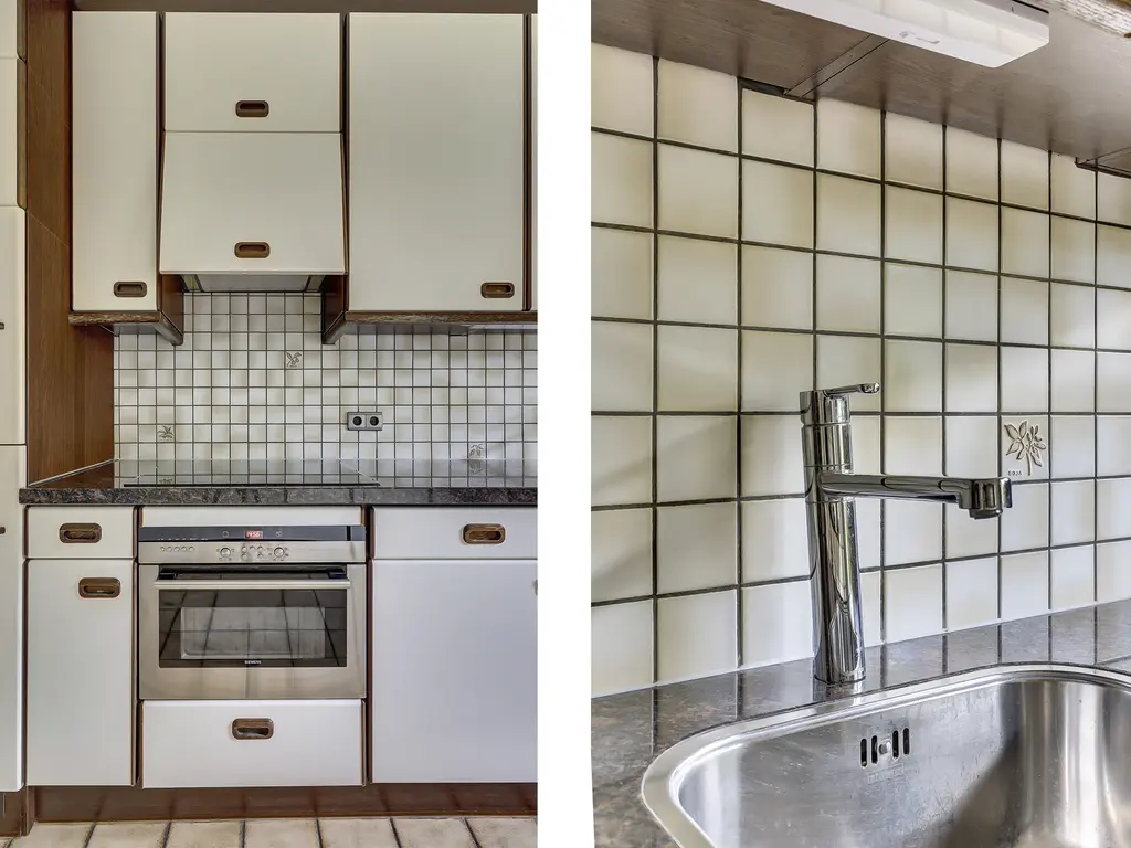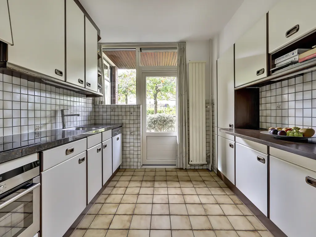 De dichte keuken in dubbele wandopstelling is modern en compleet uitgevoerd met een inductiekookplaat (2018), afzuigkap, vaatwasser (2020), combi-oven (2019) en koel-vriescombinatie (2022). Ook vanuit de keuken is er toegang tot de tuin.