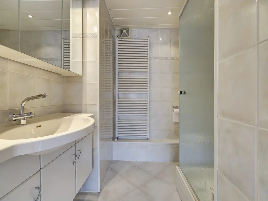1e Verdieping: Ruime overloop met toegang tot de 4 slaapkamers alle v.v. een parketvloer en de hoofdslaapkamer is v.v. een airco. De badkamer is tot bovenaan betegeld en voorzien van een douchecabine, 2e toilet, wastafel met meubel en designradiator. De badkamer wordt vanuit een boiler (2022) op deze verdieping v.v. warmwater.
