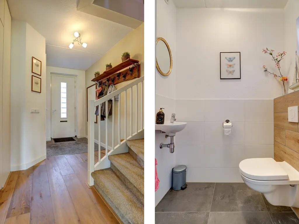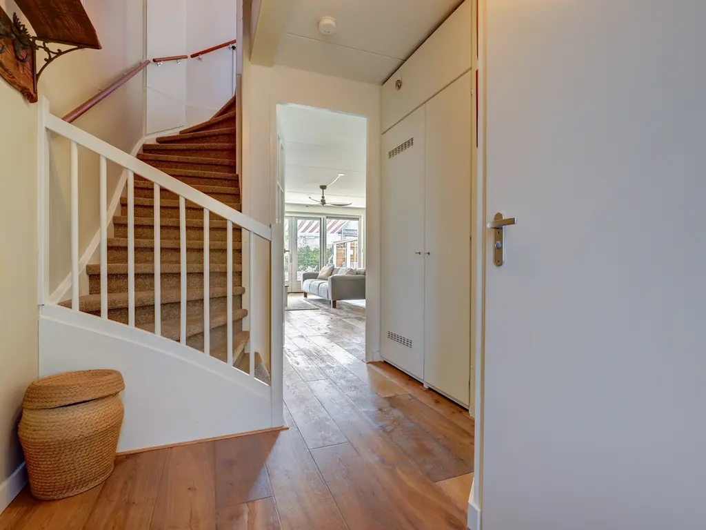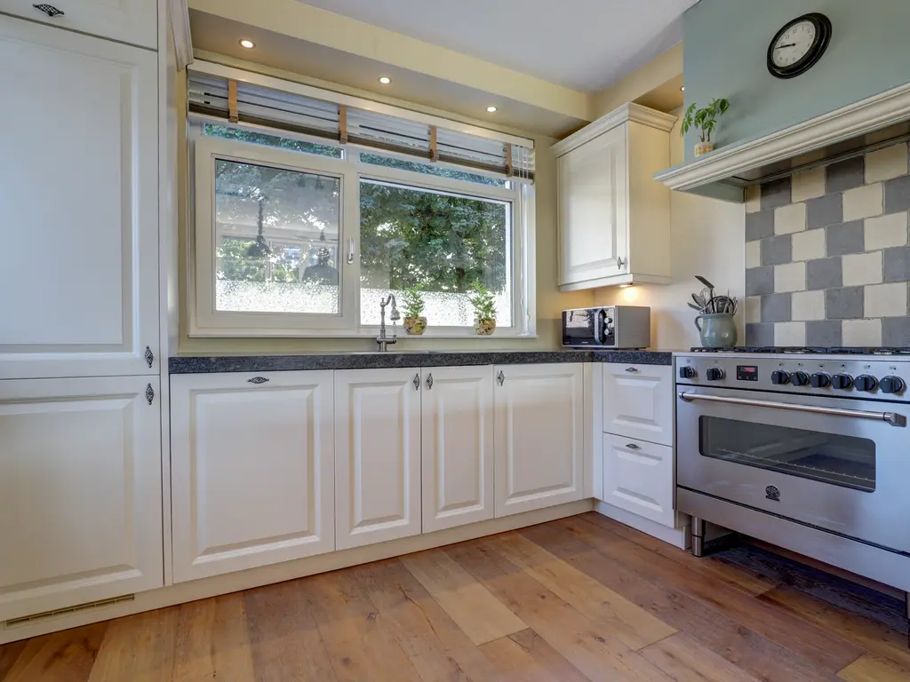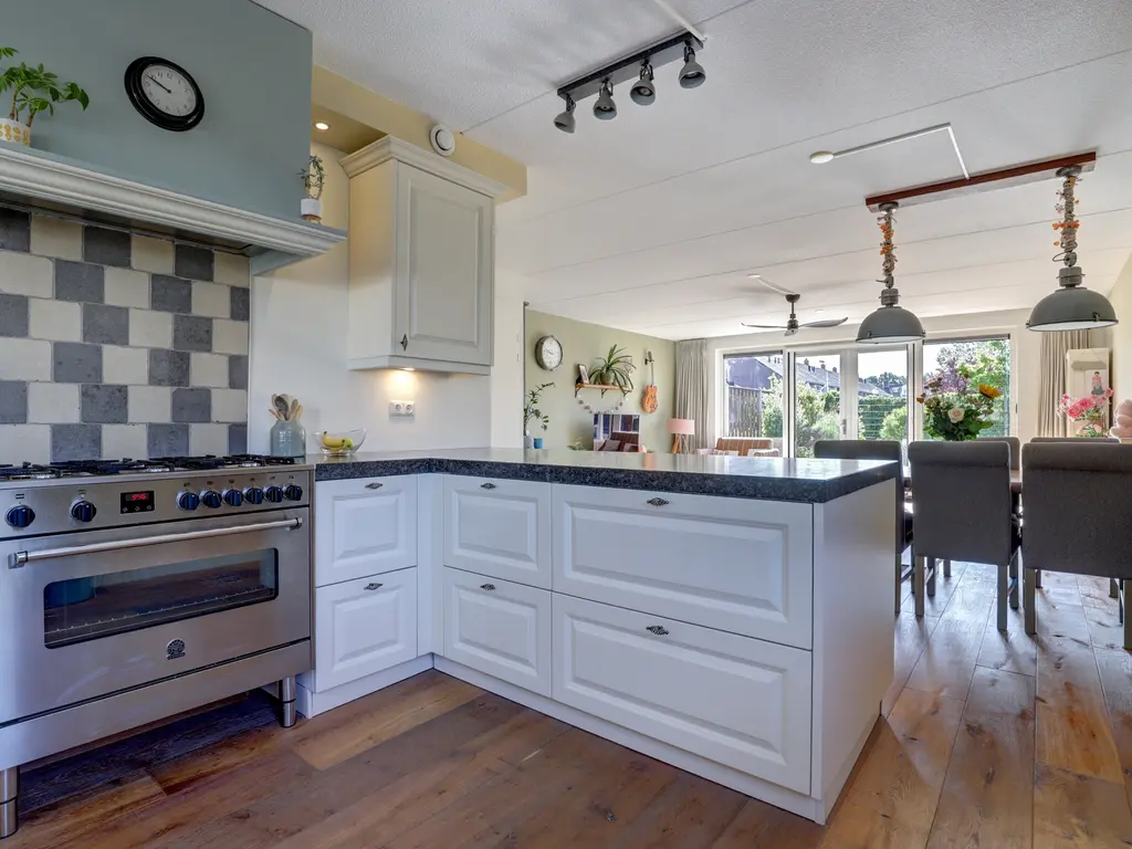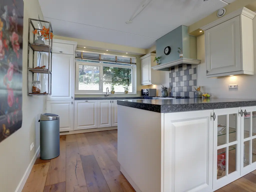 Ruime entree/hal met een warme eikenhouten vloer en strak afgewerkte wanden. Keurig betegelde toiletruimte. Gezellige woonkamer met een uitbouw, eiken vloer, vloerverwarming én een sfeervolle open haard. Luxe open keuken (2017) met inbouwapparatuur zoals een gasfornuis met oven, koel-vriescombinatie, vaatwasser en afzuigkap – ideaal voor kookliefhebbers.