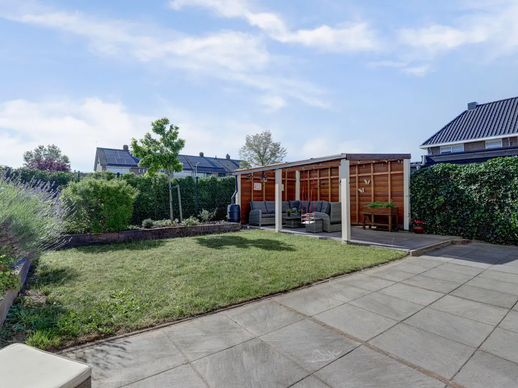 Fraai aangelegde tuin rondom de woning, met de hoofdtuin op het zonnige zuidoosten met een overkapping - ideaal voor lange zomeravonden. Aangebouwde stenen garage met elektra. Eigen parkeerplaats op eigen terrein.