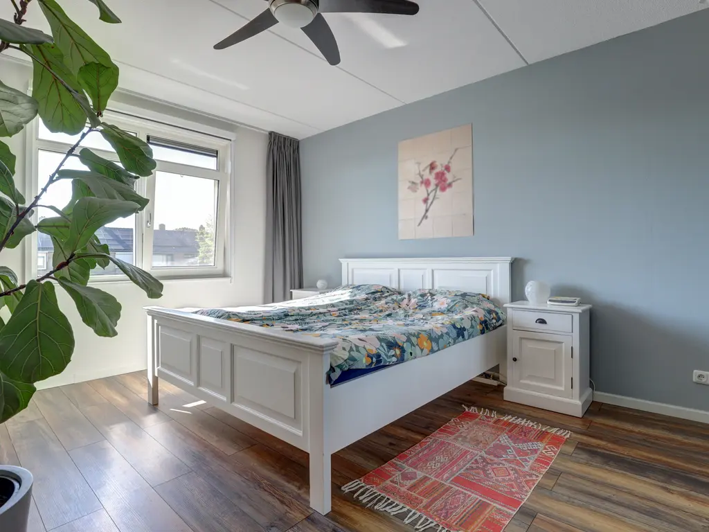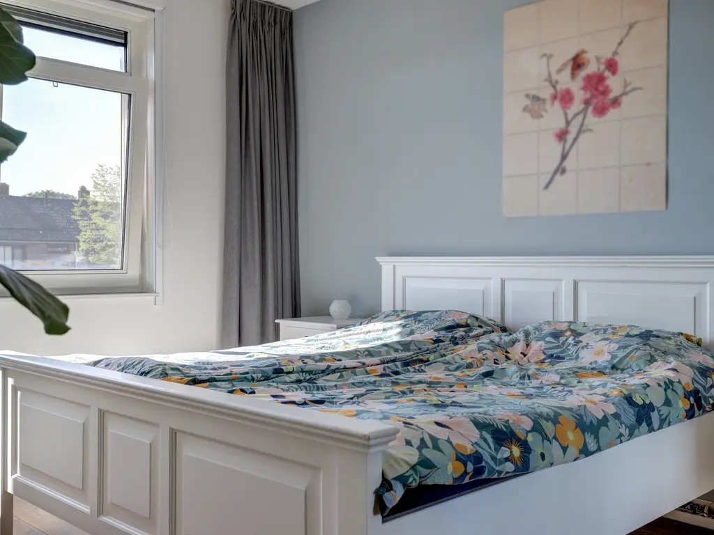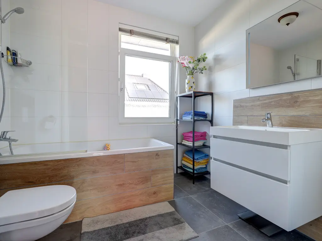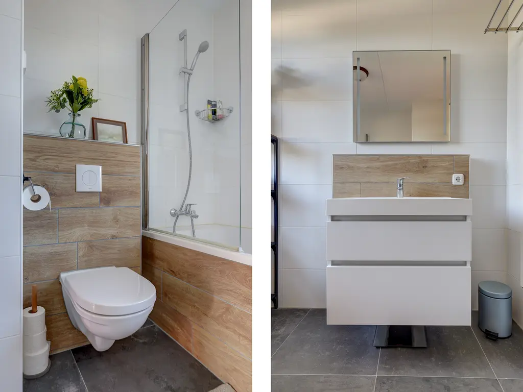 Drie ruime slaapkamers, allemaal voorzien van laminaatvloeren en vloerverwarming. Moderne badkamer (2017) met douche/ligbad, hangend toilet, stijlvol wastafelmeubel en een elektrische designradiator.