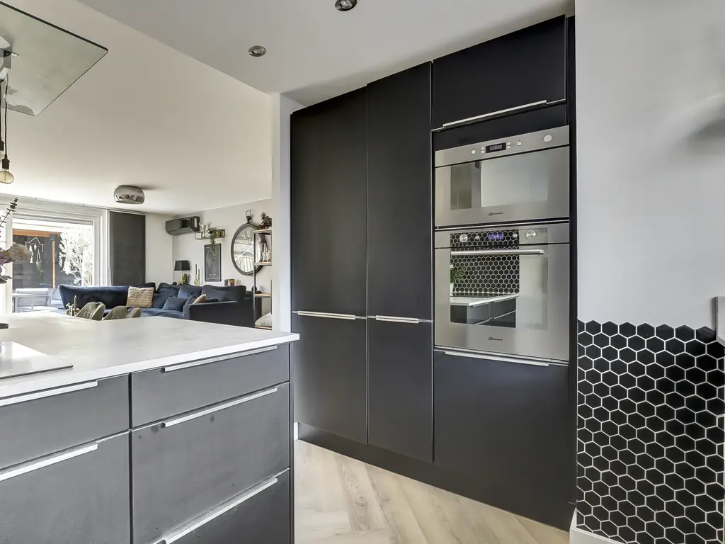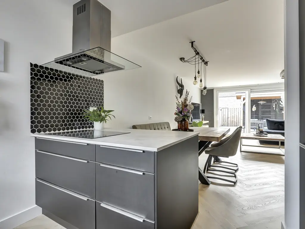 Aan de voorzijde van de woning bevindt zich de moderne keuken met luxe uitstraling. De keuken is uitgevoerd in een hoekopstelling met schiereiland en voorzien van diverse inbouwapparatuur, waaronder een inductiekookplaat, afzuigkap, koelkast met vriesvak, combimagnetron, oven en vaatwasser.