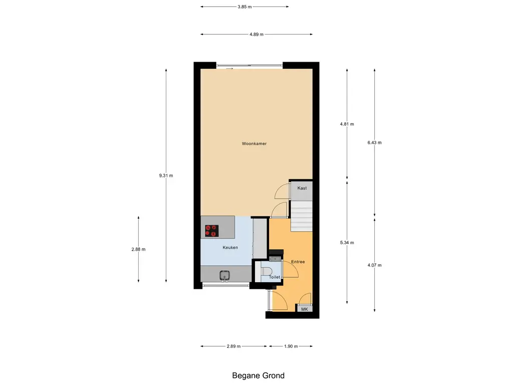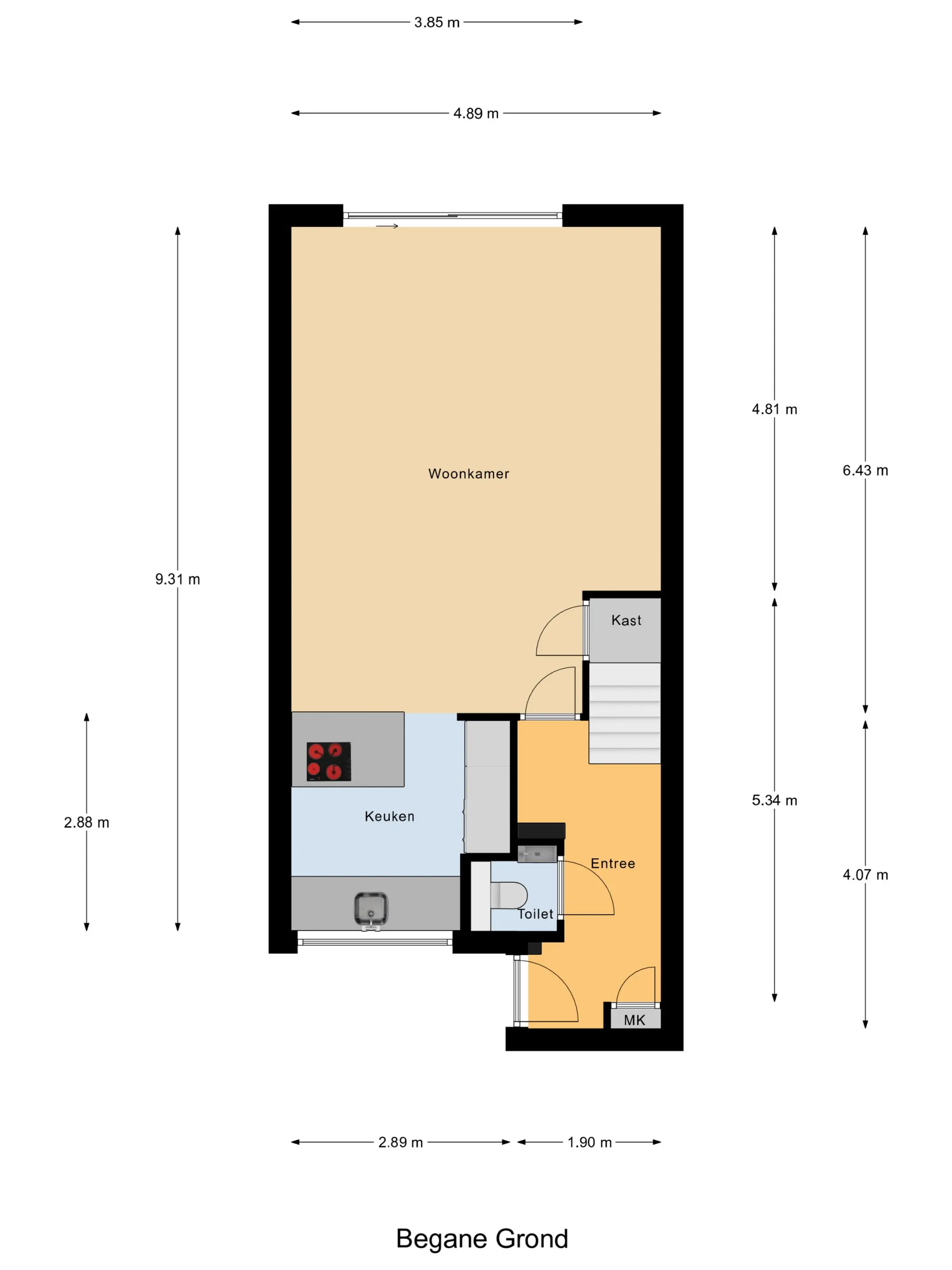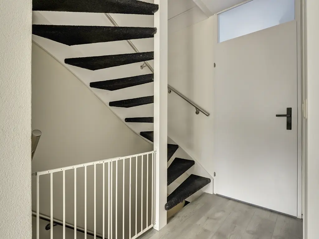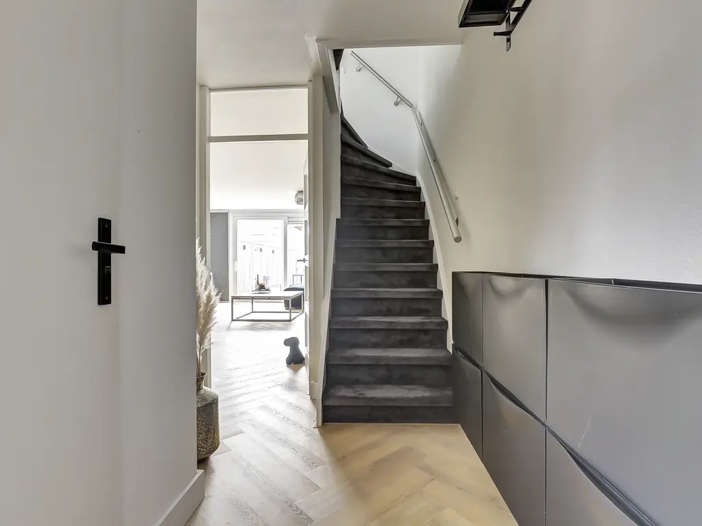 Begane grond: Via de entree met hal, zwevend toilet, meterkast en trapopgang bereikt u de lichte, tuingerichte woonkamer. Hier springen de fraaie PVC visgraatvloer met vloerverwarming en de strak gestuukte wanden direct in het oog. De kunststof schuifpui geeft toegang tot de zonnige, verzorgd aangelegde achtertuin op het zuiden, compleet met stenen berging en achterom.