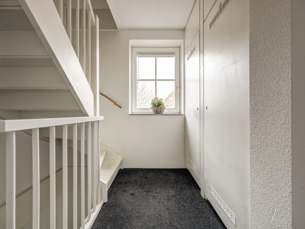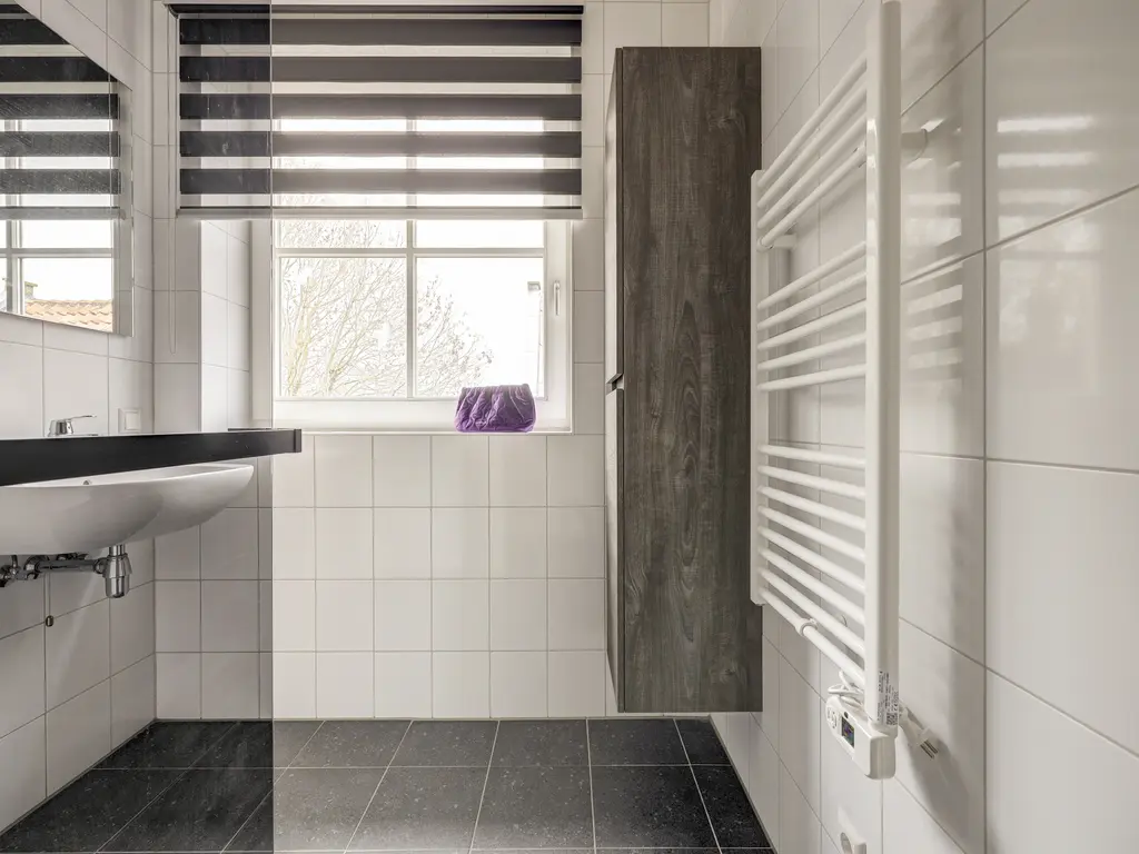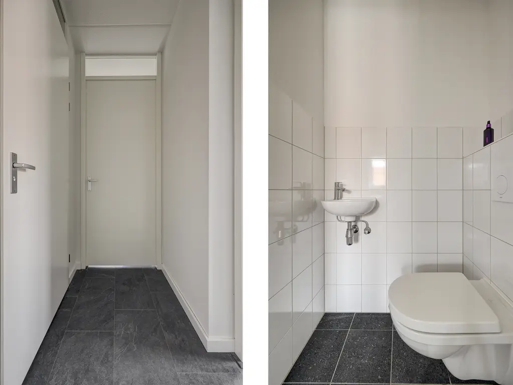 Daarnaast beschikt de woning over een separate technische ruimte met opstelling voor wasmachine en droger, evenals de warmtepomp en het WTW-systeem. Het toilet is modern en zwevend uitgevoerd.