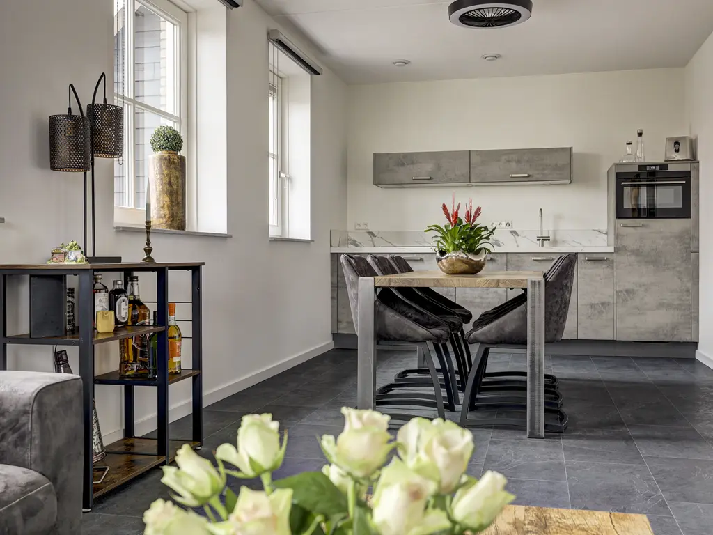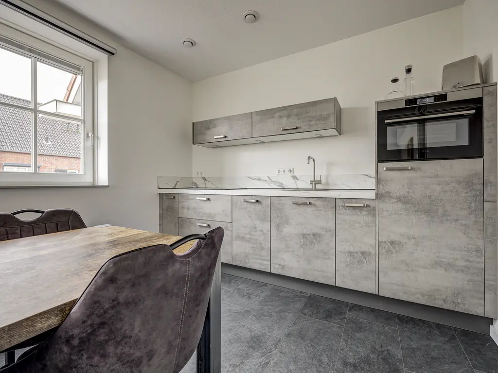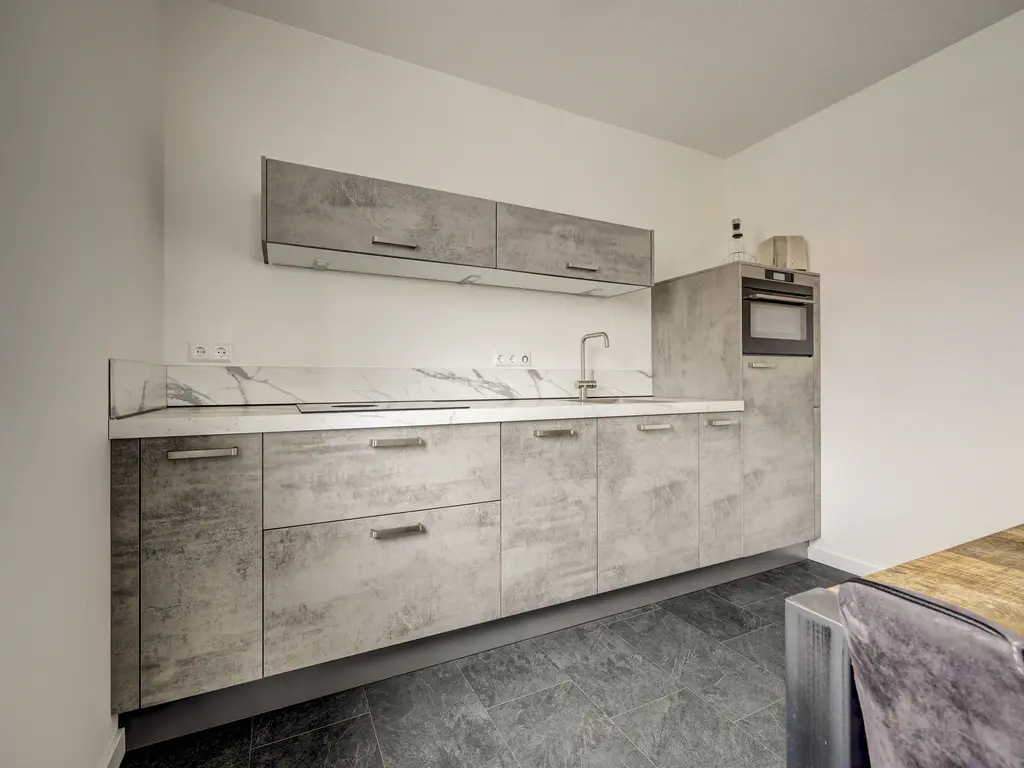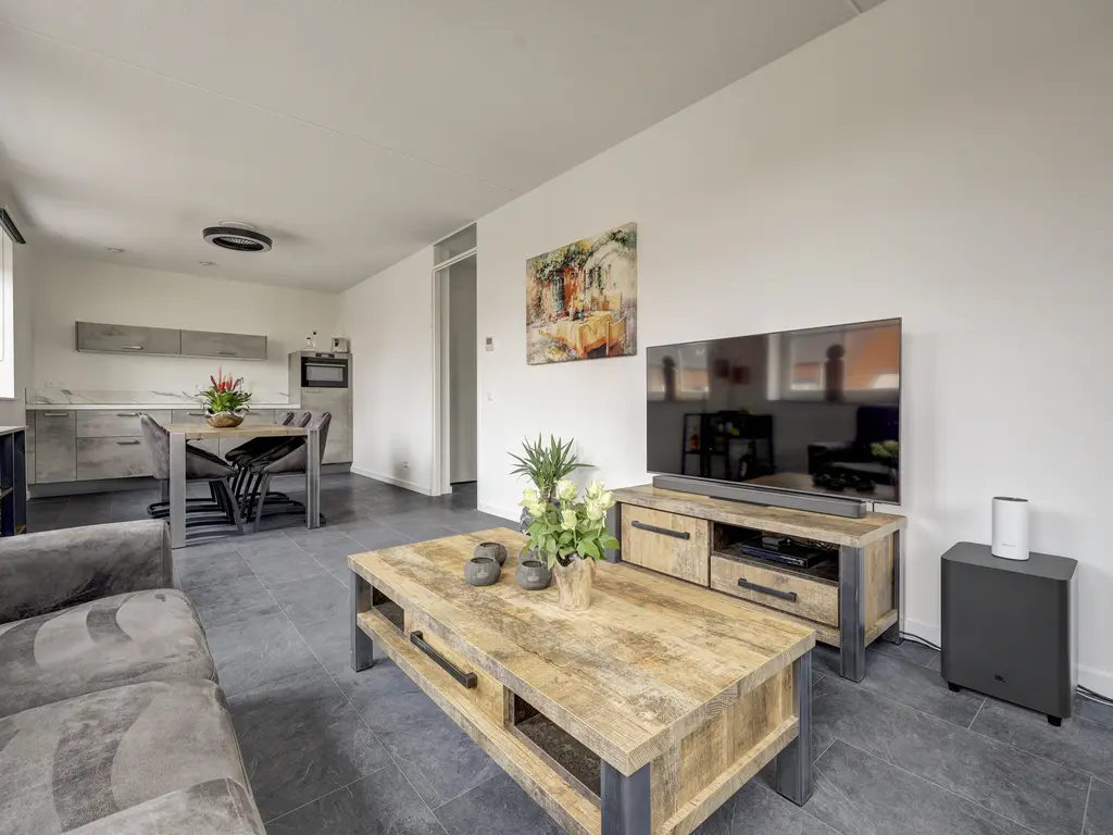 Met een woonoppervlakte van circa 70 m² biedt de woning een comfortabele en praktische indeling. De lichte woonkamer met grote raampartijen zorgt voor een fijne, open sfeer en is strak afgewerkt.De moderne open keuken in wandopstelling is van alle gemakken voorzien, waaronder een vaatwasser, koelkast, combi-oven en een Bora kookplaat met geïntegreerde afzuiging.